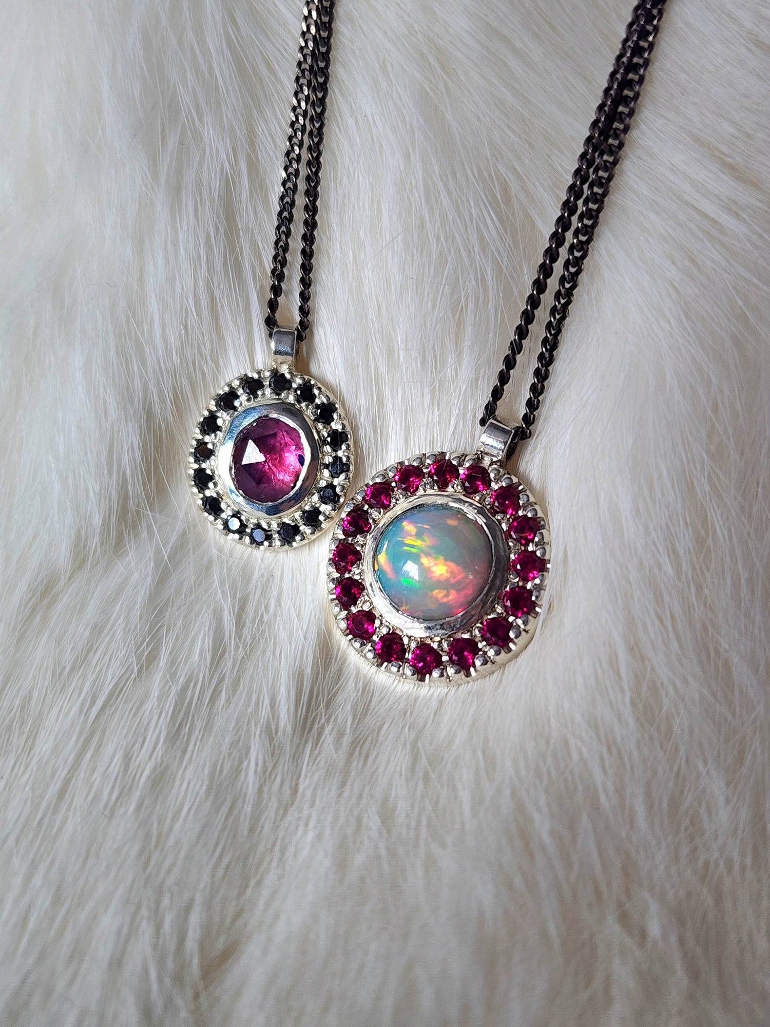 Argentium® Silver Pendant, Natural Opal and Garnet Halo Pendant