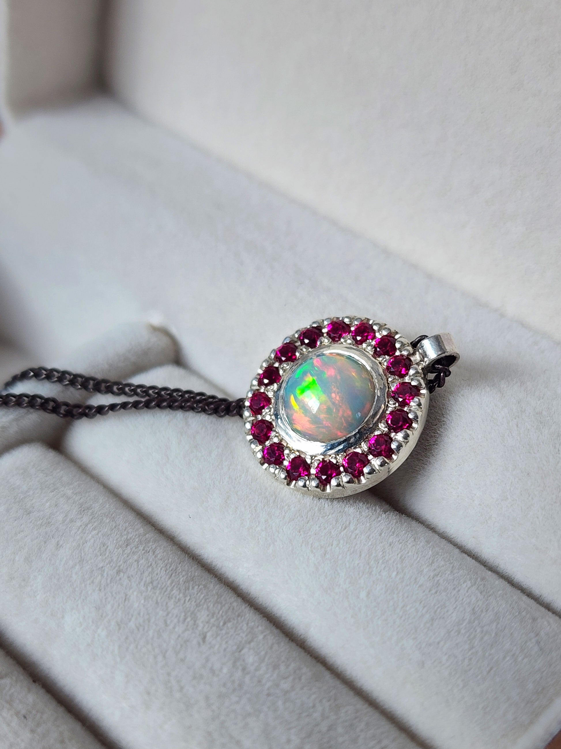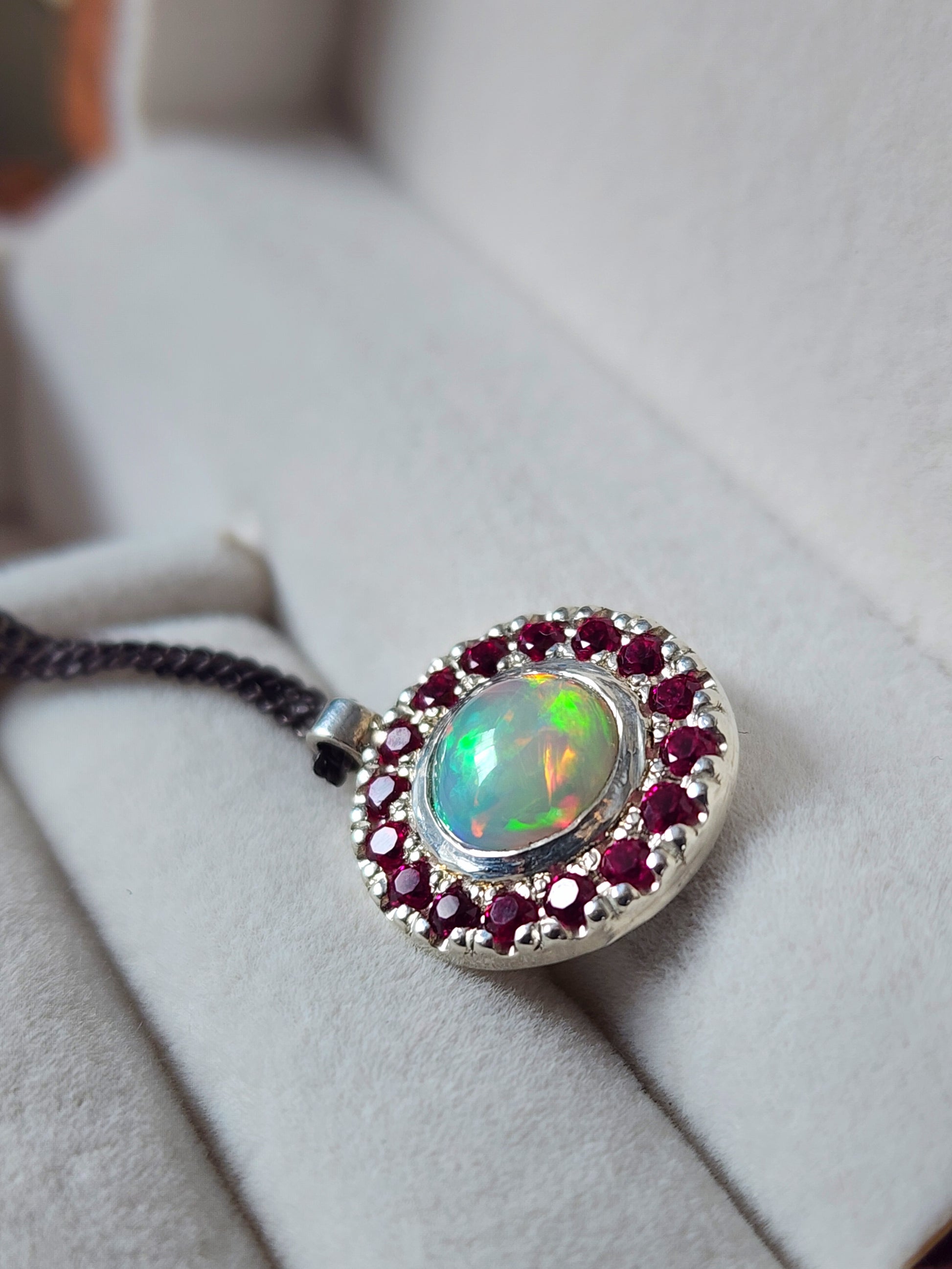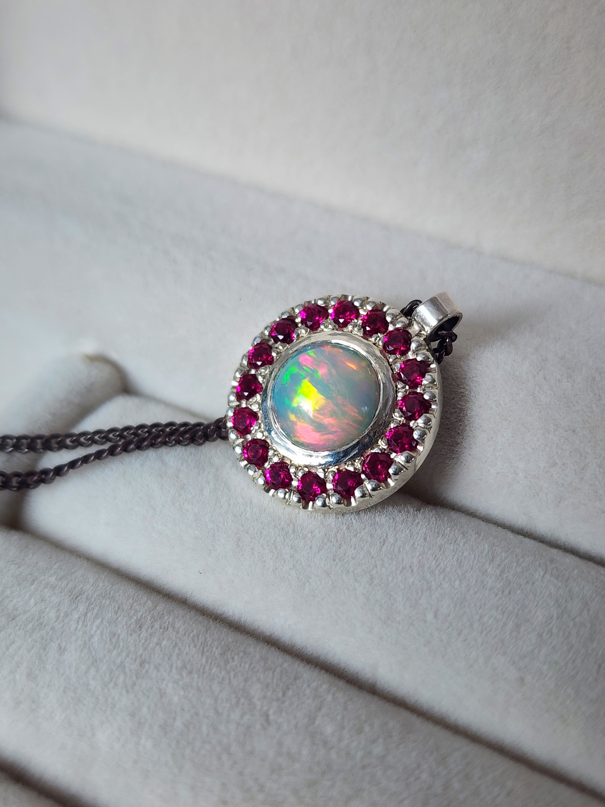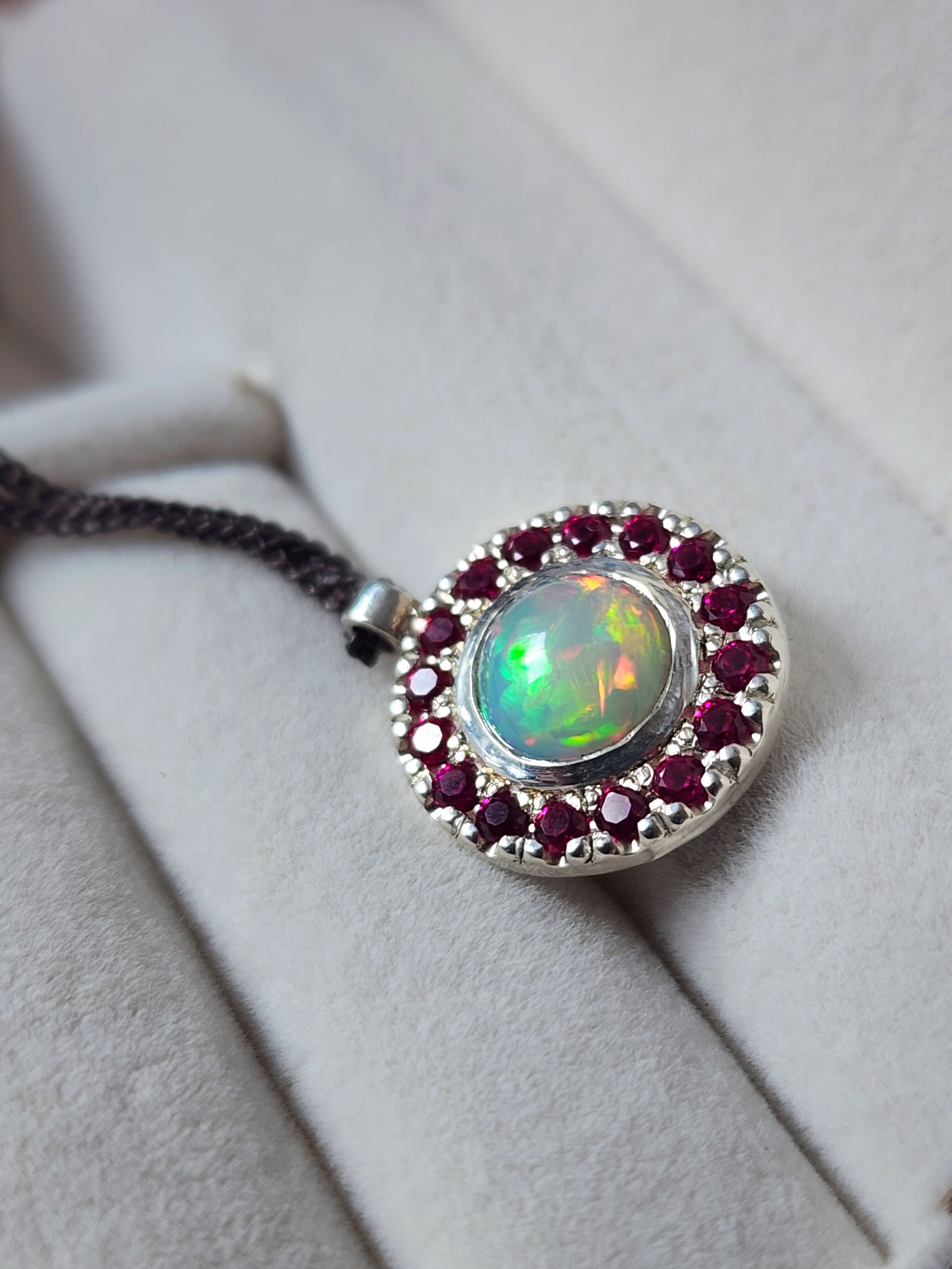 Argentium® Silver Pendant, Natural Opal and Garnet Halo Pendant