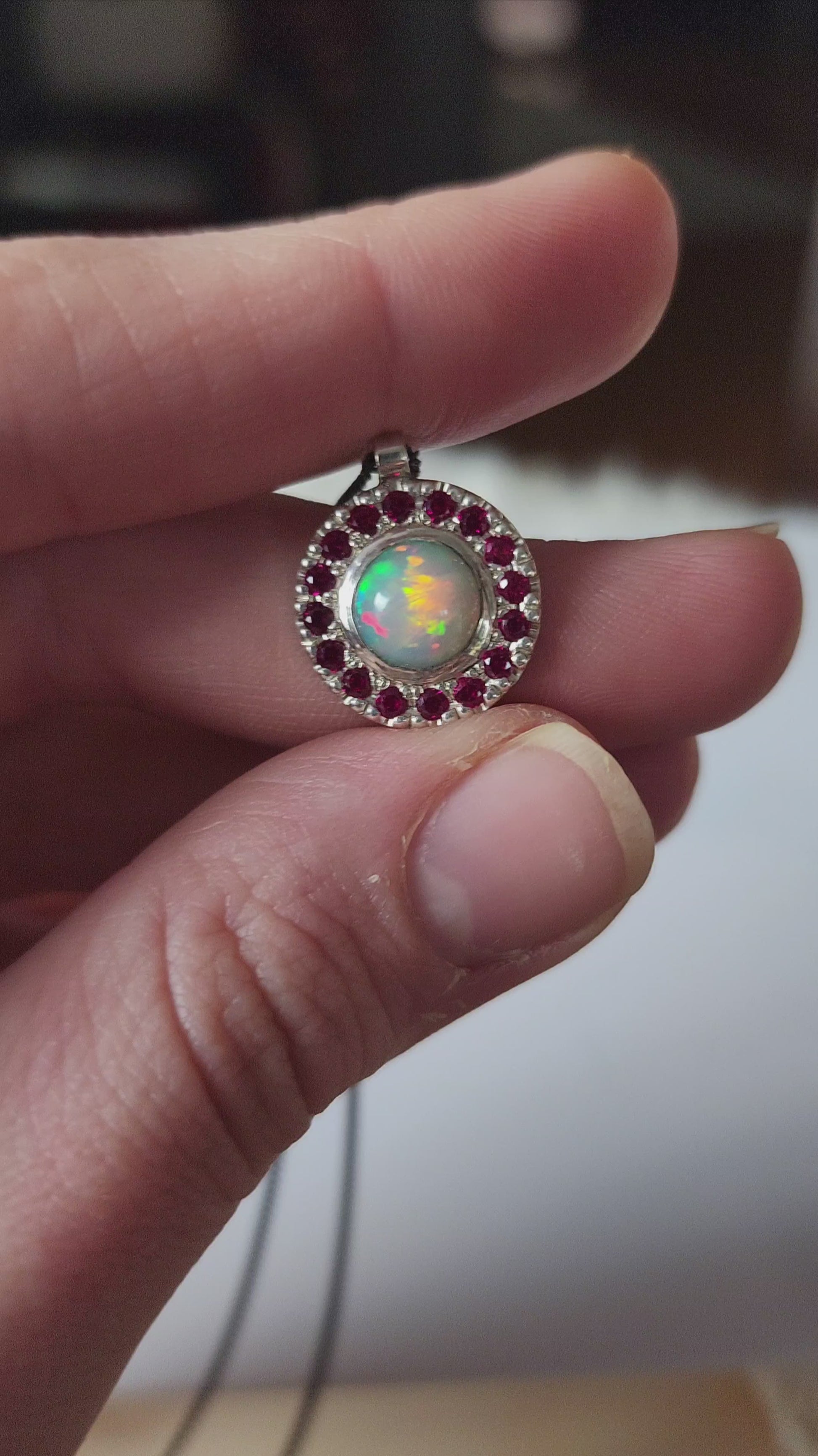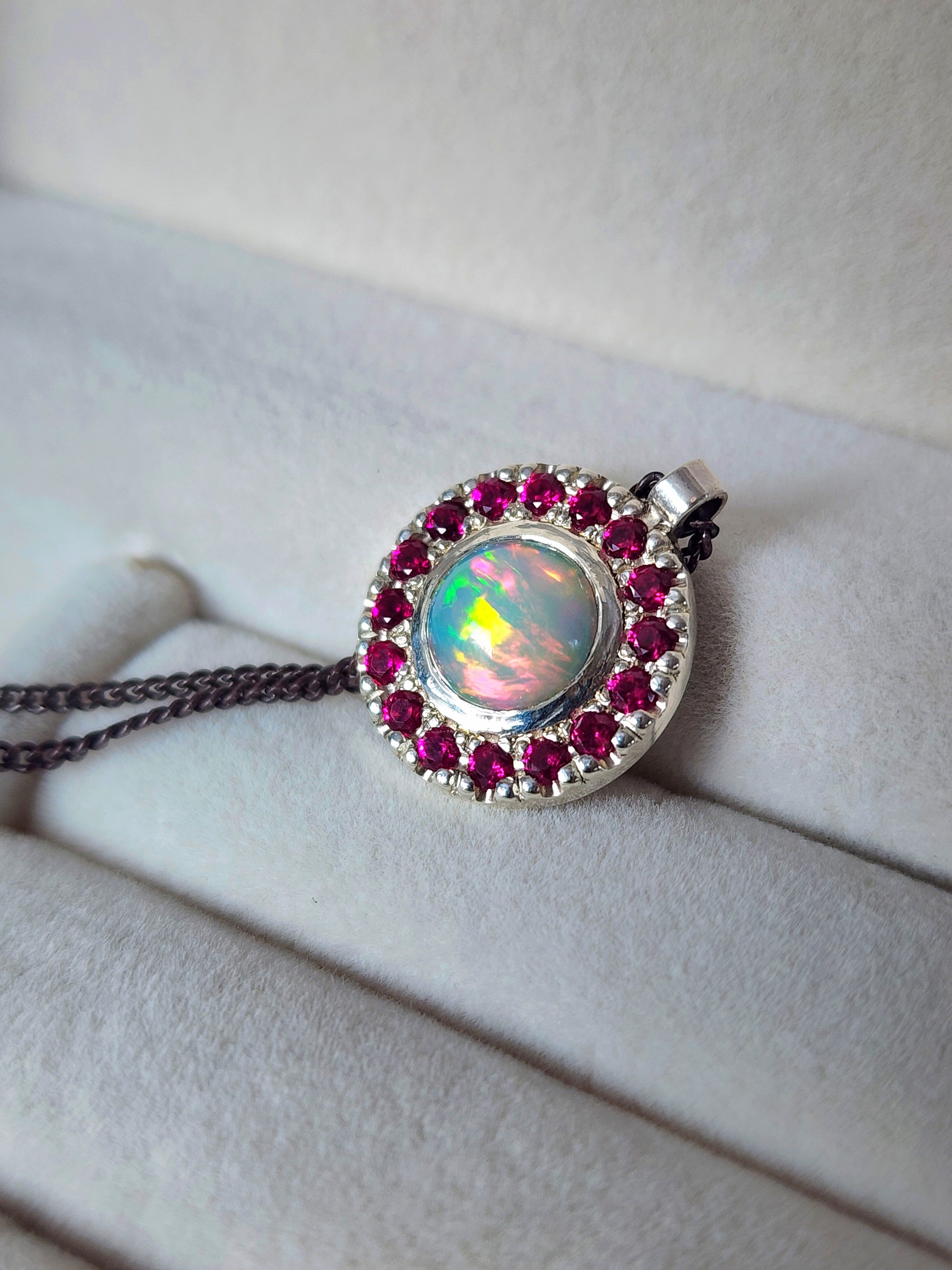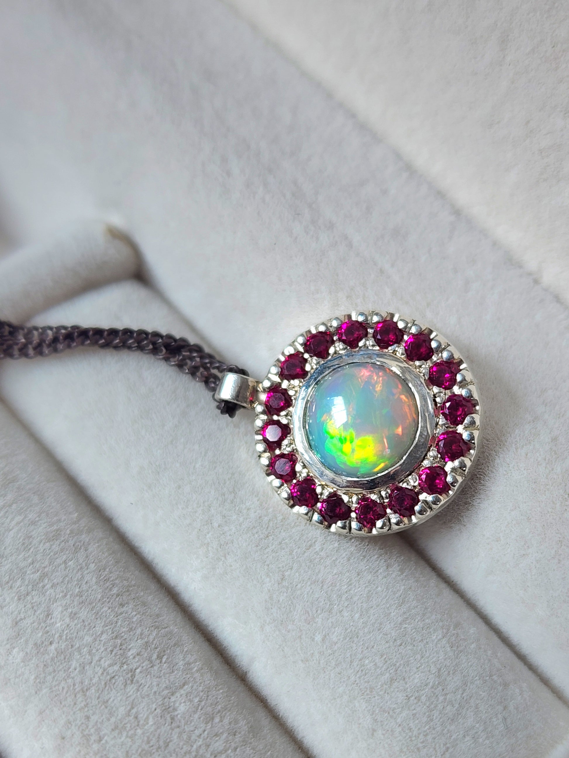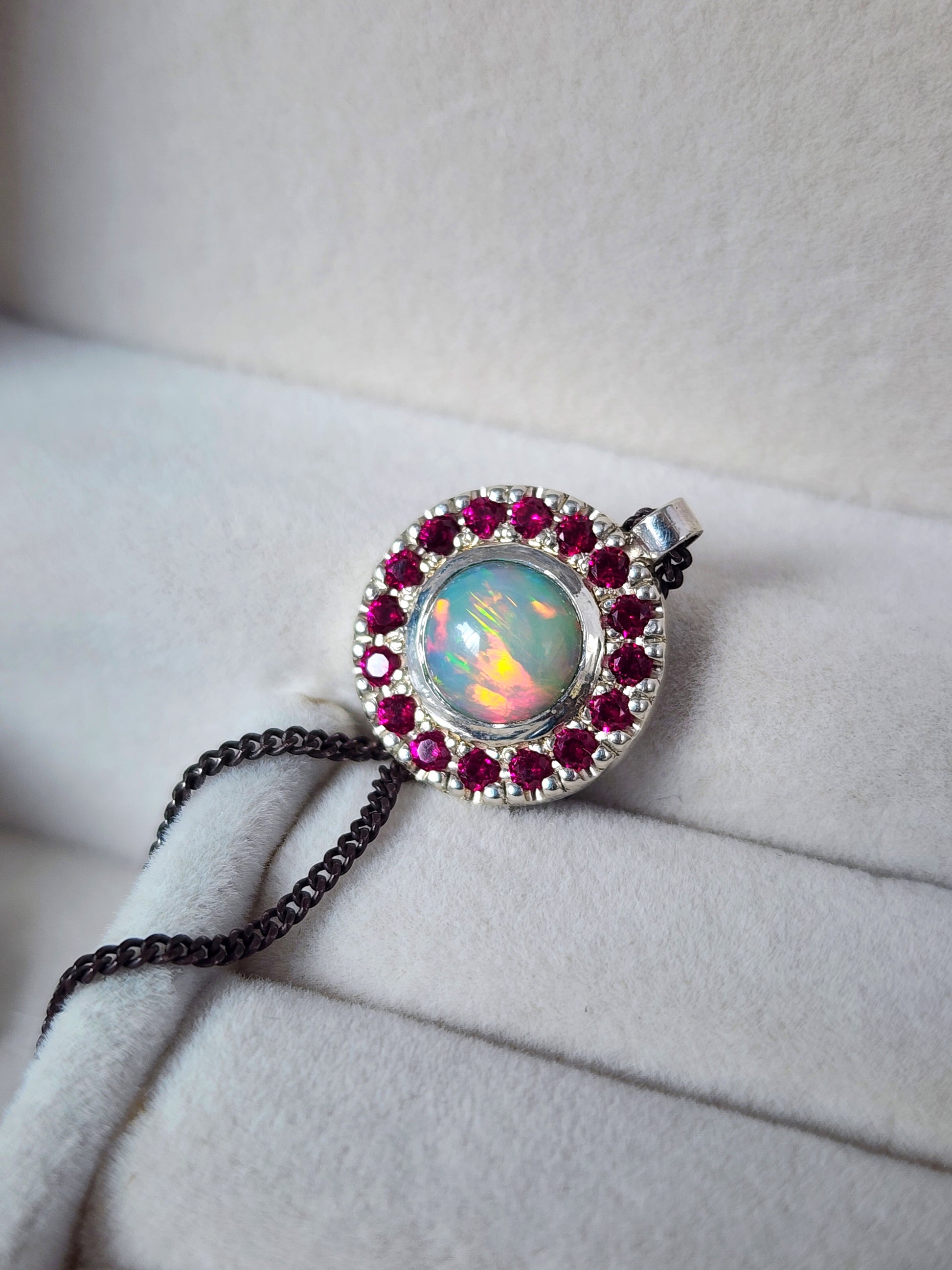 Argentium® Silver Pendant, Natural Opal and Garnet Halo Pendant