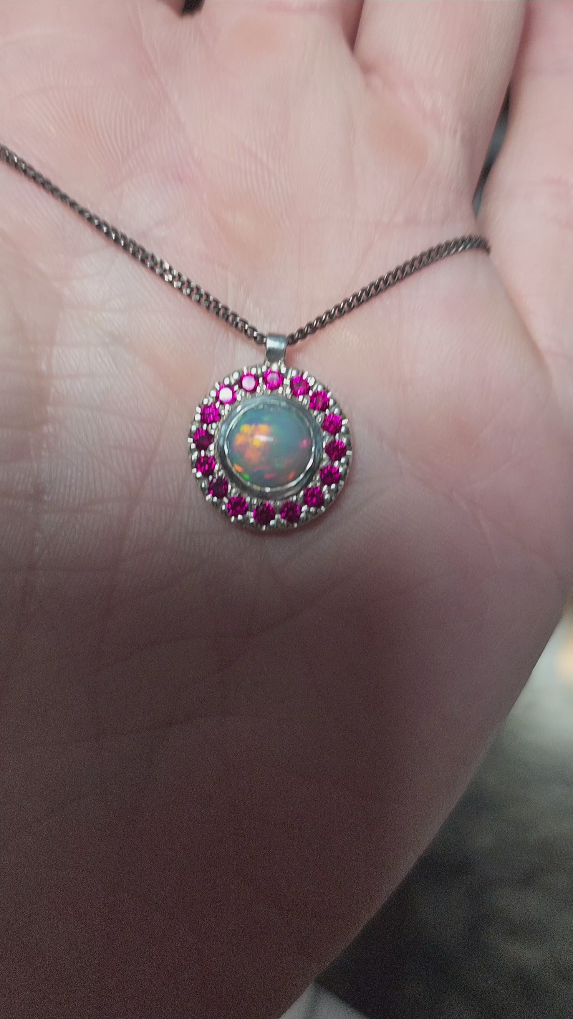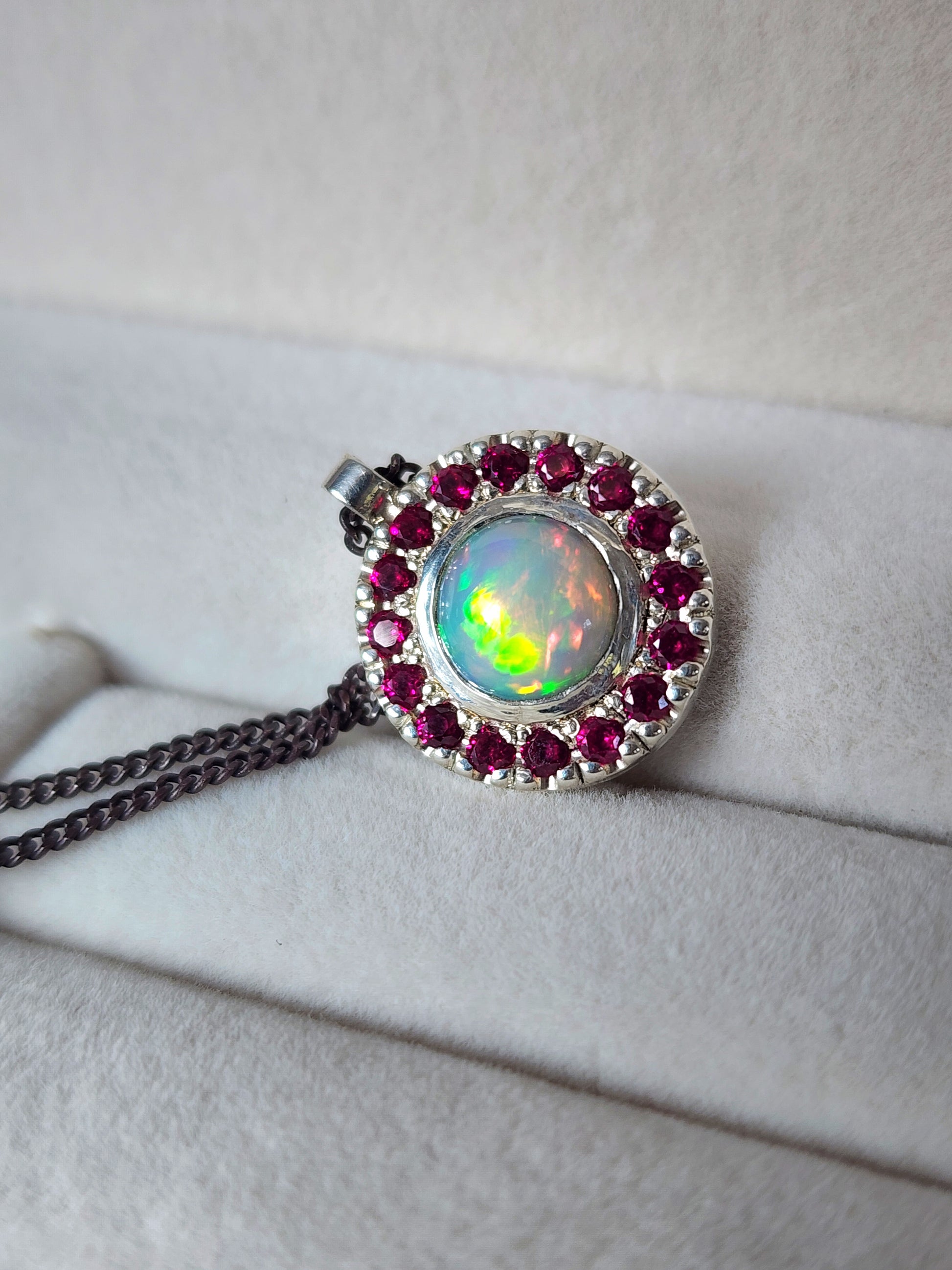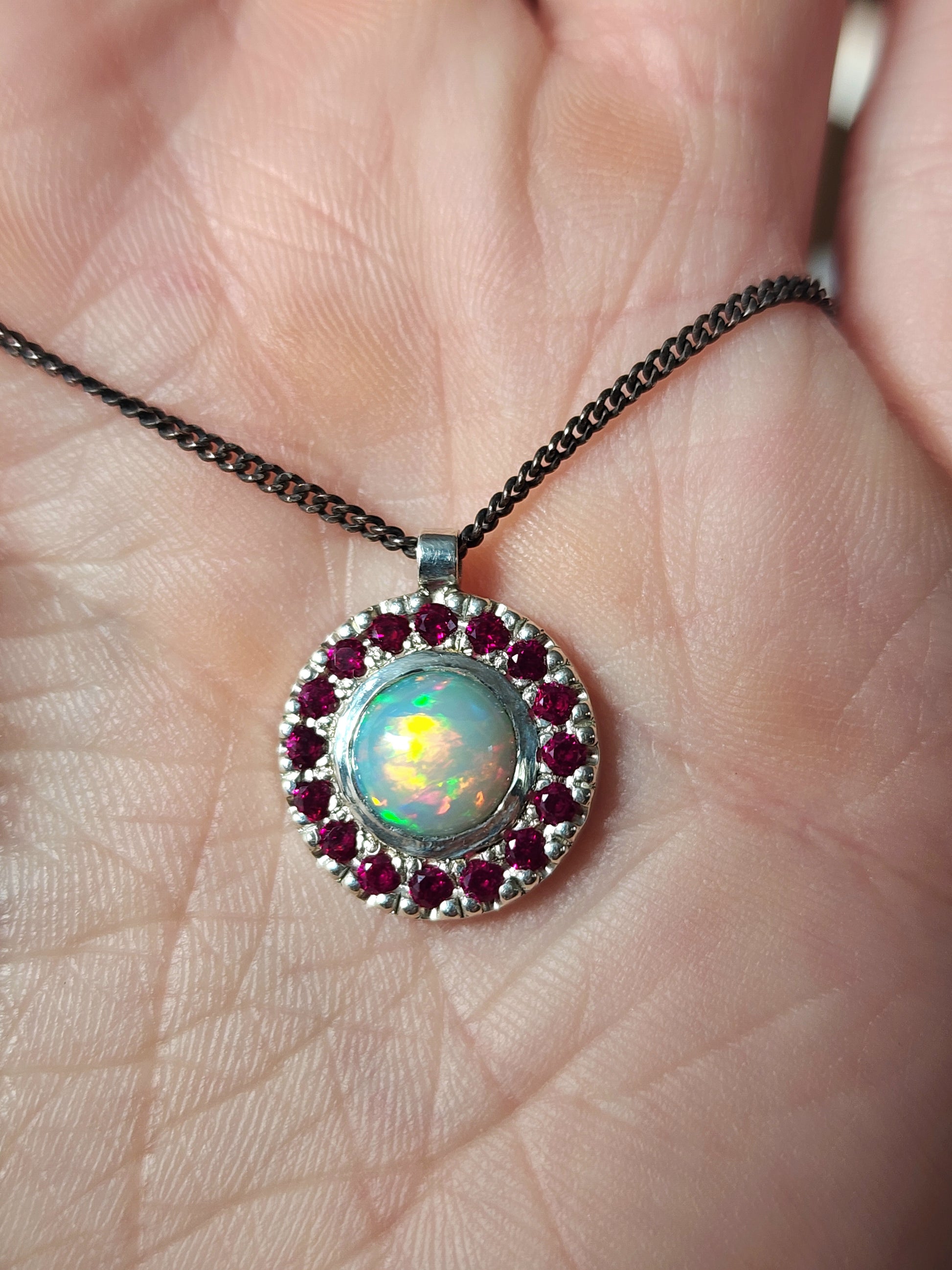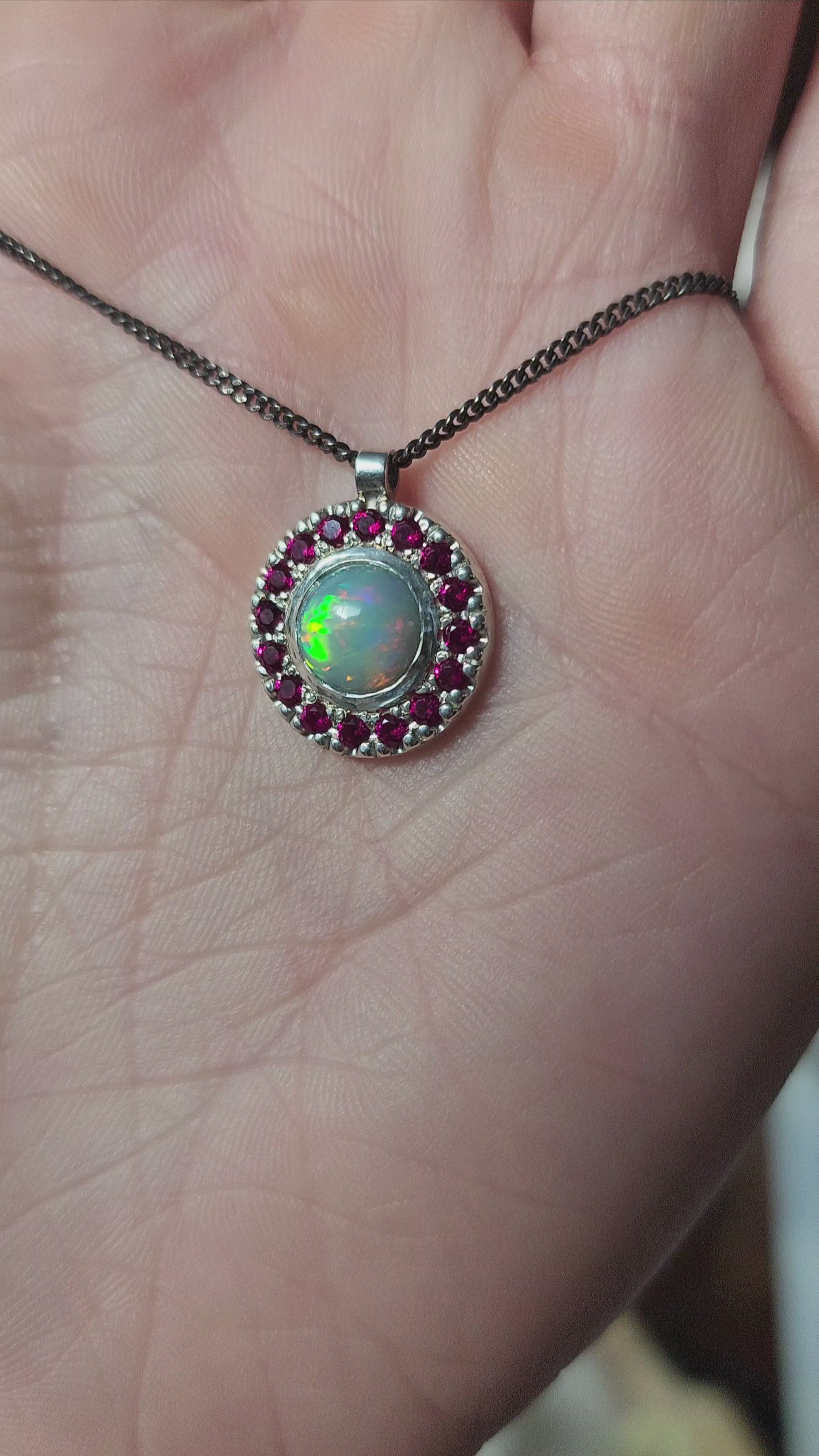 Stunning Ethiopian Welo opal in tarnish resistant Argentium silver, surrounded by one of my favorite garnet imitation stones. The opal is approximately 8mm in diameter, and is surrounded by 16, 2mm faceted garnet gemstones, all made and set by me.