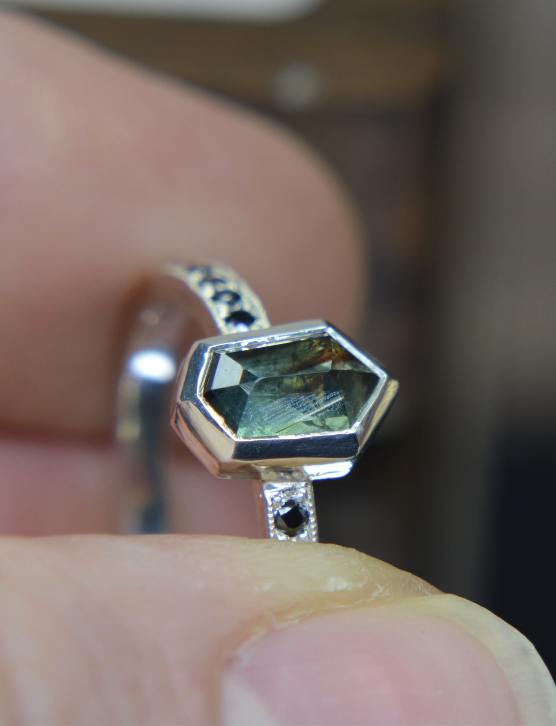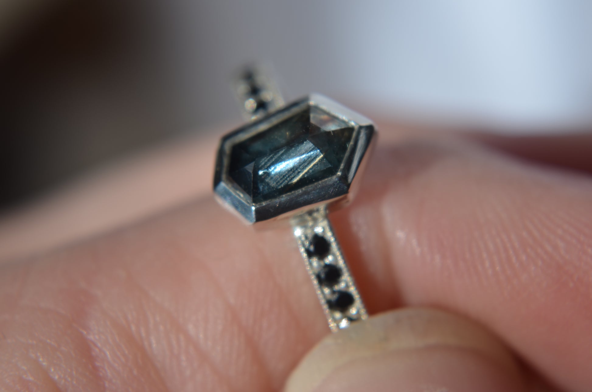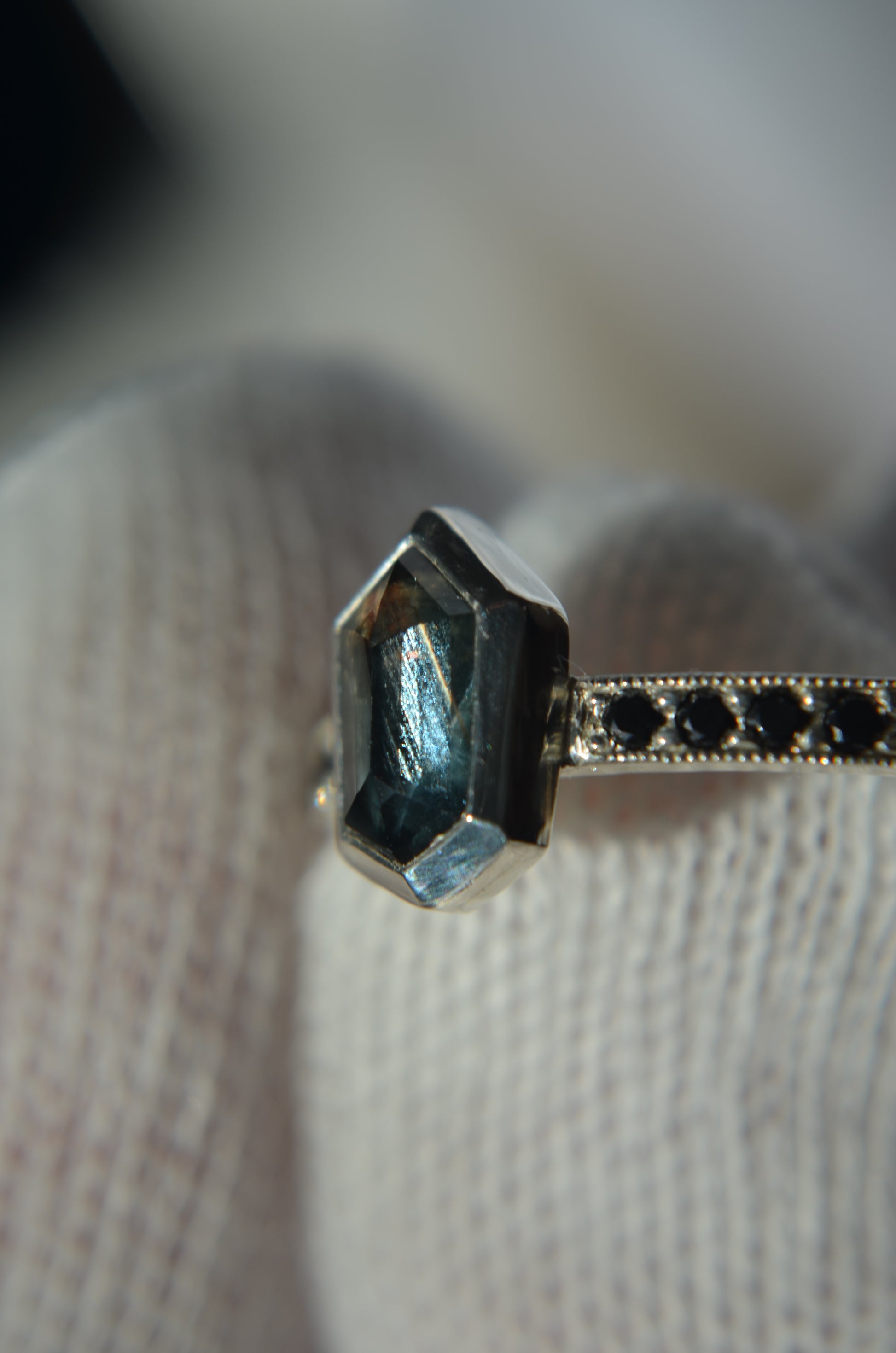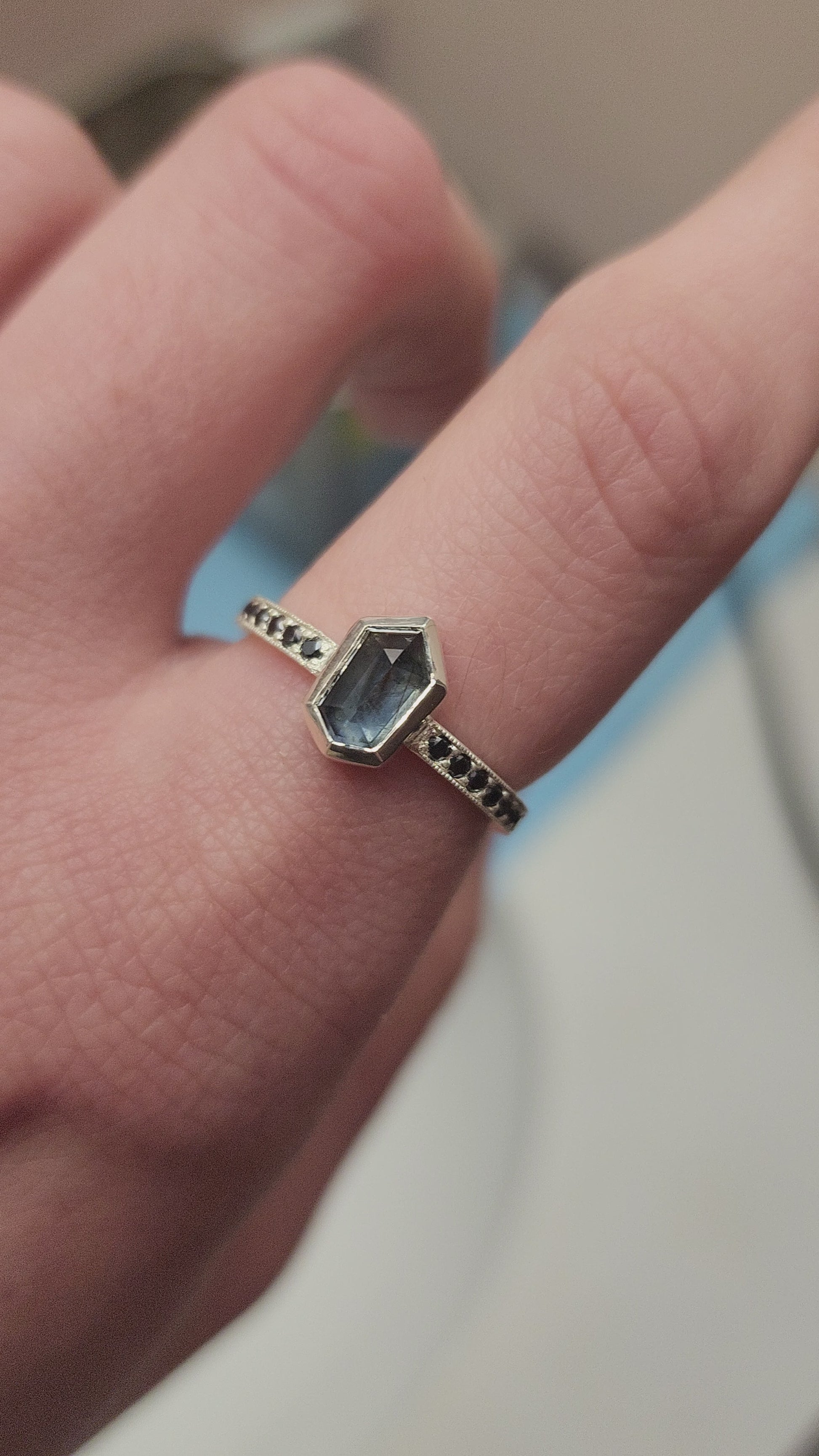 Besides this ring being made in tarnish resistant Argentium silver, having accent stones on each side set in pave style with milgrain, the most exciting aspect I would say is the sapphire itself. Over 1ct, natural sapphire from Madagascar, with schiller effect looking like silk at an angle, it also changes colors from green to blue, depending on the type of light.