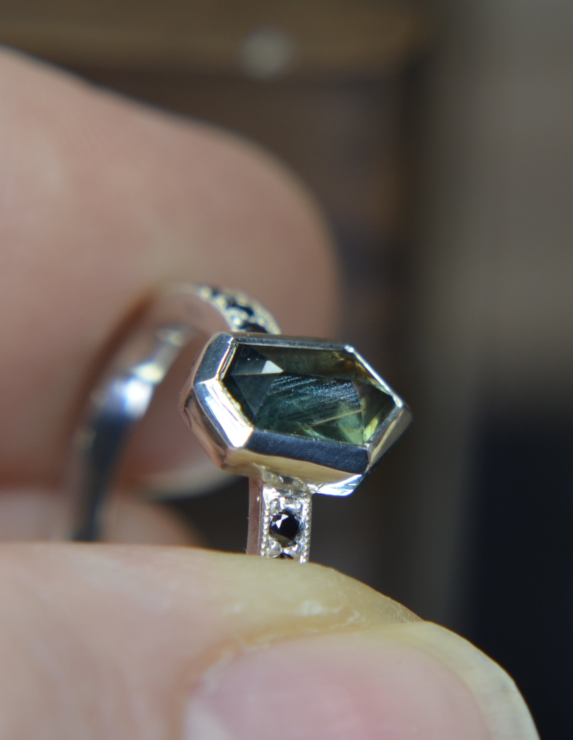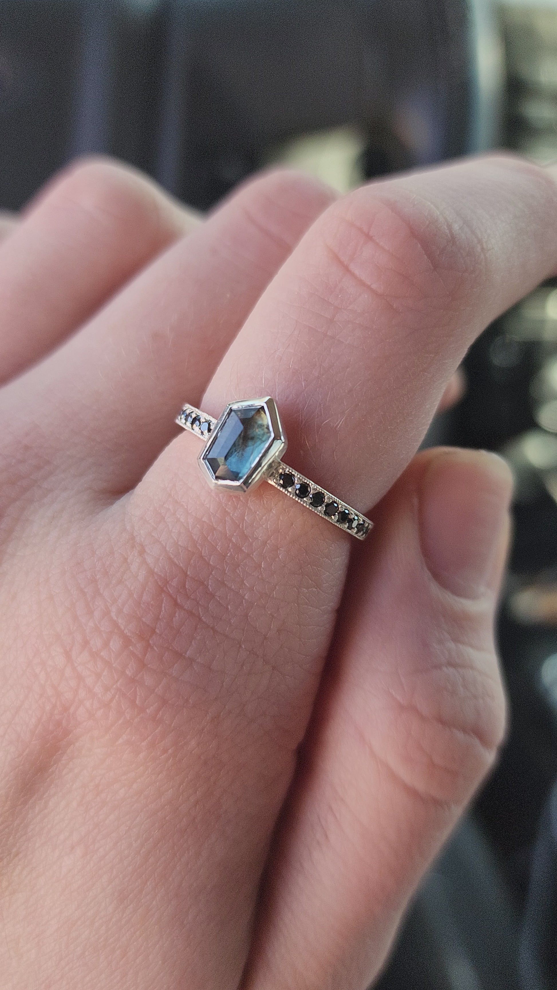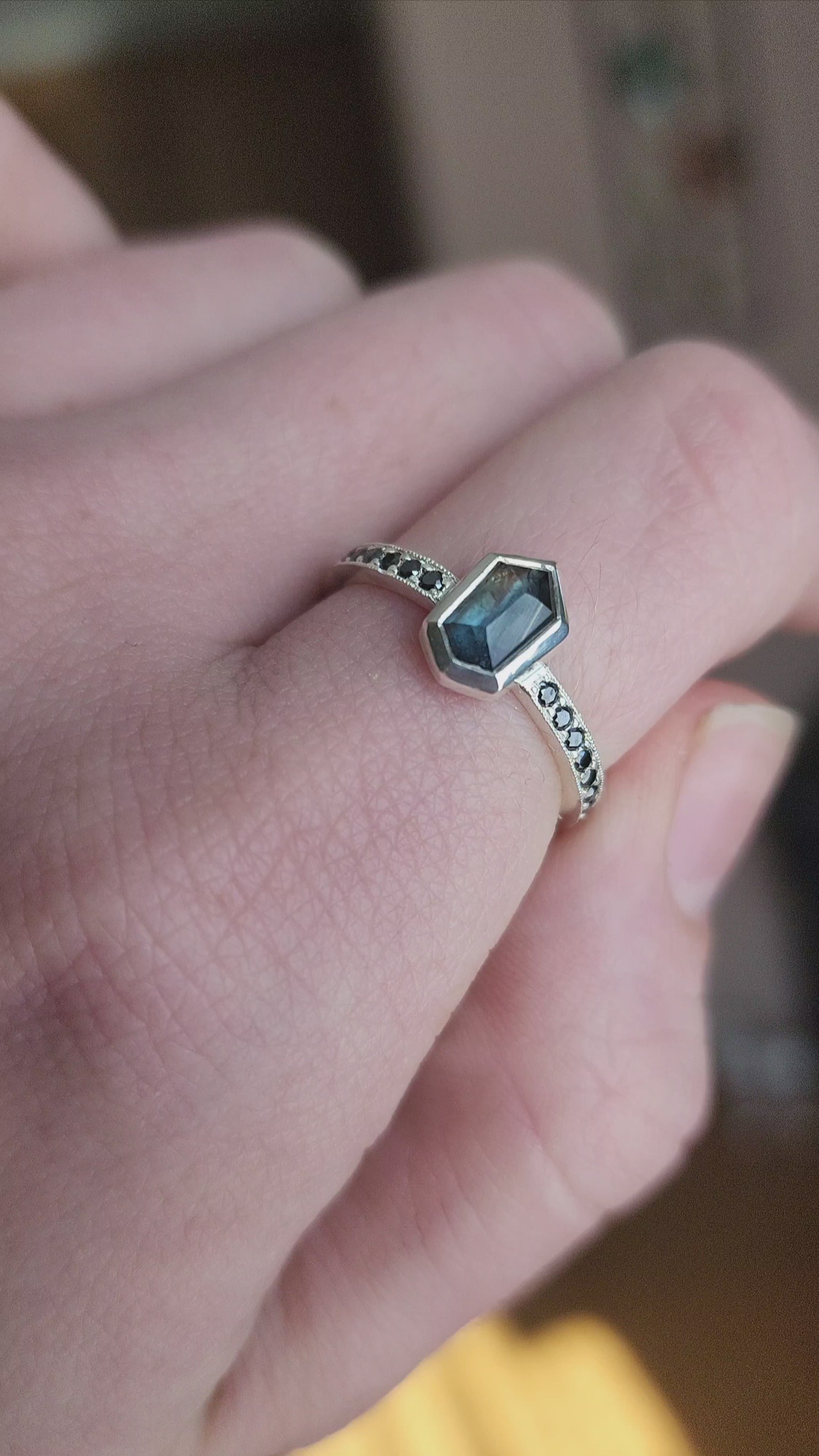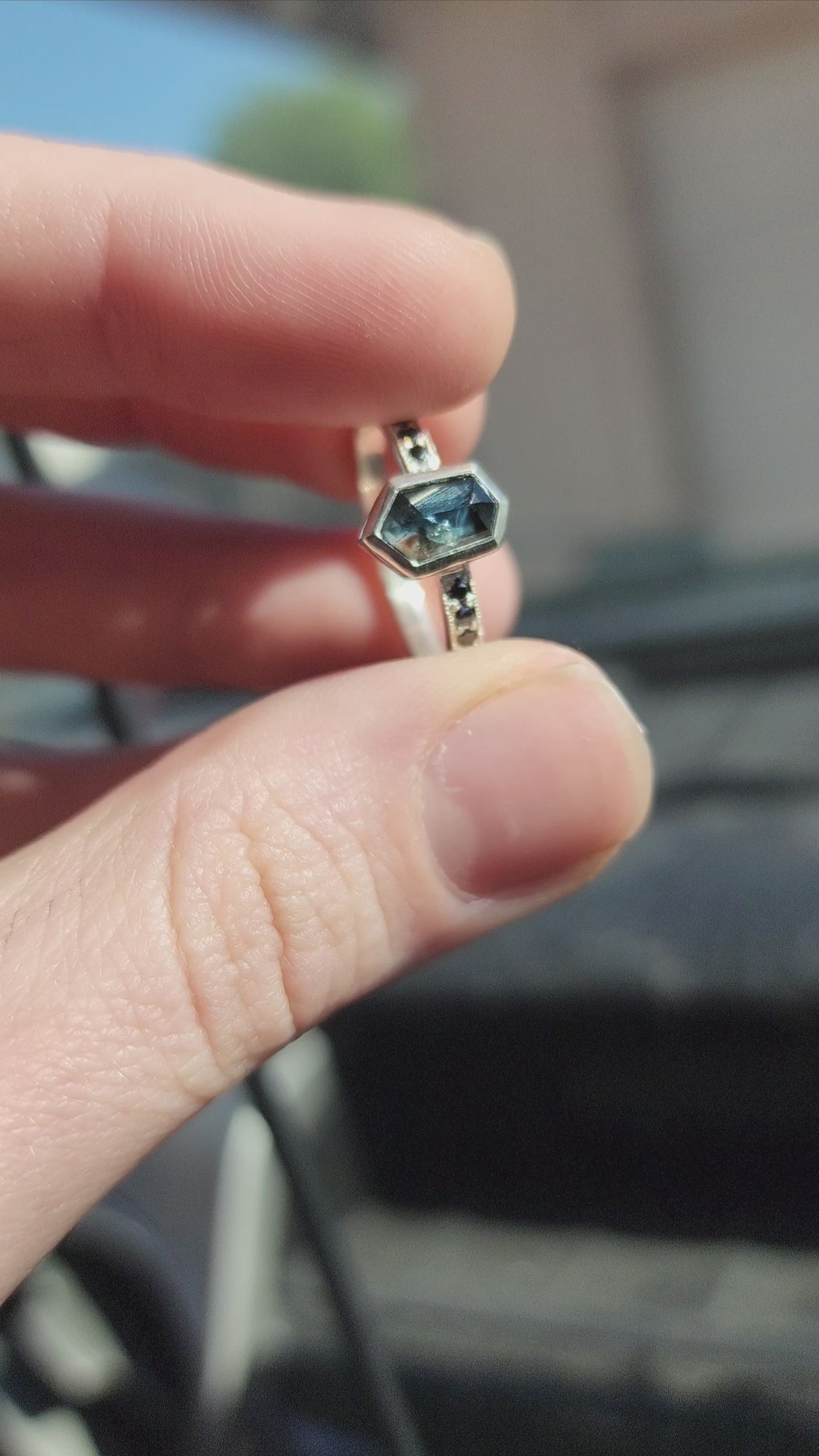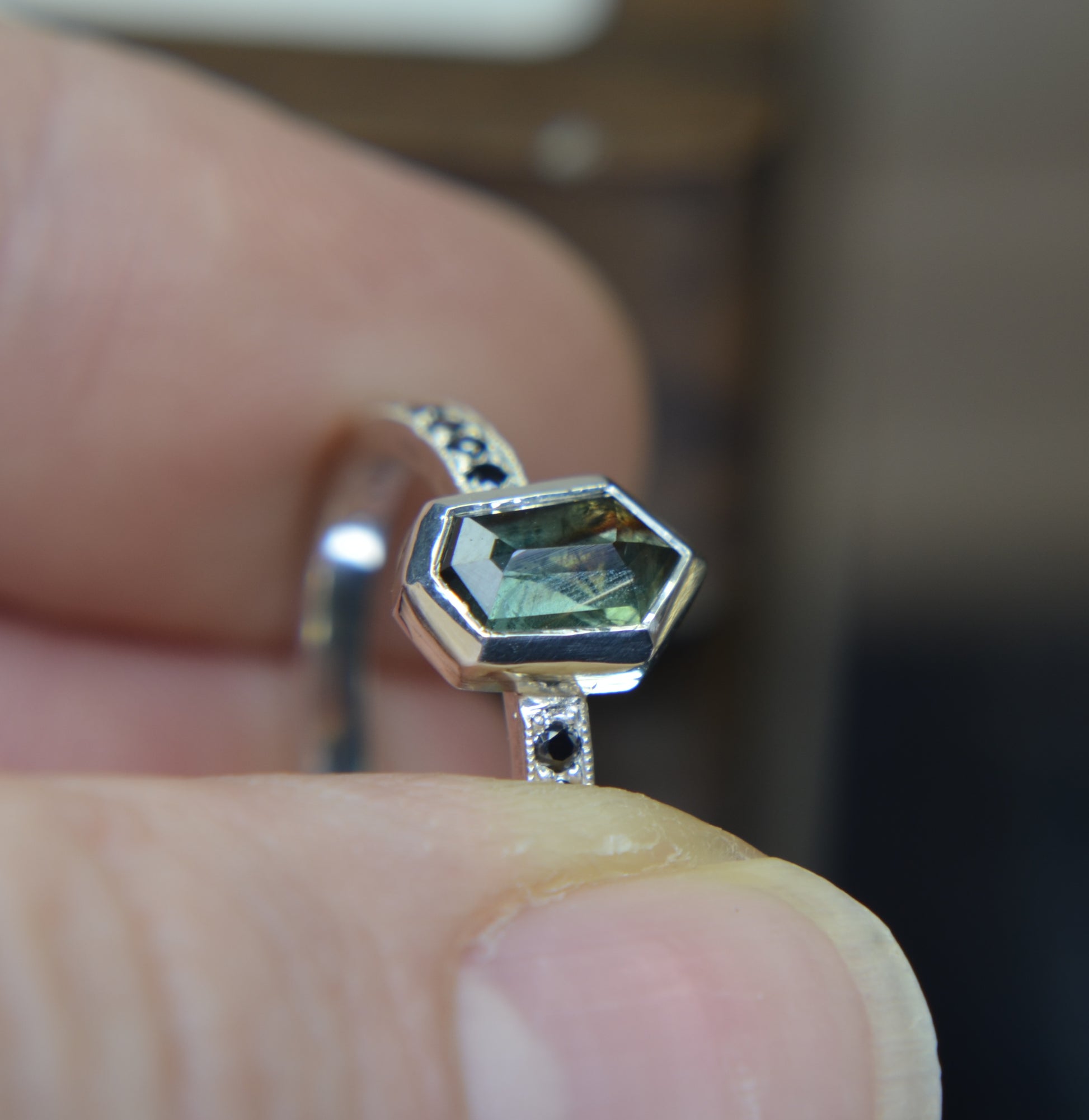 Besides this ring being made in tarnish resistant Argentium silver, having accent stones on each side set in pave style with milgrain, the most exciting aspect I would say is the sapphire itself. Over 1ct, natural sapphire from Madagascar, with schiller effect looking like silk at an angle, it also changes colors from green to blue, depending on the type of light.