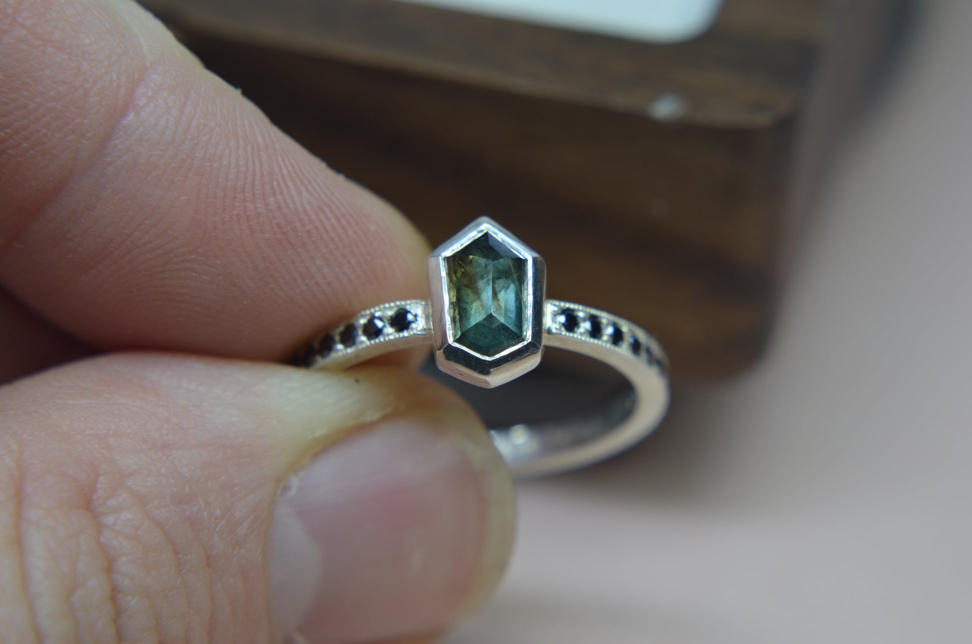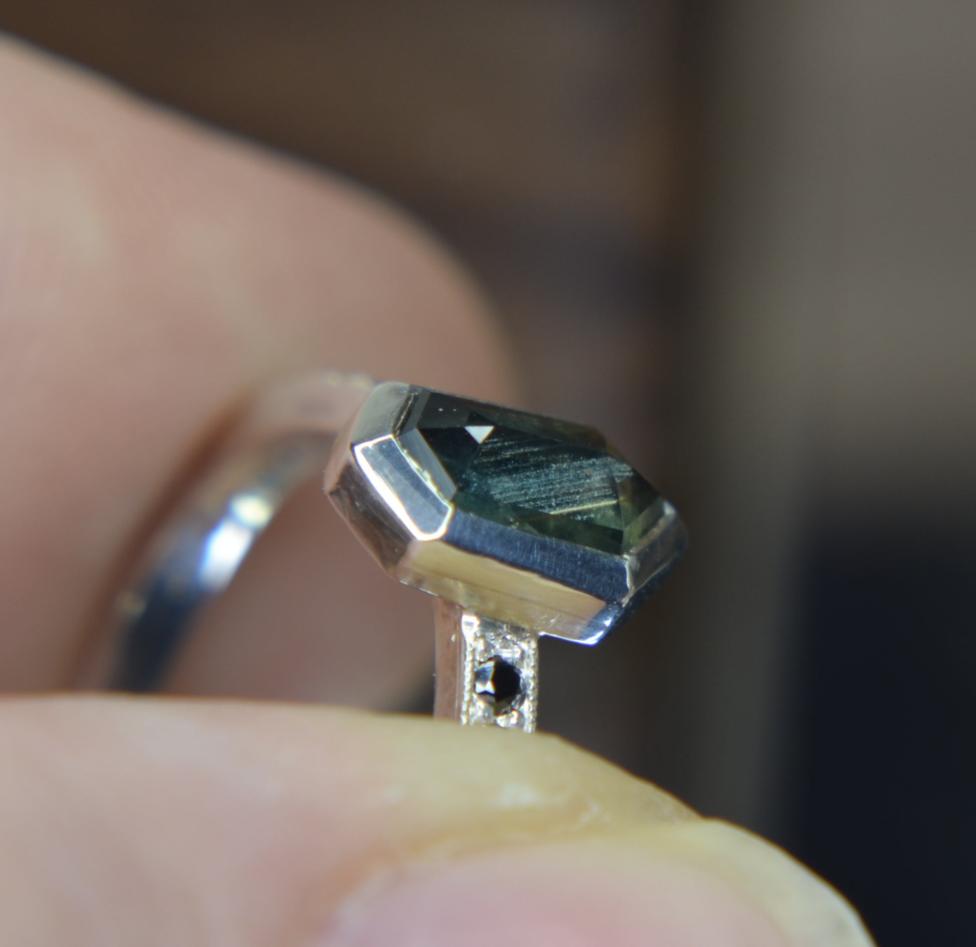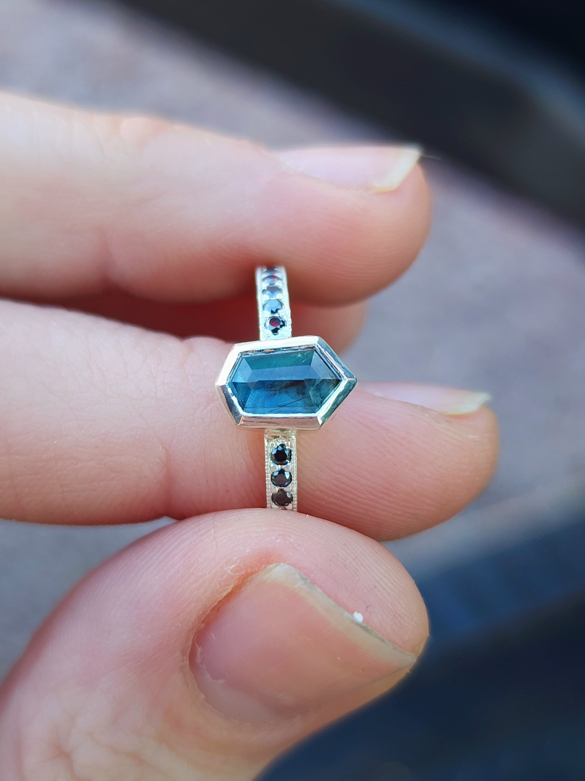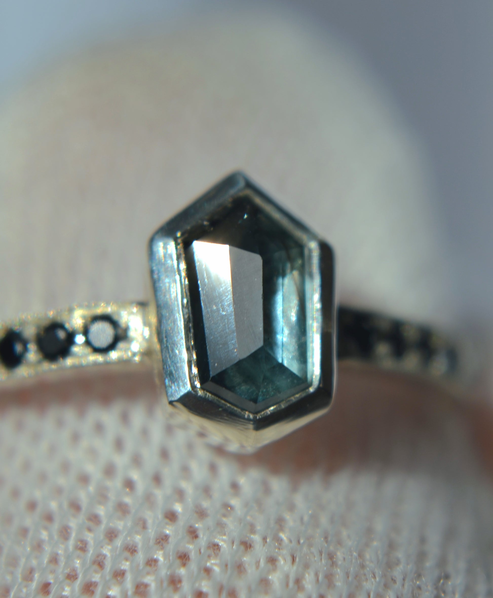 Besides this ring being made in tarnish resistant Argentium silver, having accent stones on each side set in pave style with milgrain, the most exciting aspect I would say is the sapphire itself. Over 1ct, natural sapphire from Madagascar, with schiller effect looking like silk at an angle, it also changes colors from green to blue, depending on the type of light.