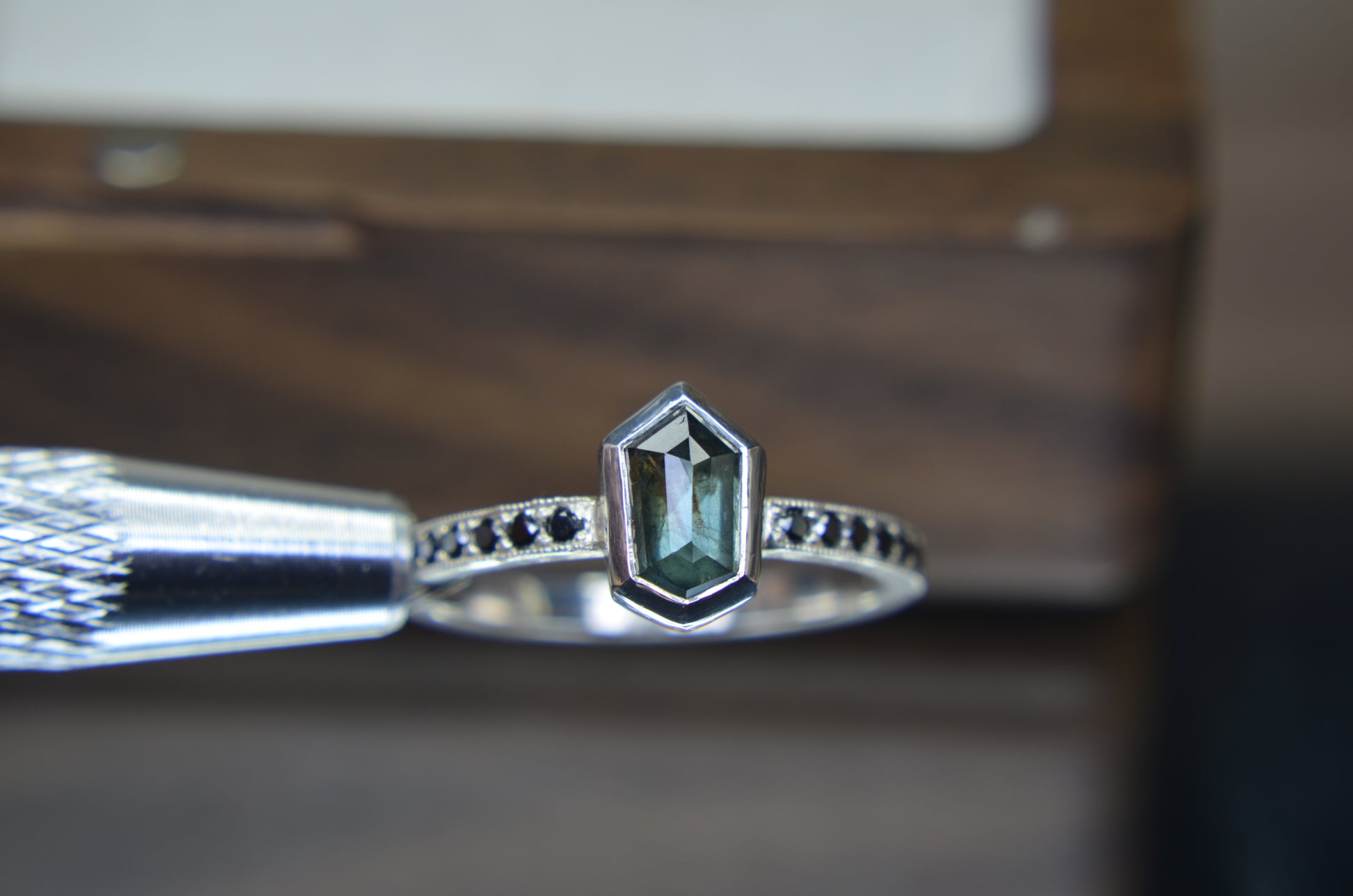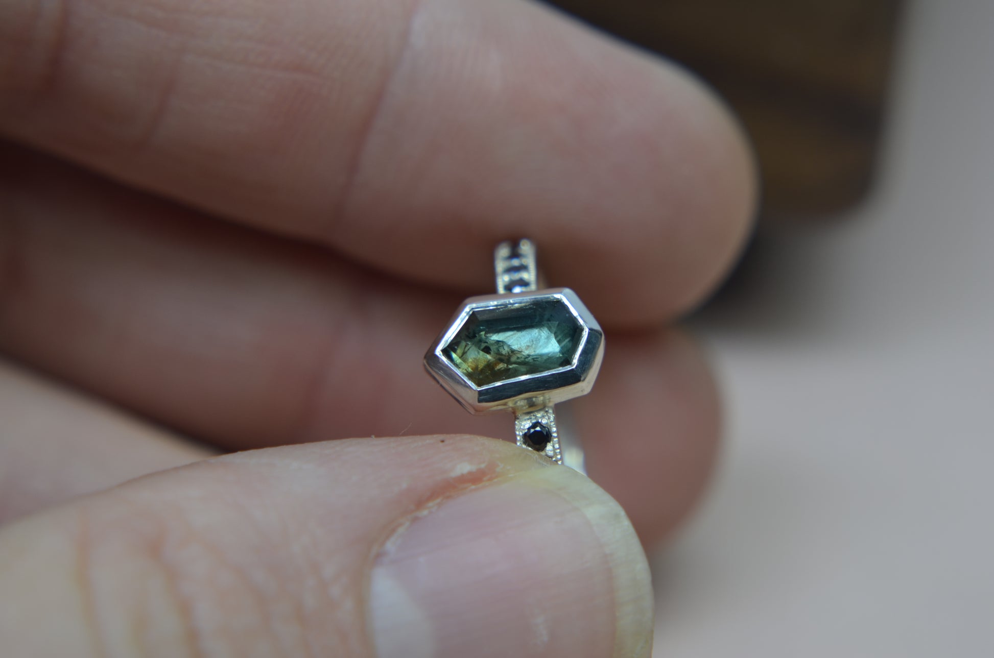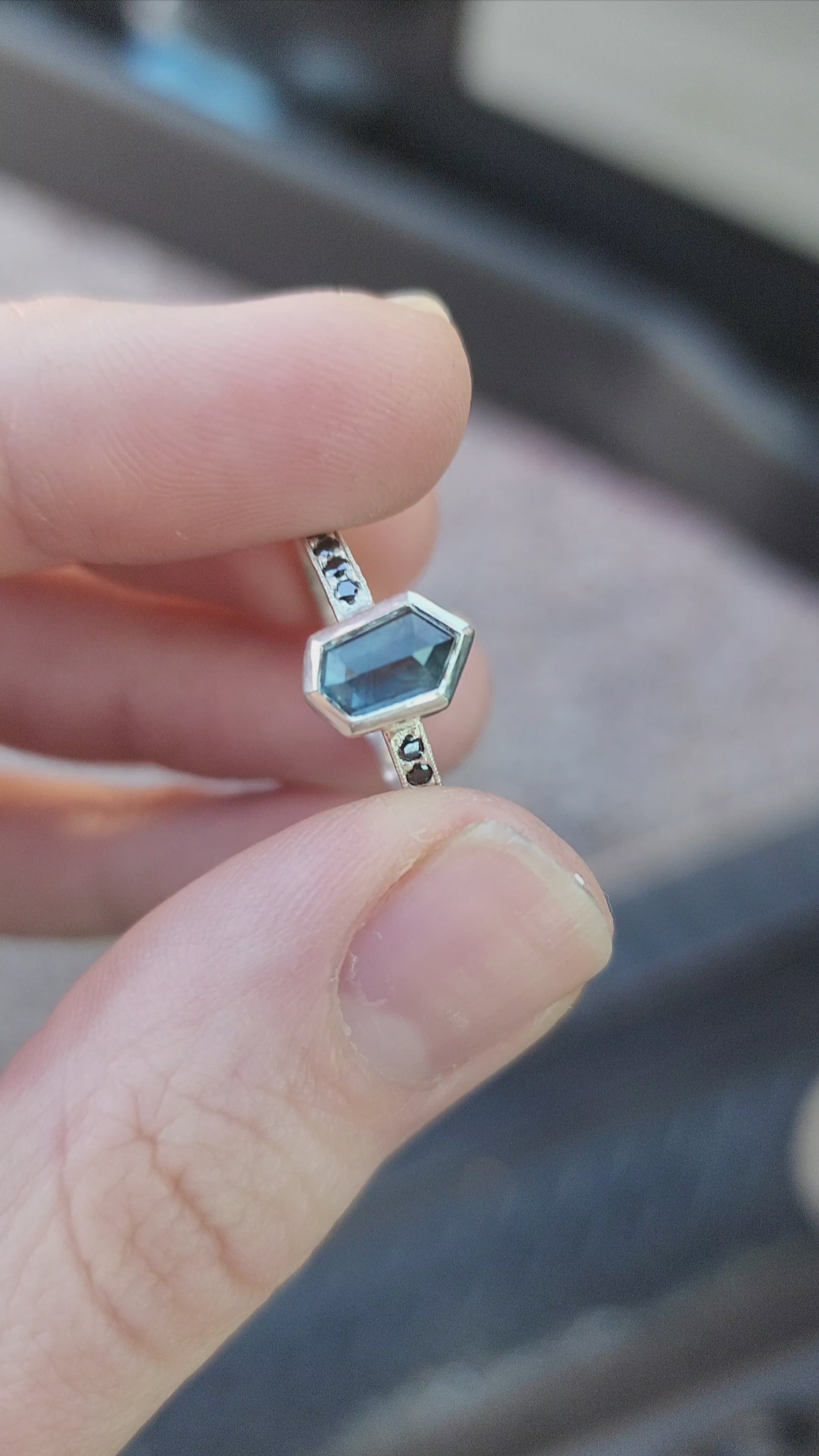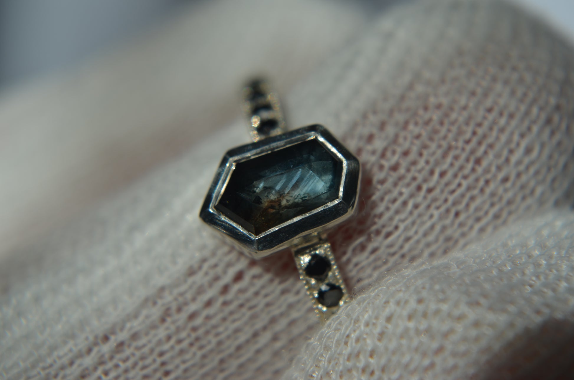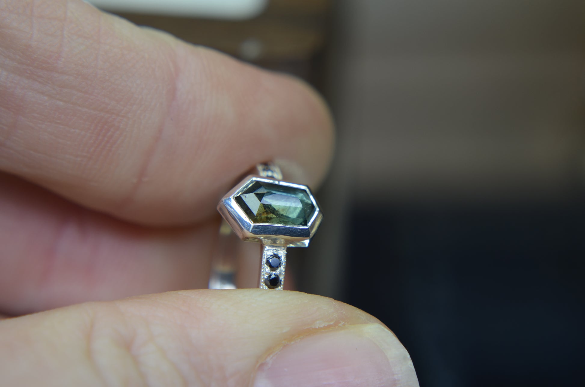 Besides this ring being made in tarnish resistant Argentium silver, having accent stones on each side set in pave style with milgrain, the most exciting aspect I would say is the sapphire itself. Over 1ct, natural sapphire from Madagascar, with schiller effect looking like silk at an angle, it also changes colors from green to blue, depending on the type of light.