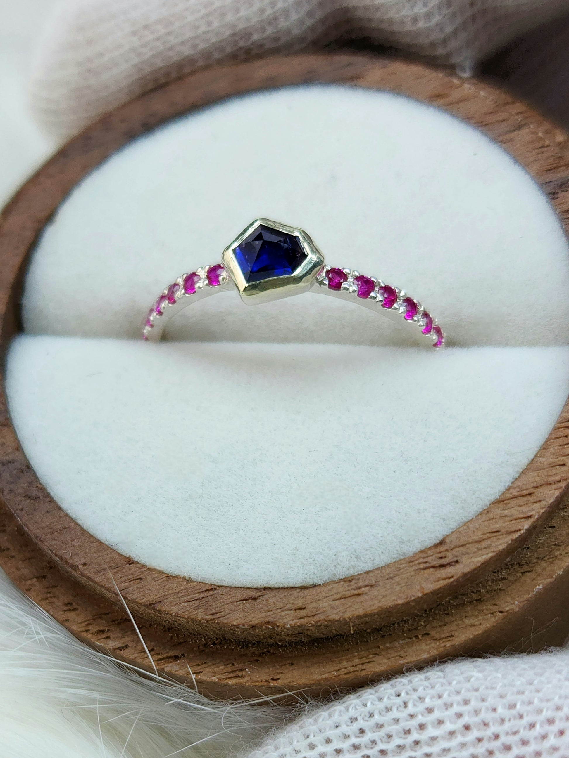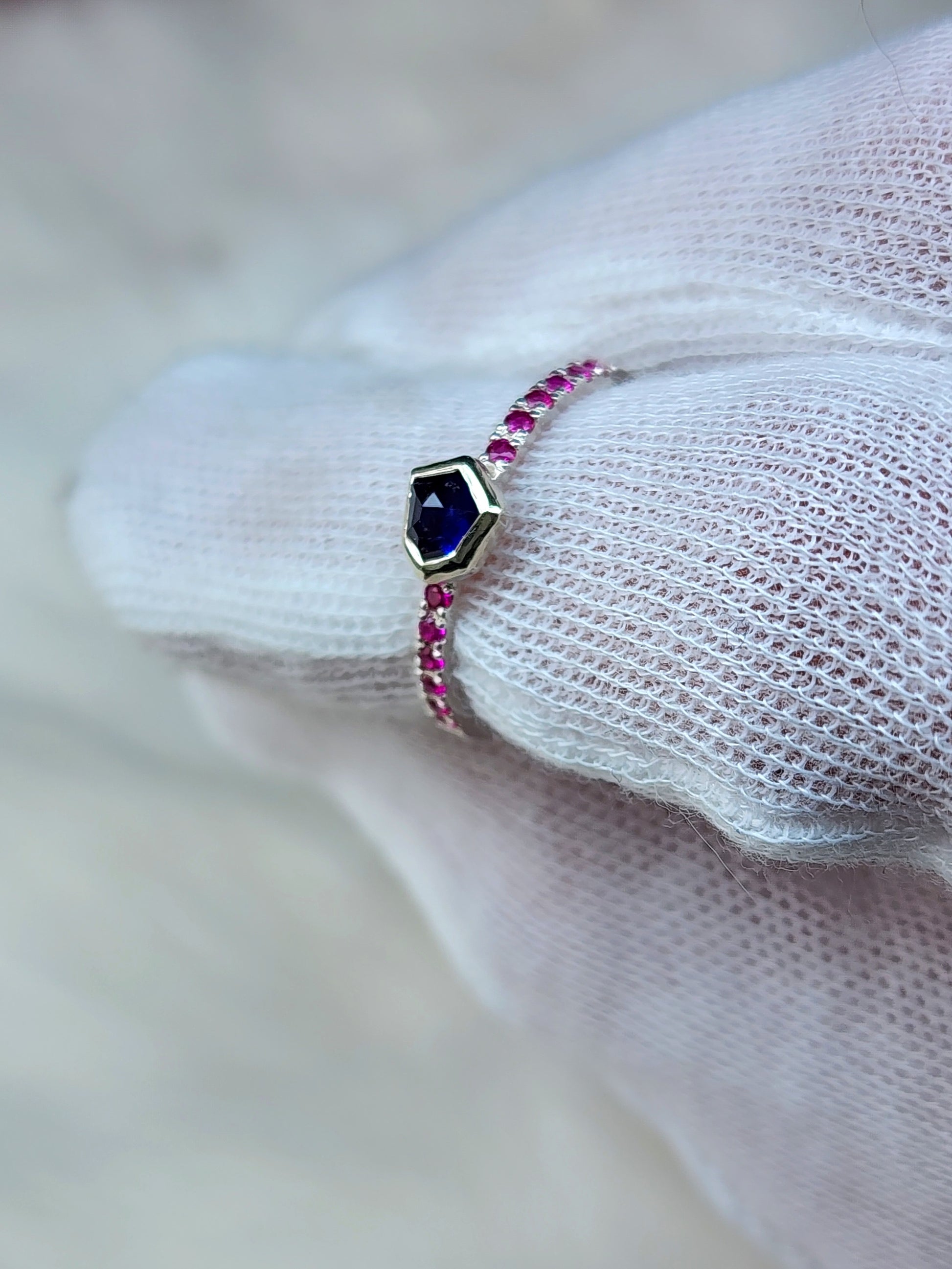Dark blue horizontal natural winza sapphire, sterling silver ring, set in 10 karat yellow gold bezel with 12 synthetic 1.5mm rubies