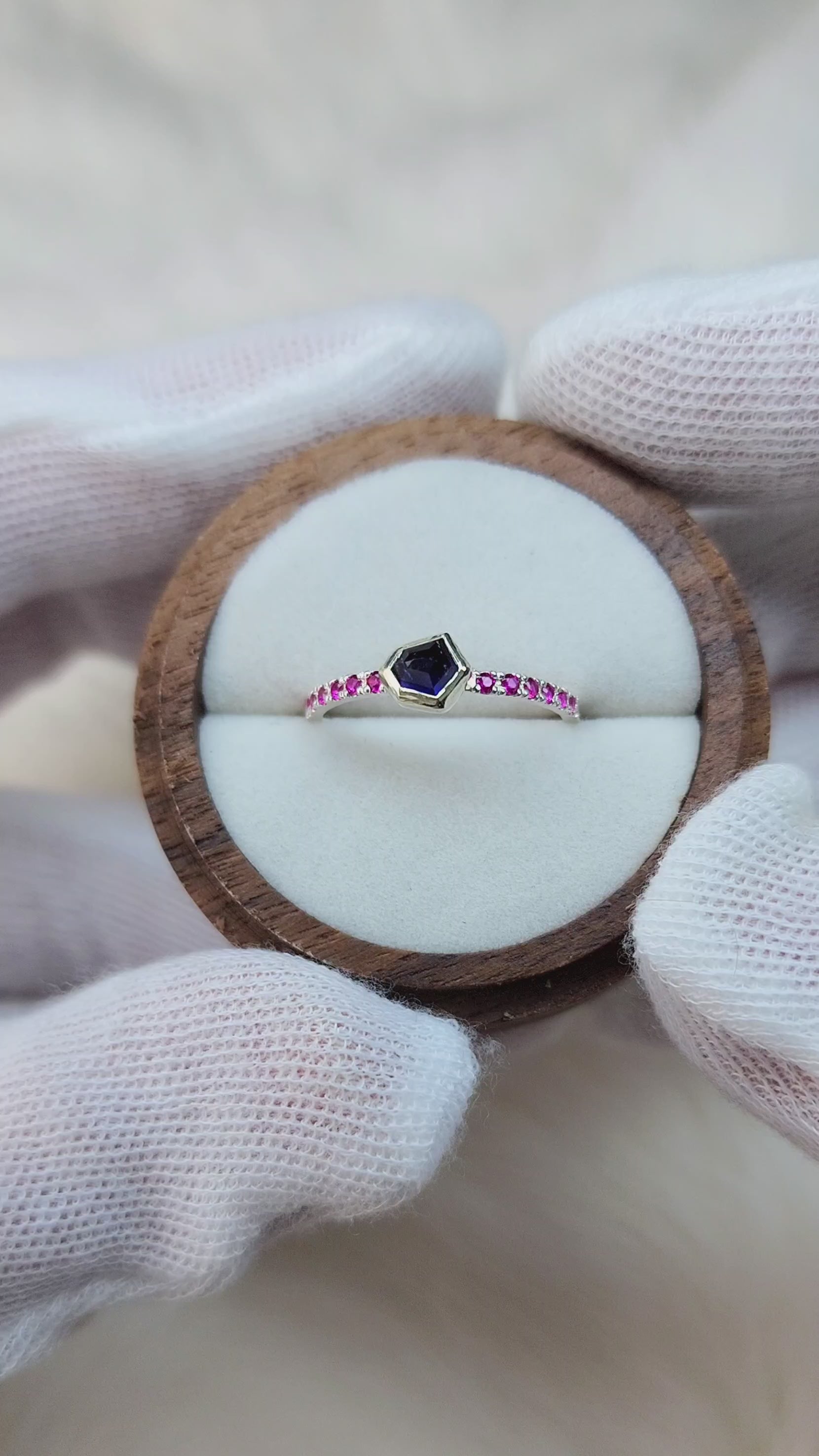Six 1.5mm synthetic rubies set on each side of the stunning blue sapphire for added contrast and uniqueness. With both the sapphire and rubies being graded a 9 on the mohs scale, this ring is ideal for everyday wear. Measurements of this art piece are below: