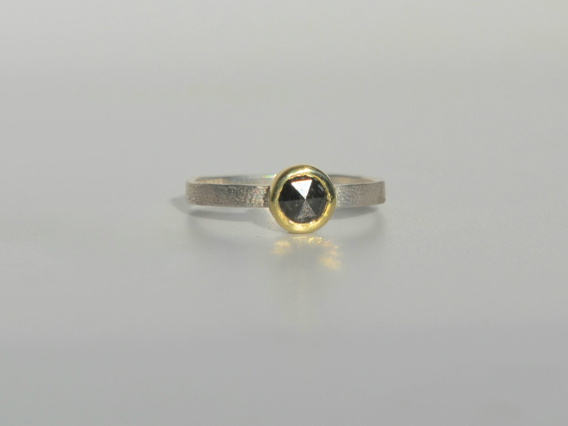 It is a black rosecut, round black diamond (heated) set in solid 14k yellow gold bezel. The gold bezel is made by melting down pure gold with alloys, forming it into a sheet, then sawing out the correct size for it it to go around the diamond.