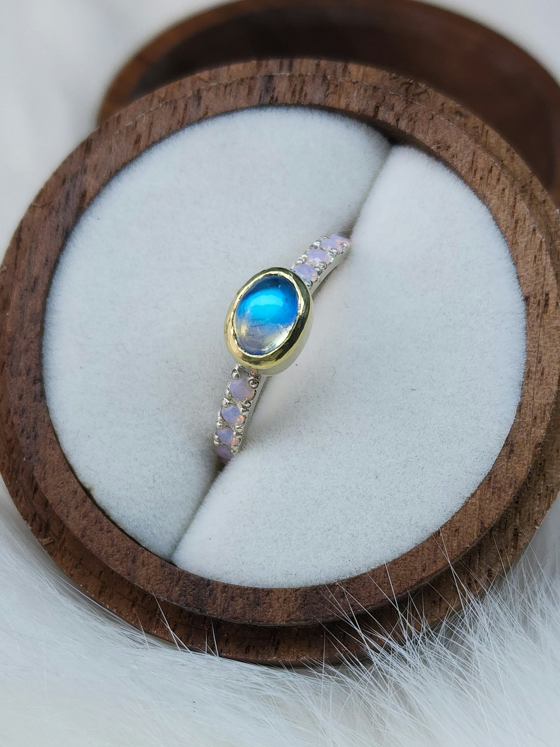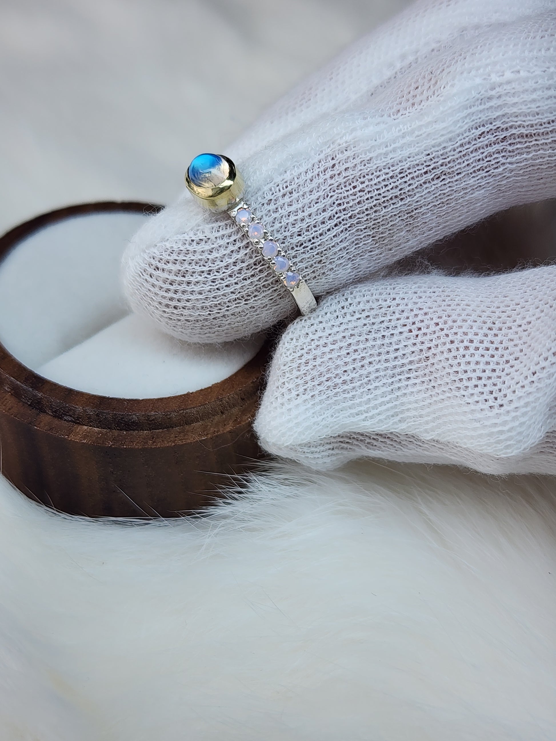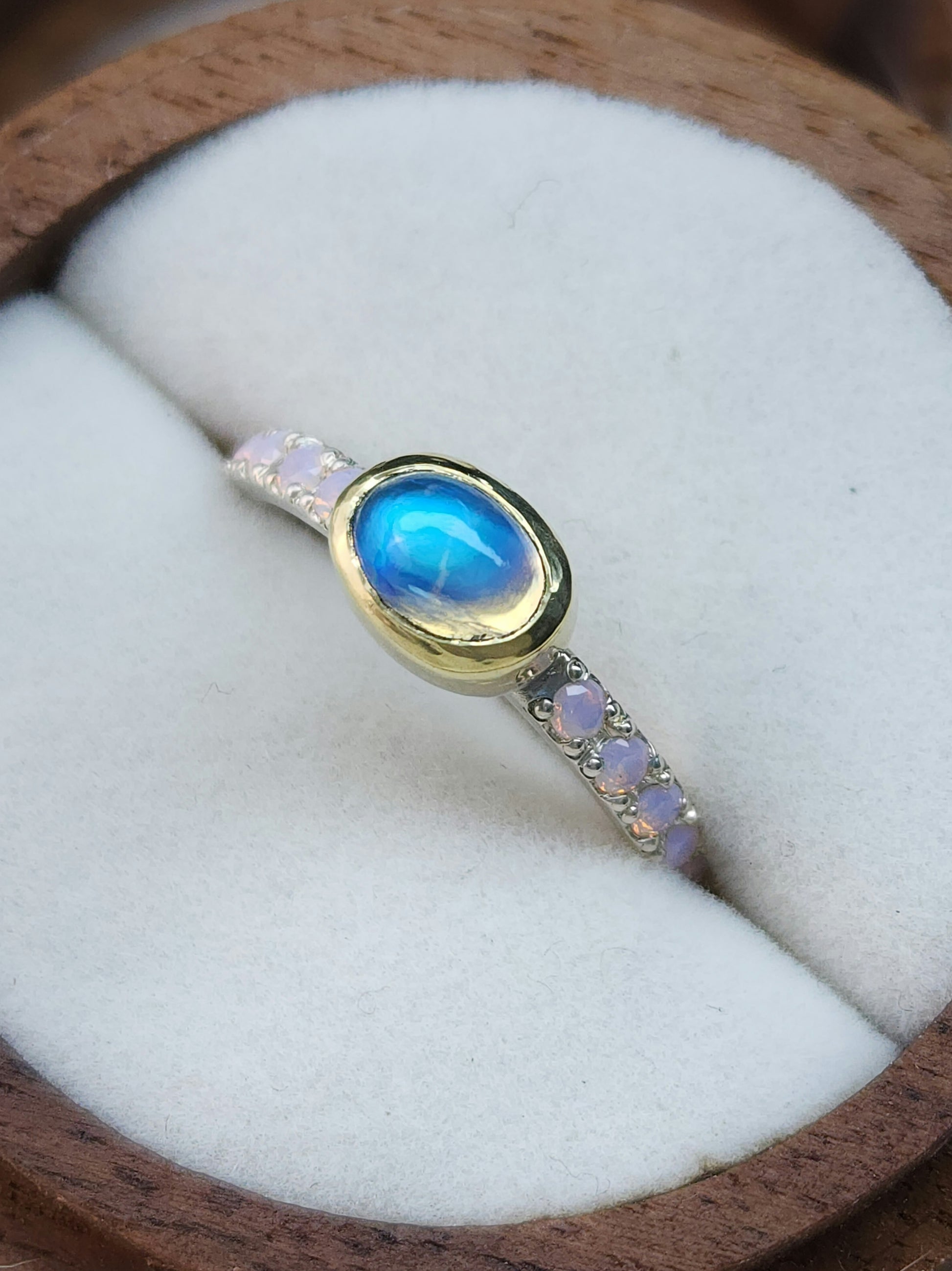 This is one of the very first rings that I completed to perfection incorporating pave style setting. It is dainty, soft, and elegant, featuring a high quality rainbow moonstone as the center stone, set in 14 karat yellow gold bezel, with an added edge of 7 black 1.5mm moissanite on each side, on a sterling silver band.