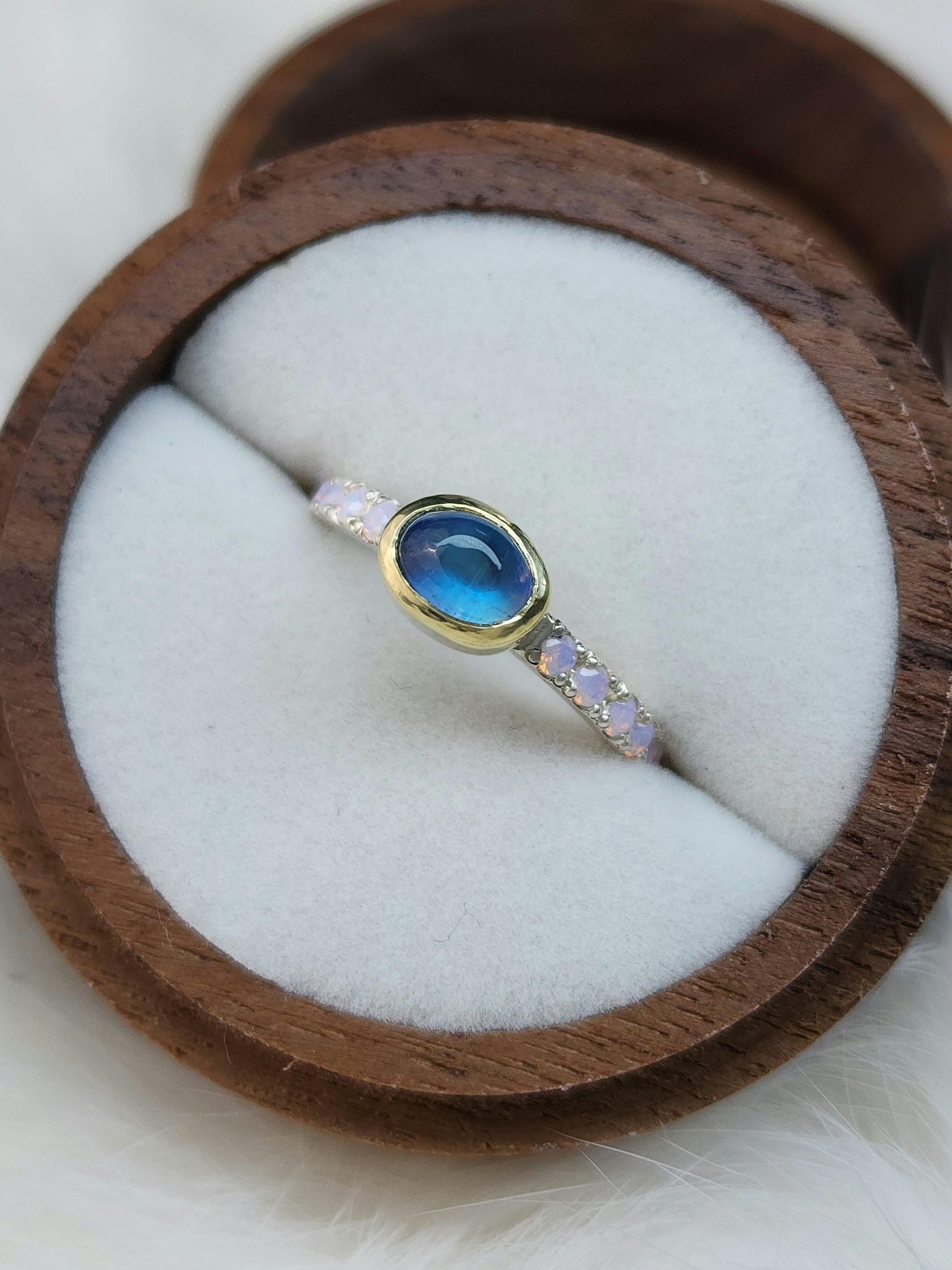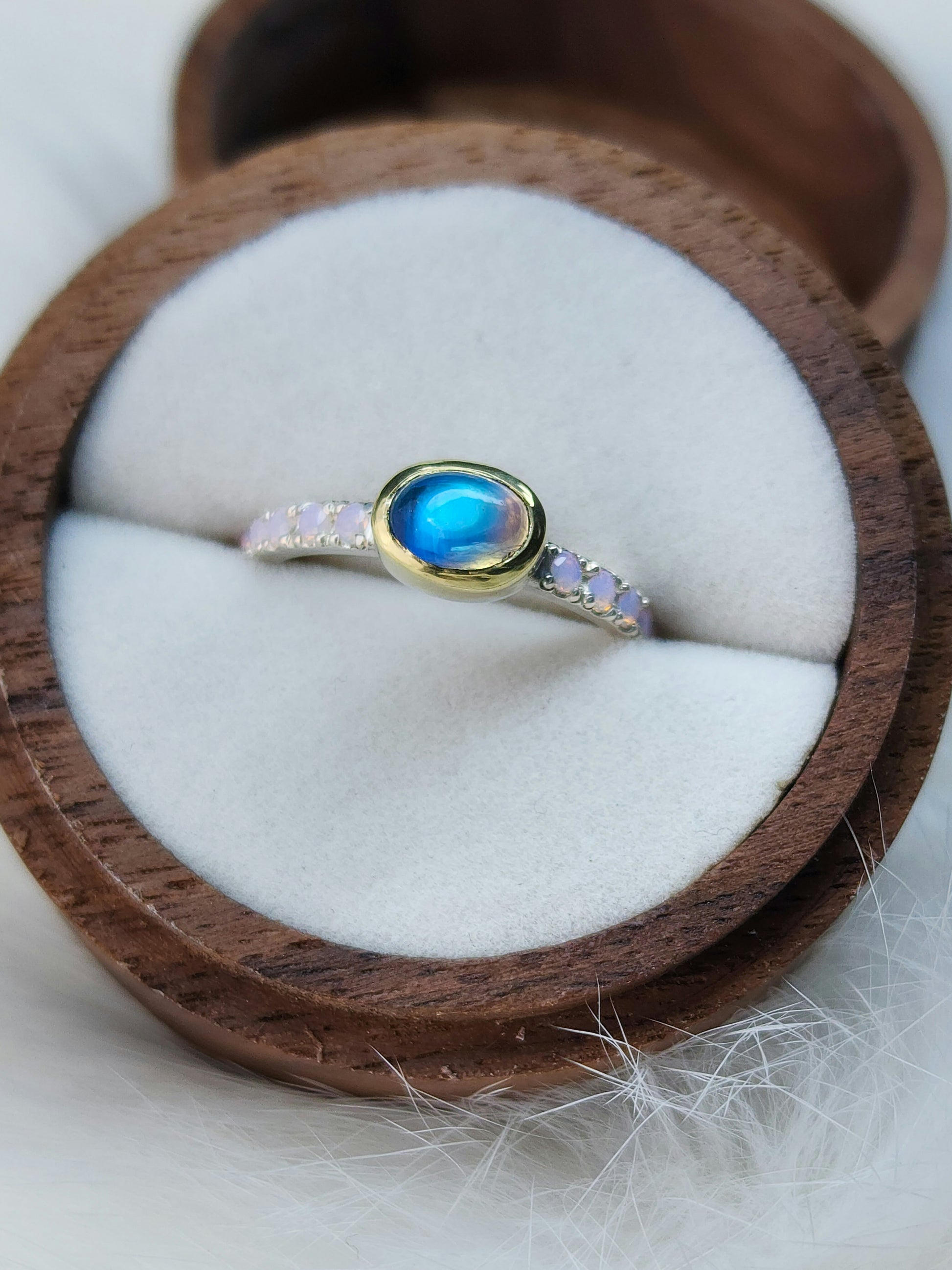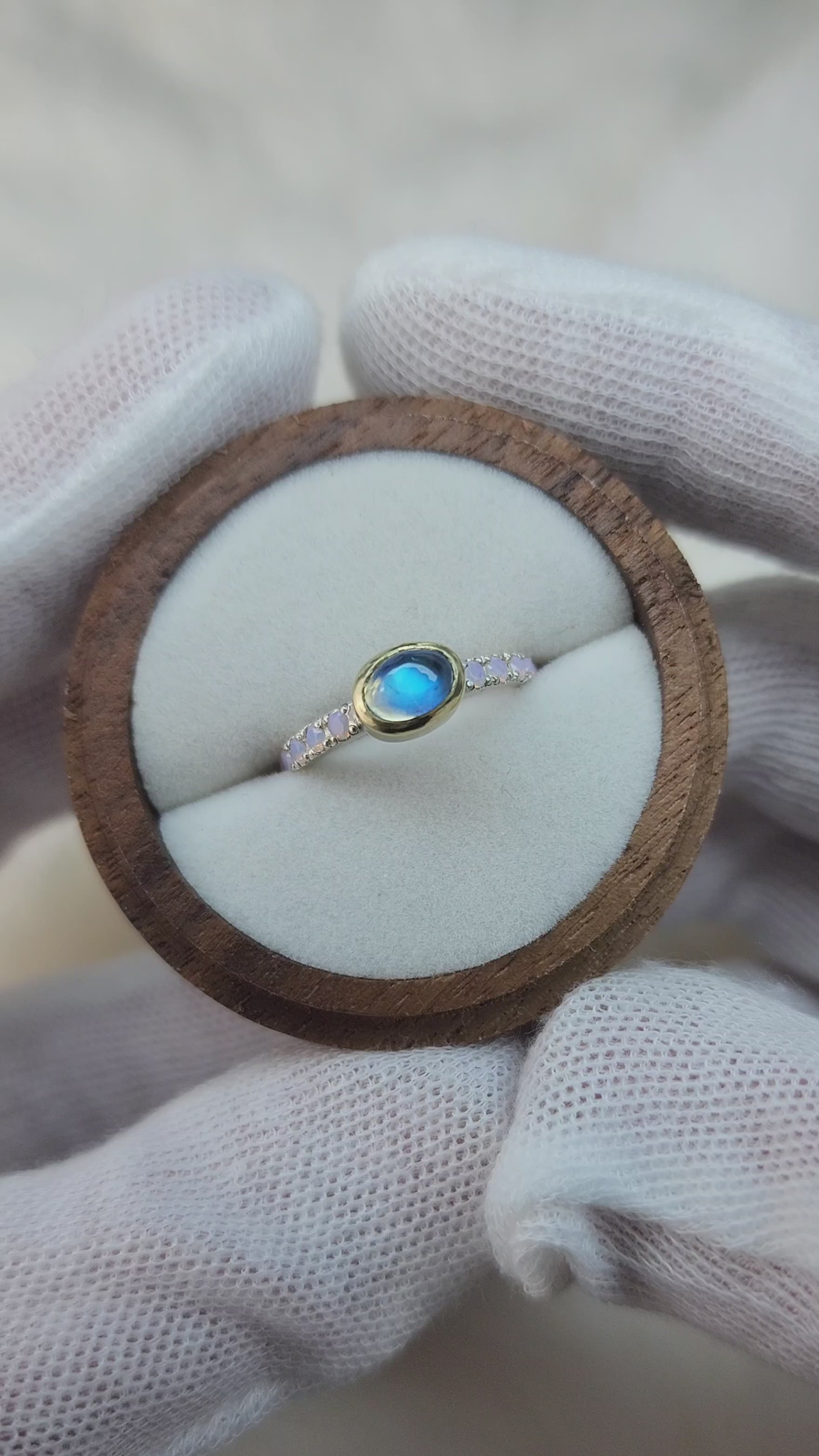 This is one of the very first rings that I completed to perfection incorporating pave style setting. It is dainty, soft, and elegant, featuring a high quality rainbow moonstone as the center stone, set in 14 karat yellow gold bezel, with an added edge of 7 black 1.5mm moissanite on each side, on a sterling silver band.