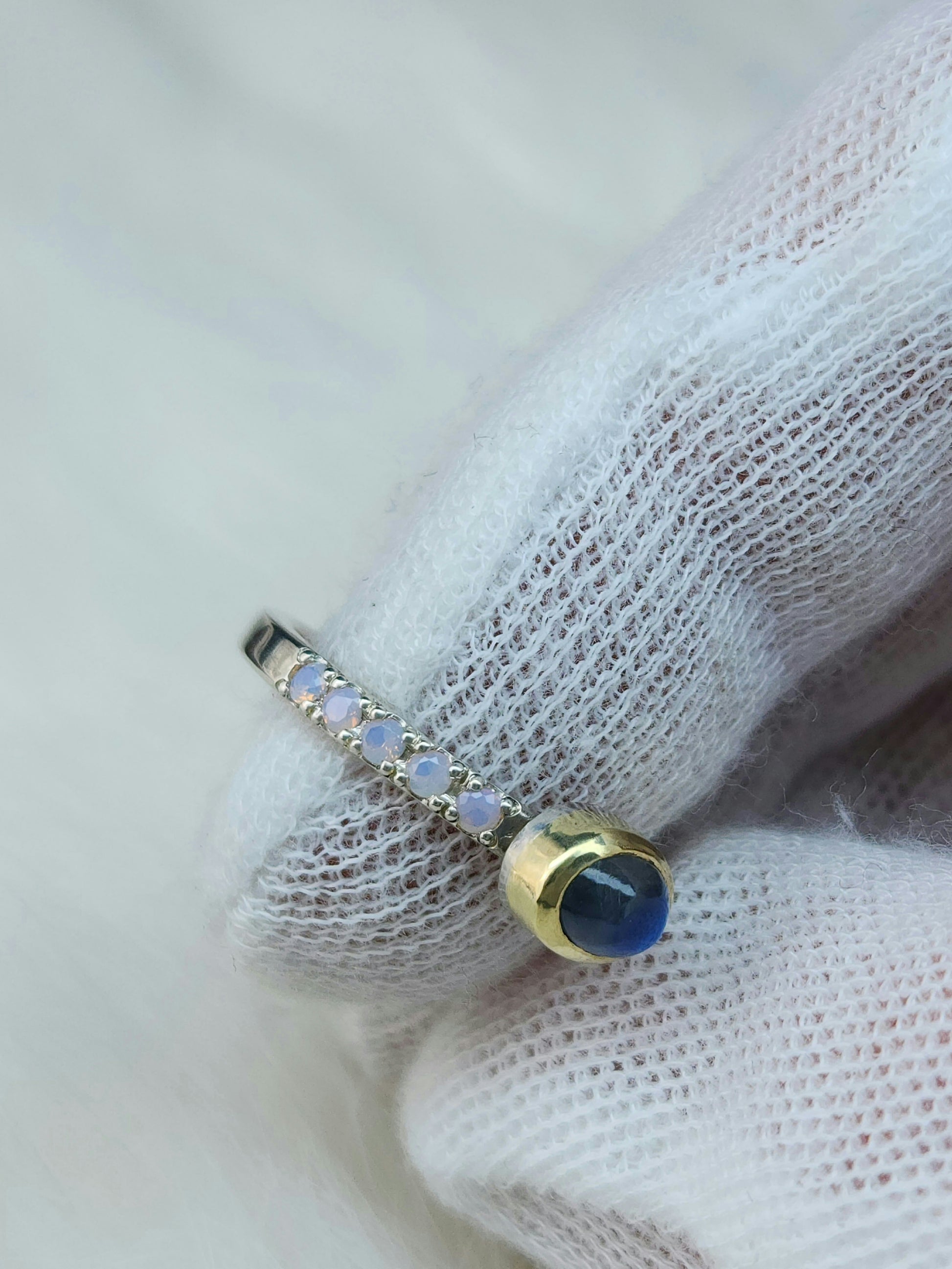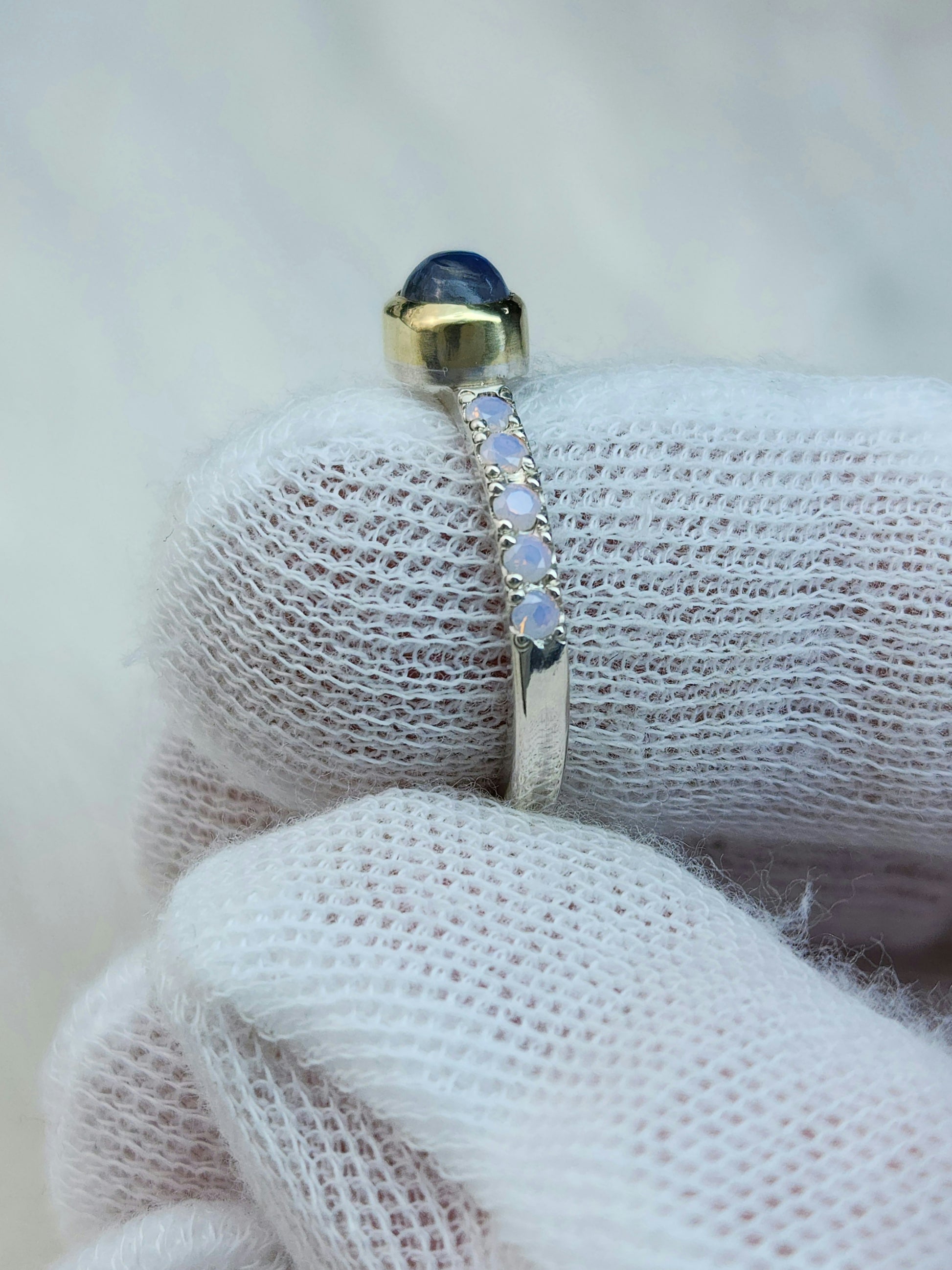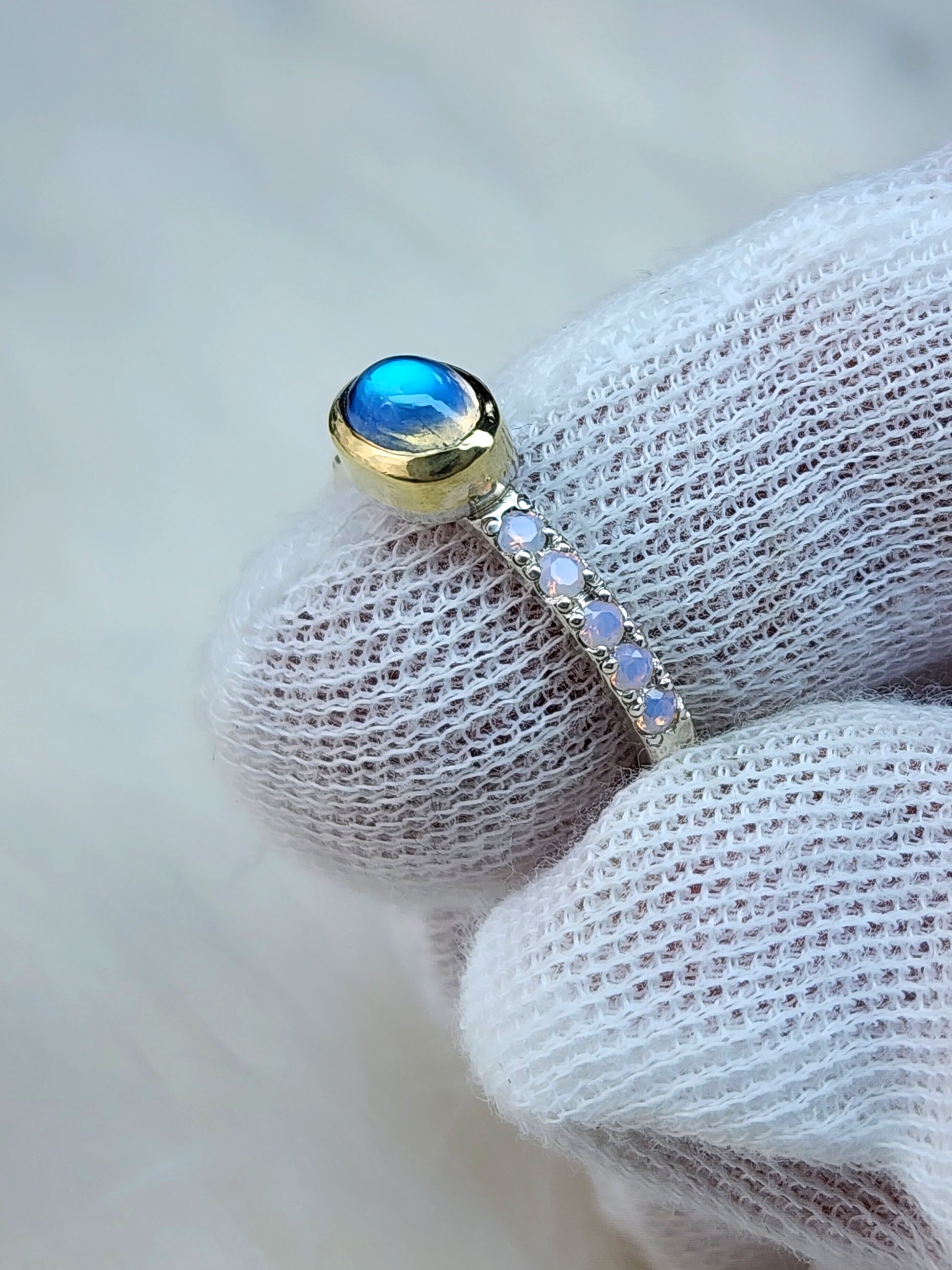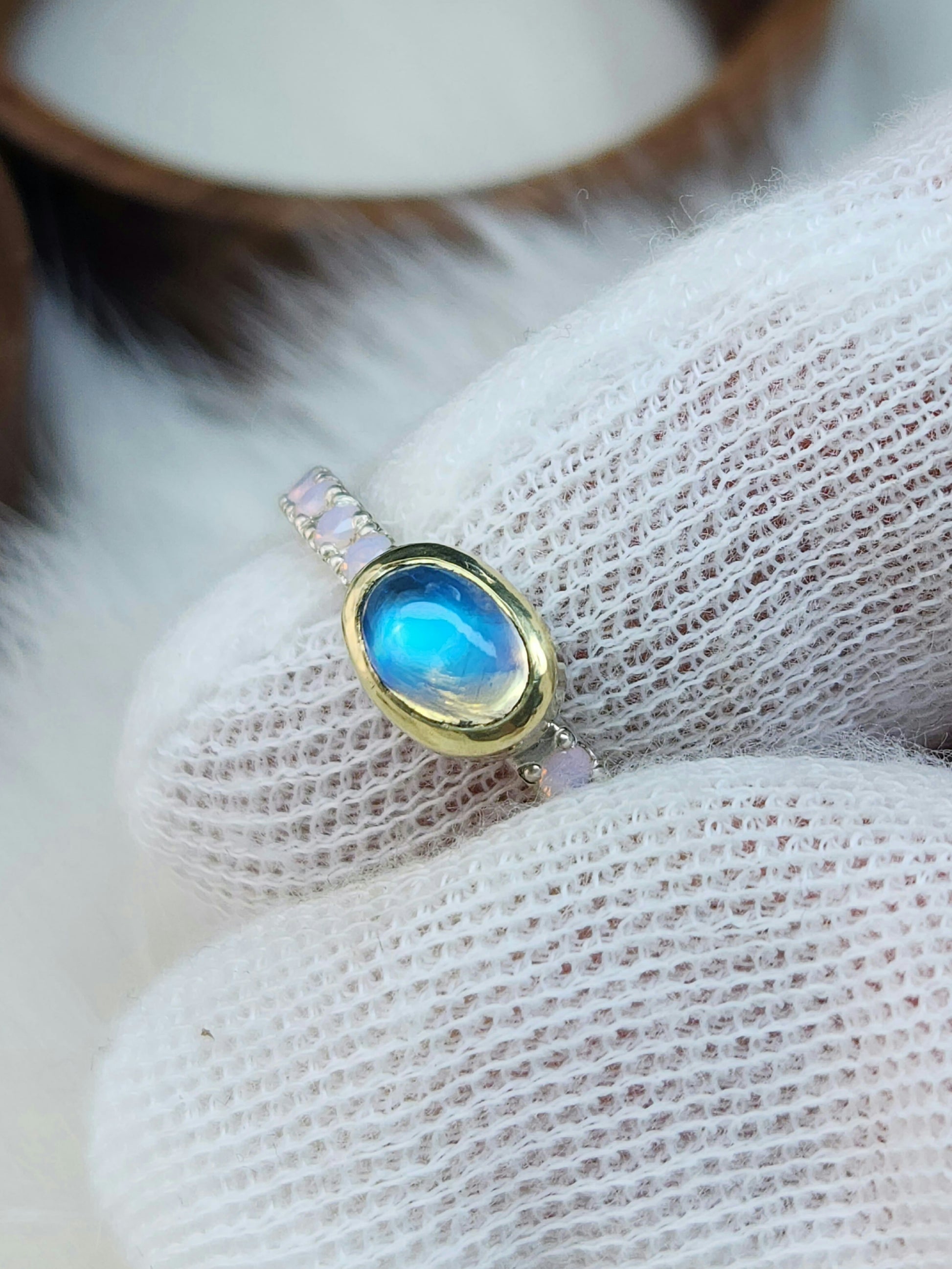 I made this ring using traditional metalsmithing techniques, from the melting of the silver and gold to rolling and forming it into sheet, strips for the bezel, and to the shape of the ring. The moonstone is wrapped with 14 karat yellow gold and soldered to the ring band.
