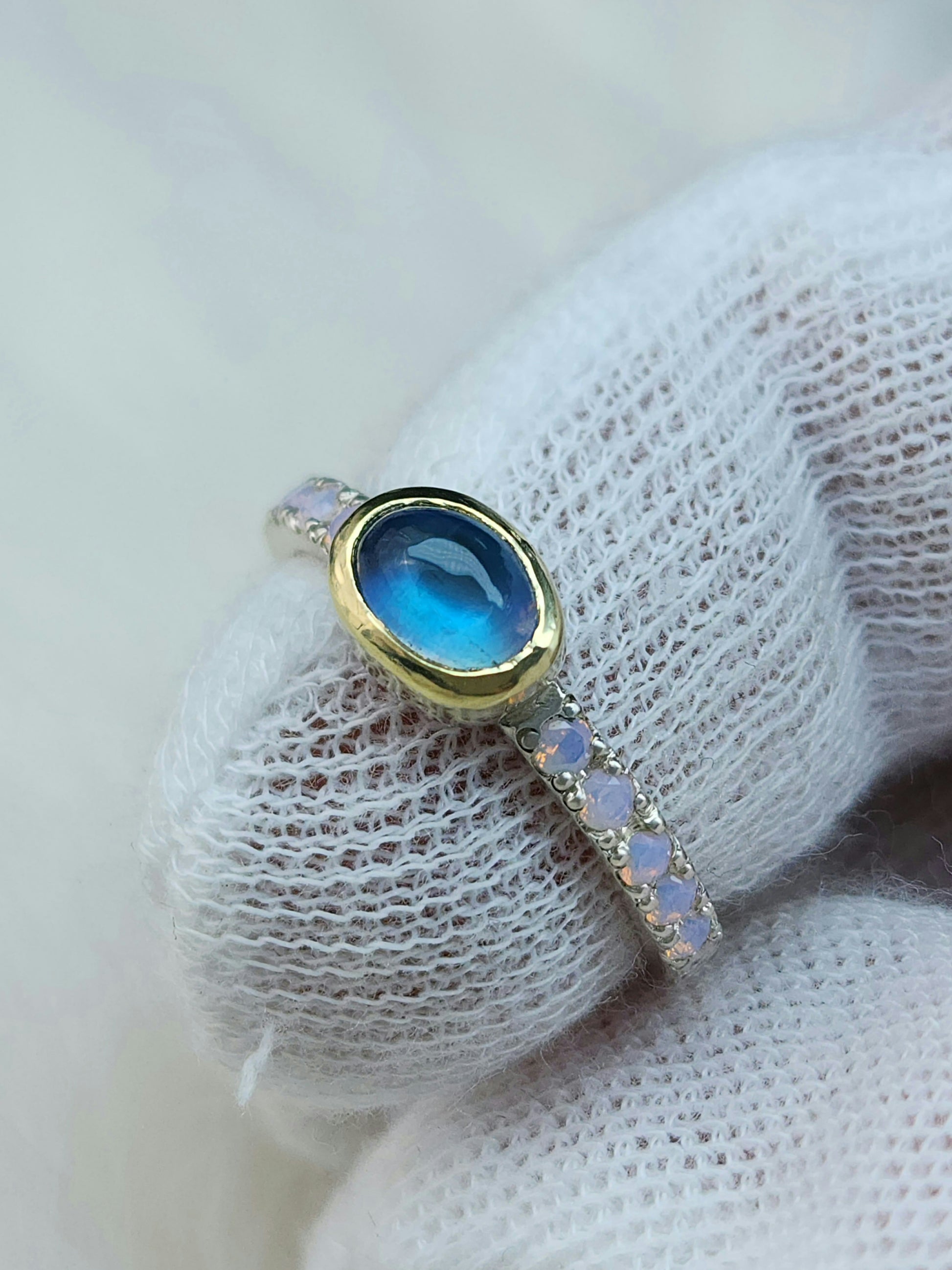 Five 2mm synthetic opals set on each side of the stunning moonstone, enhancing its elegance. Measurements of this art piece are below:
