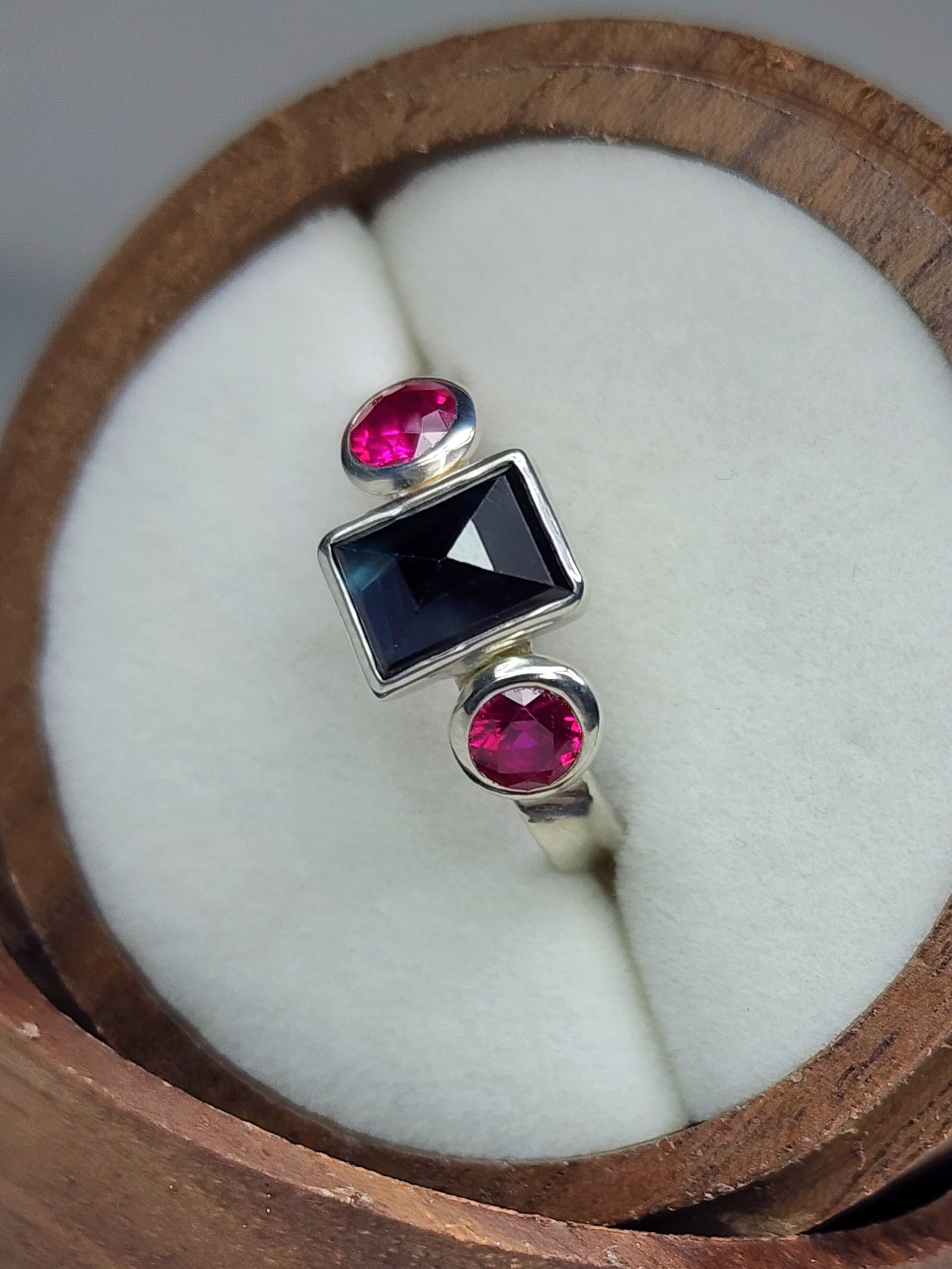 Handmade using traditional metalsmithing techniques, solid sterling silver ring, featuring an all natural parti sapphire with two synthetic rubies on the sides.