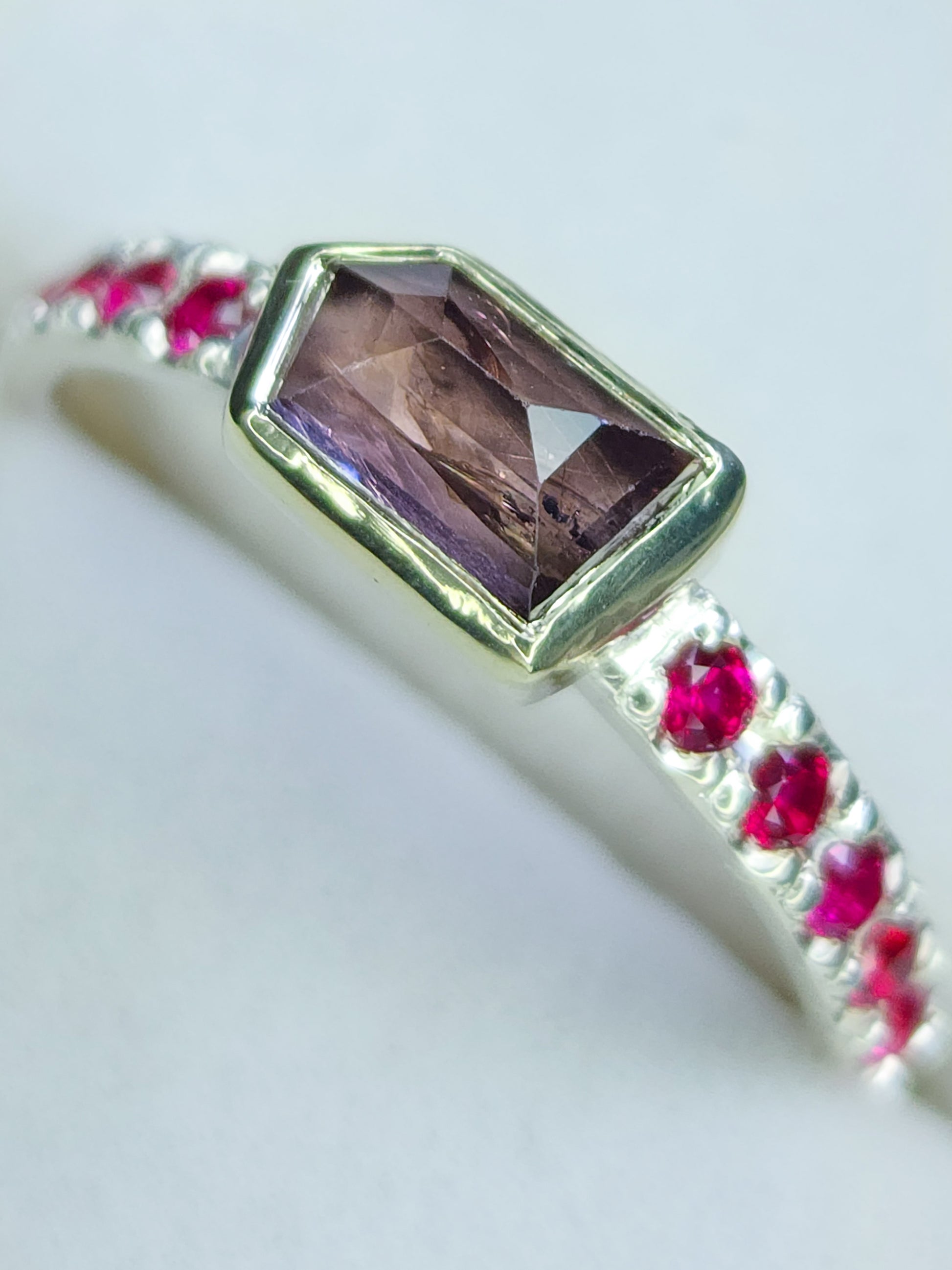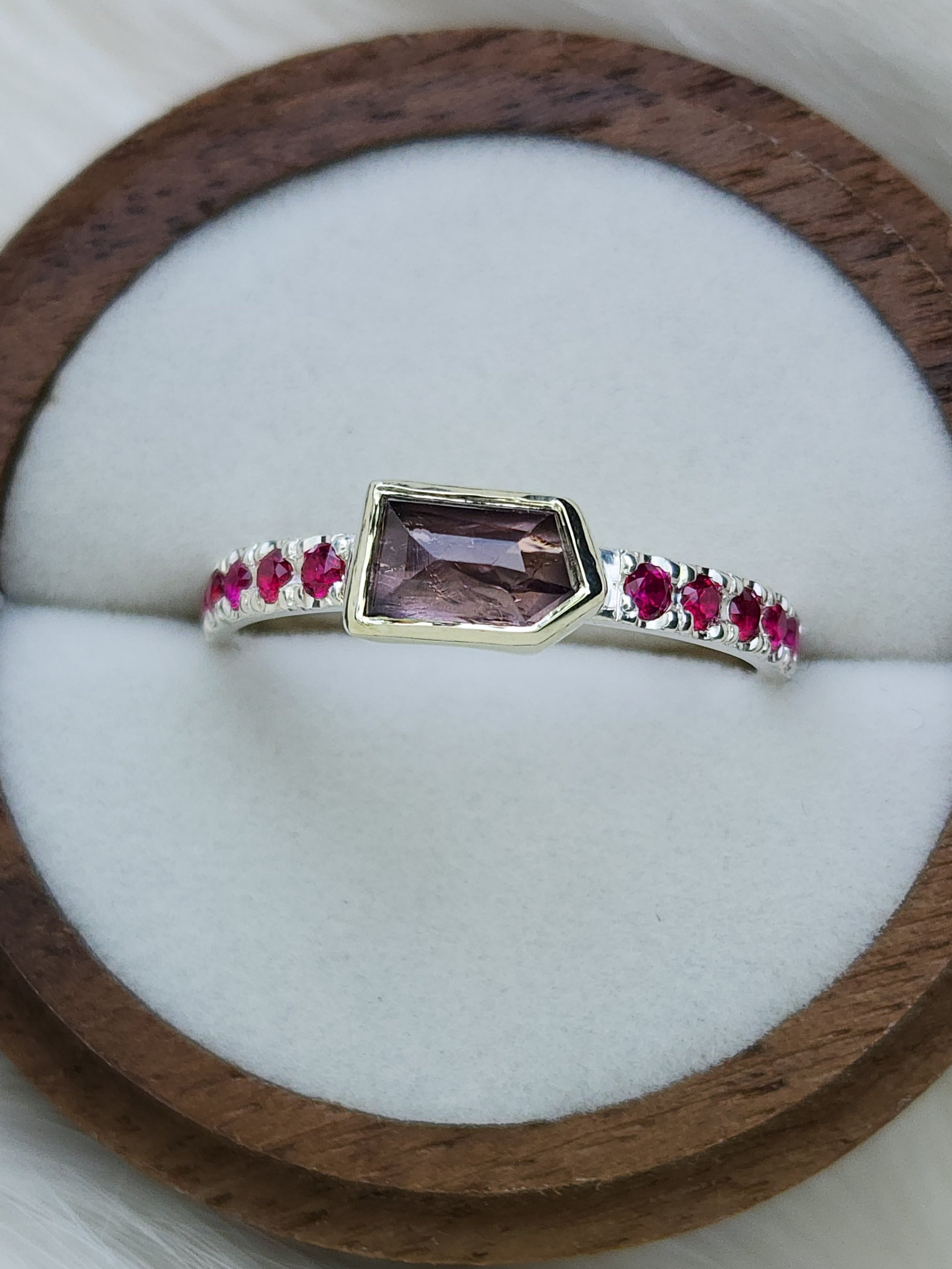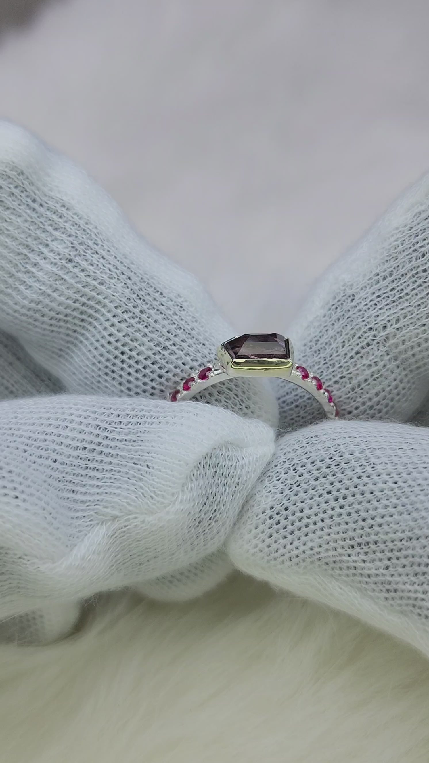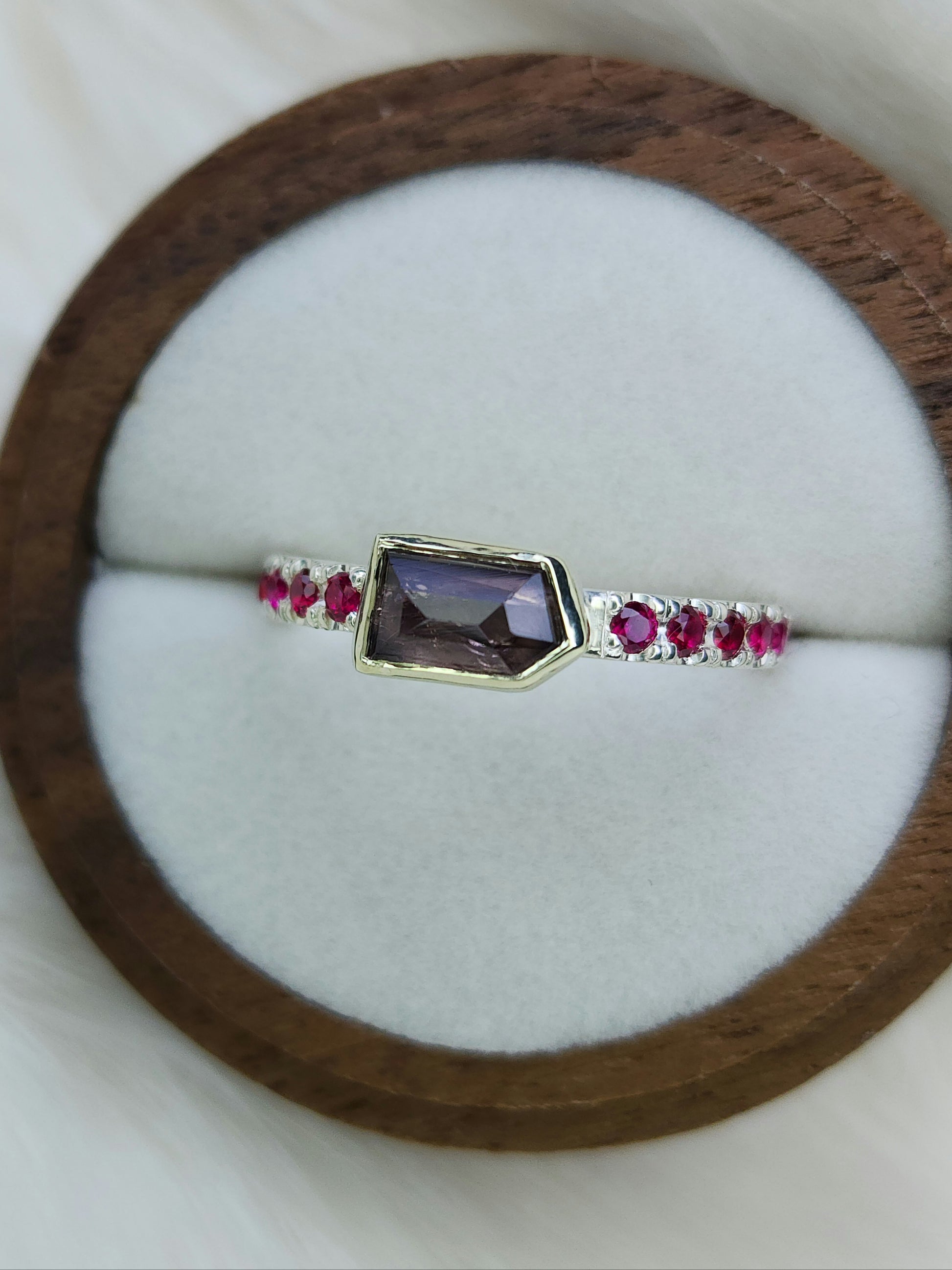 Approximately one carat of a stunning spinel gemstone, set east to west (horizontal), surrounded by not widely known imitation garnet. The color of the center stone is not just one: purple and brown. It has not been heated or treated in any manner, making it 100% natural. Spinel has remained one of my top 3 absolute favorite precious gems since the start due to its high refractive index, shining in every direction. It sits between 7.5 and 8 on the mohs hardness scale, making it durable enough for everyday wear.