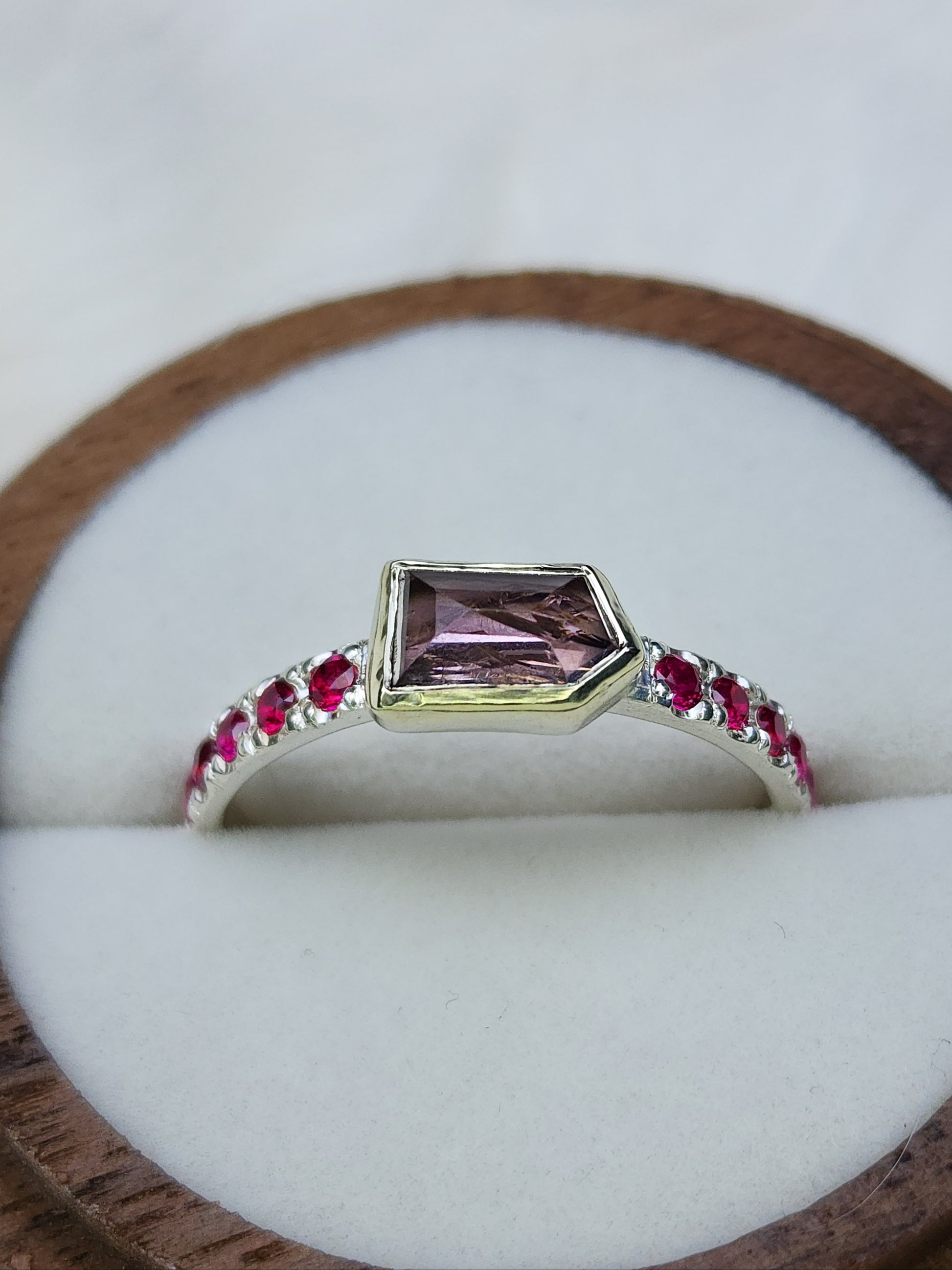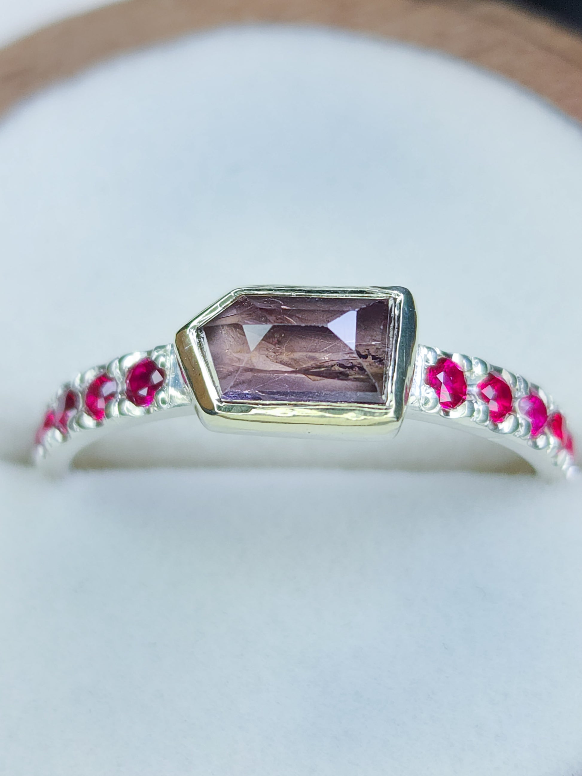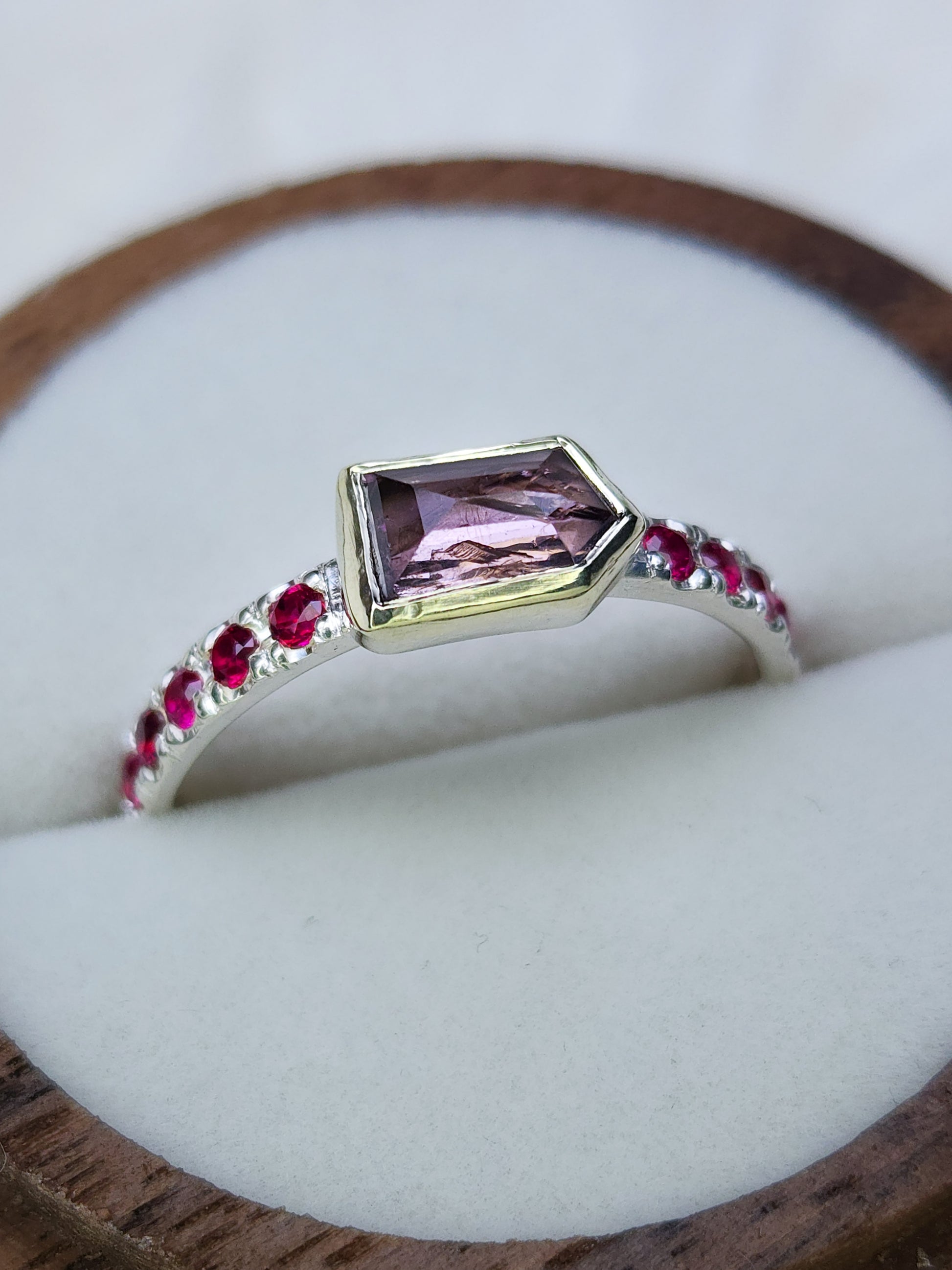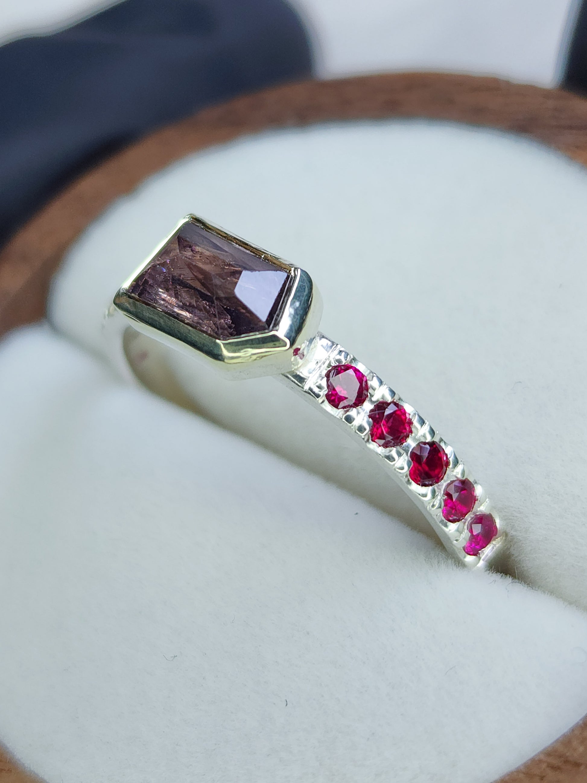Approximately one carat of a stunning spinel gemstone, set east to west (horizontal), surrounded by not widely known imitation garnet. The color of the center stone is not just one: purple and brown. It has not been heated or treated in any manner, making it 100% natural. Spinel has remained one of my top 3 absolute favorite precious gems since the start due to its high refractive index, shining in every direction. It sits between 7.5 and 8 on the mohs hardness scale, making it durable enough for everyday wear.