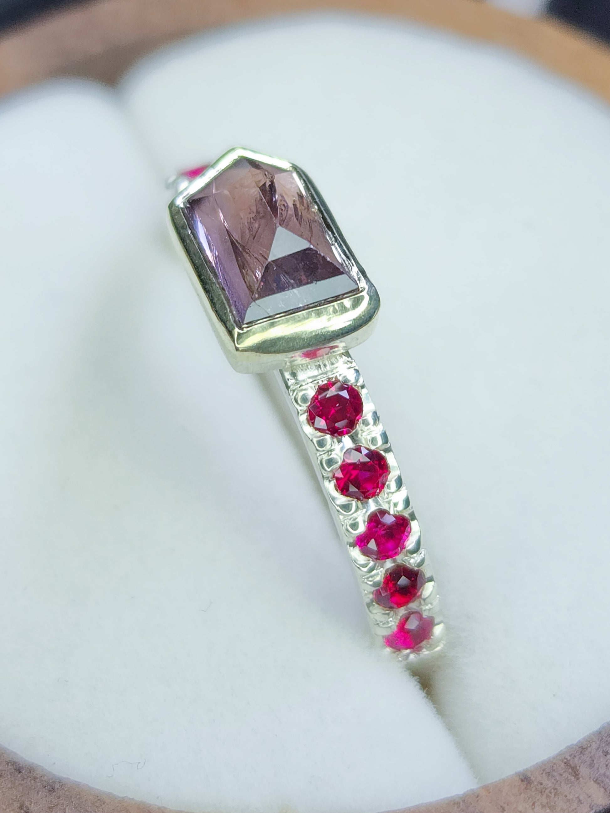 The surrounding garnets measure 2mm, and have almost a velvety look to them, which I personally have never seen until working with these. There are 5 stones on each side of the Spinel. They land at 9 on the mohs hardness scale.