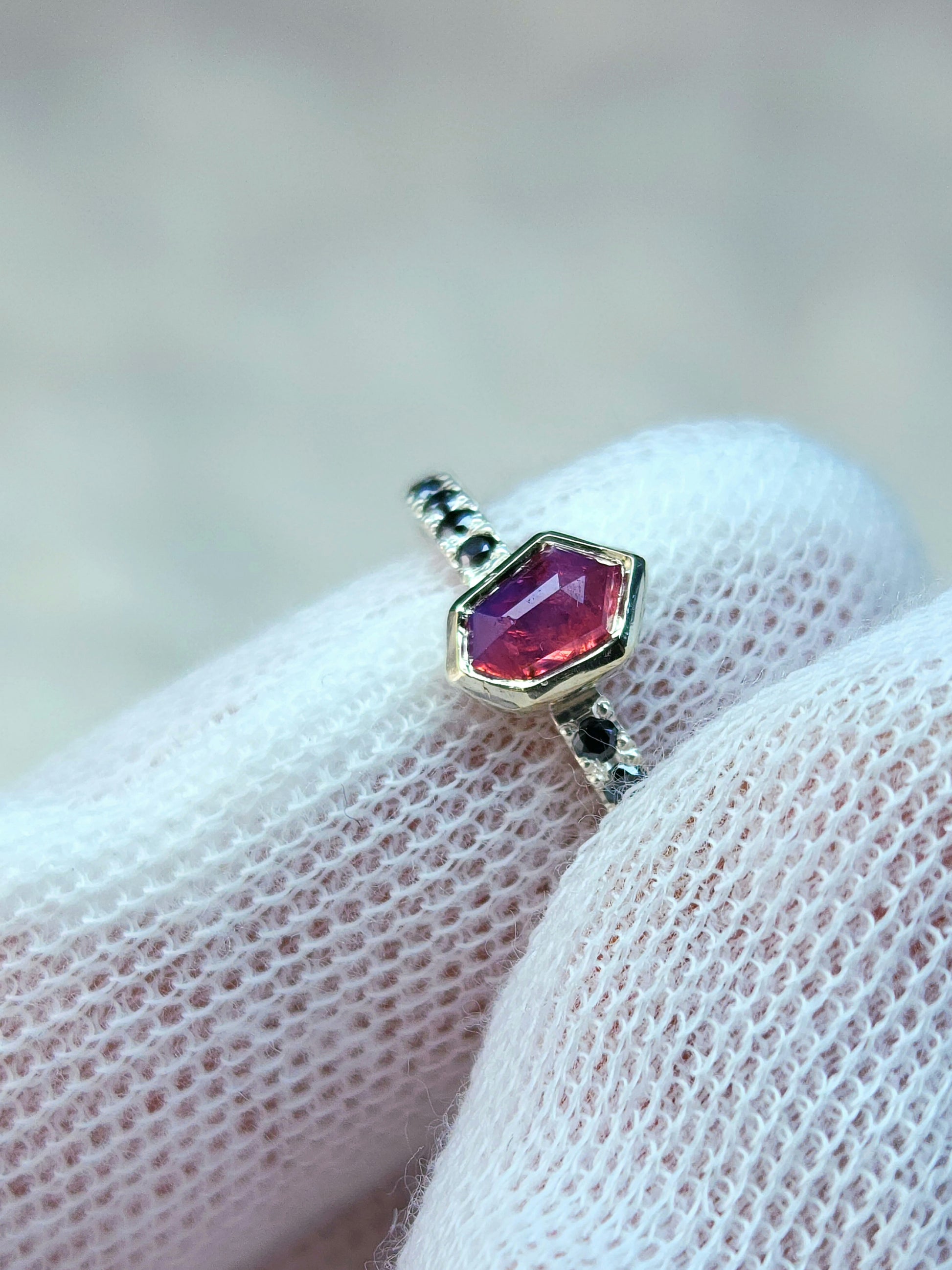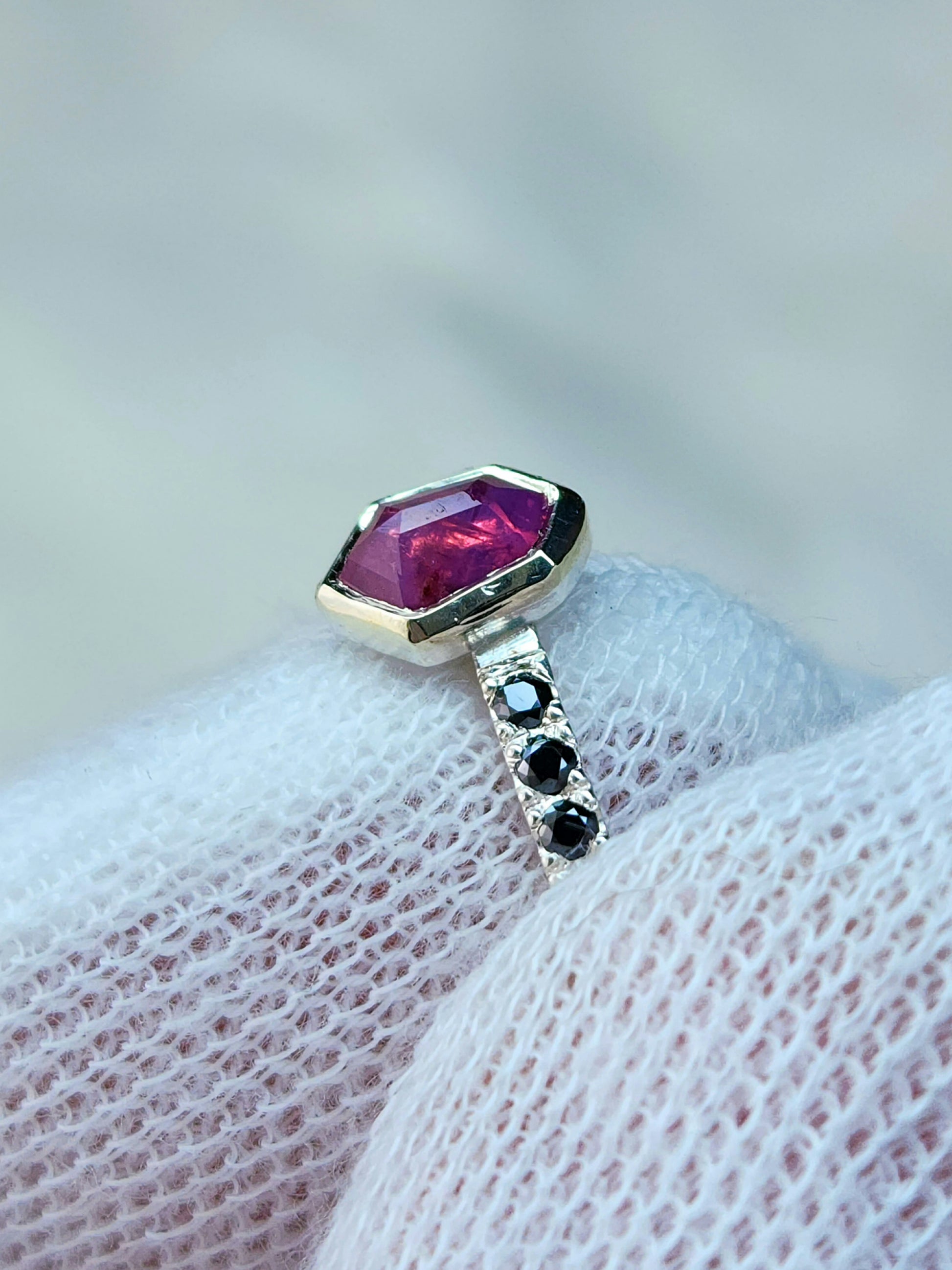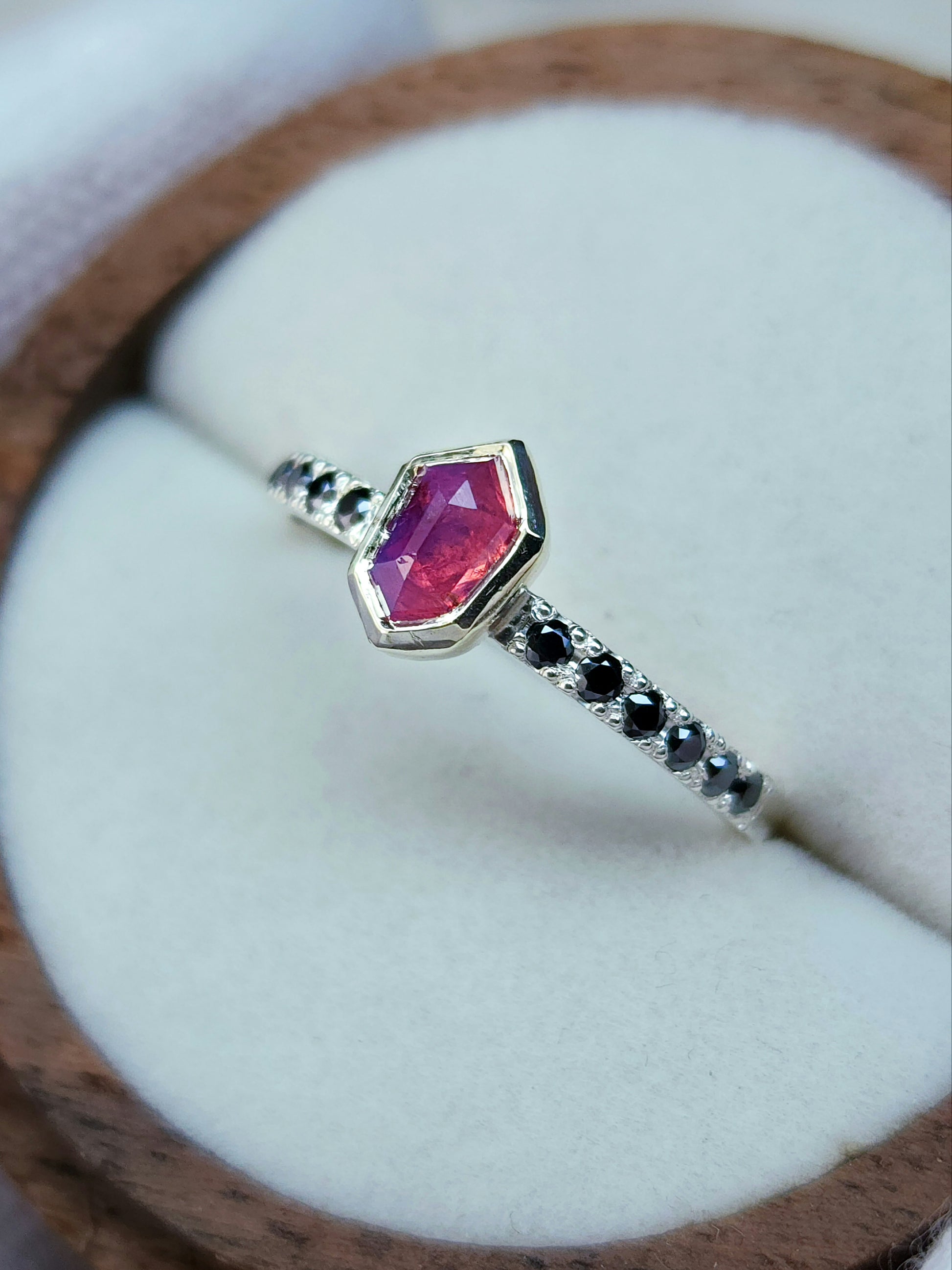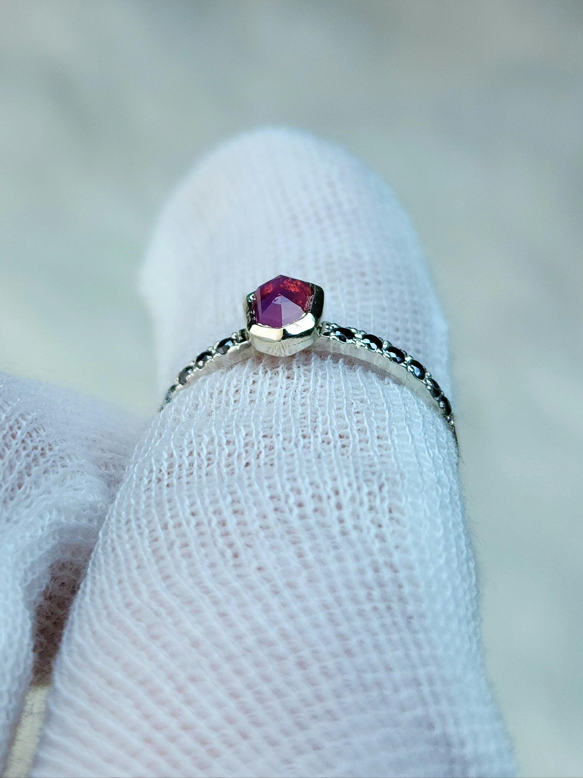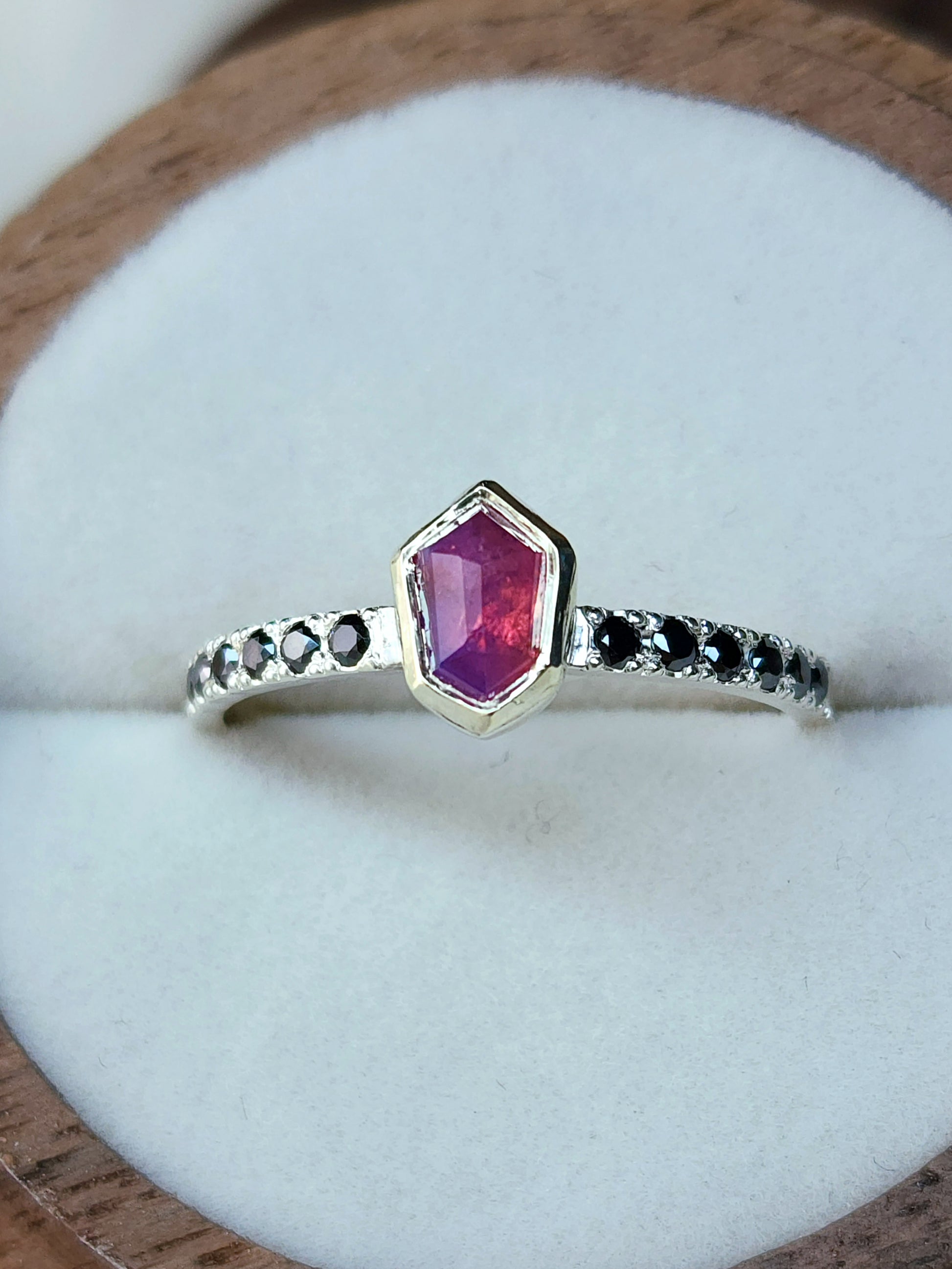 Six 1.5mm black moissanite on each side of the mesmerizing pink sapphire for added contrast and uniqueness. With sapphire being graded a 9 on the mohs scale, and moissanite a 9.5, this ring is ideal for everyday wear. Measurements of this beauty are below:
