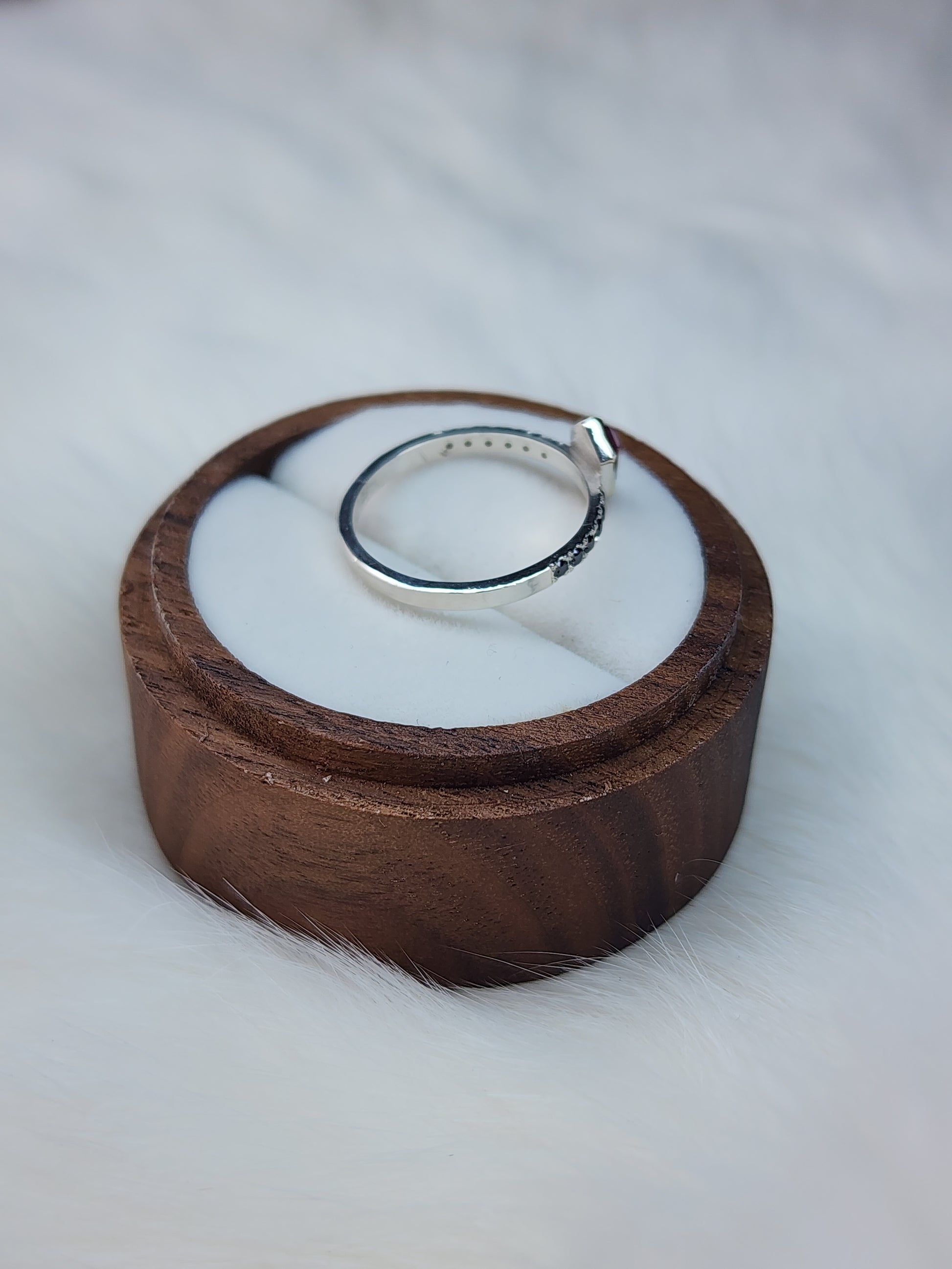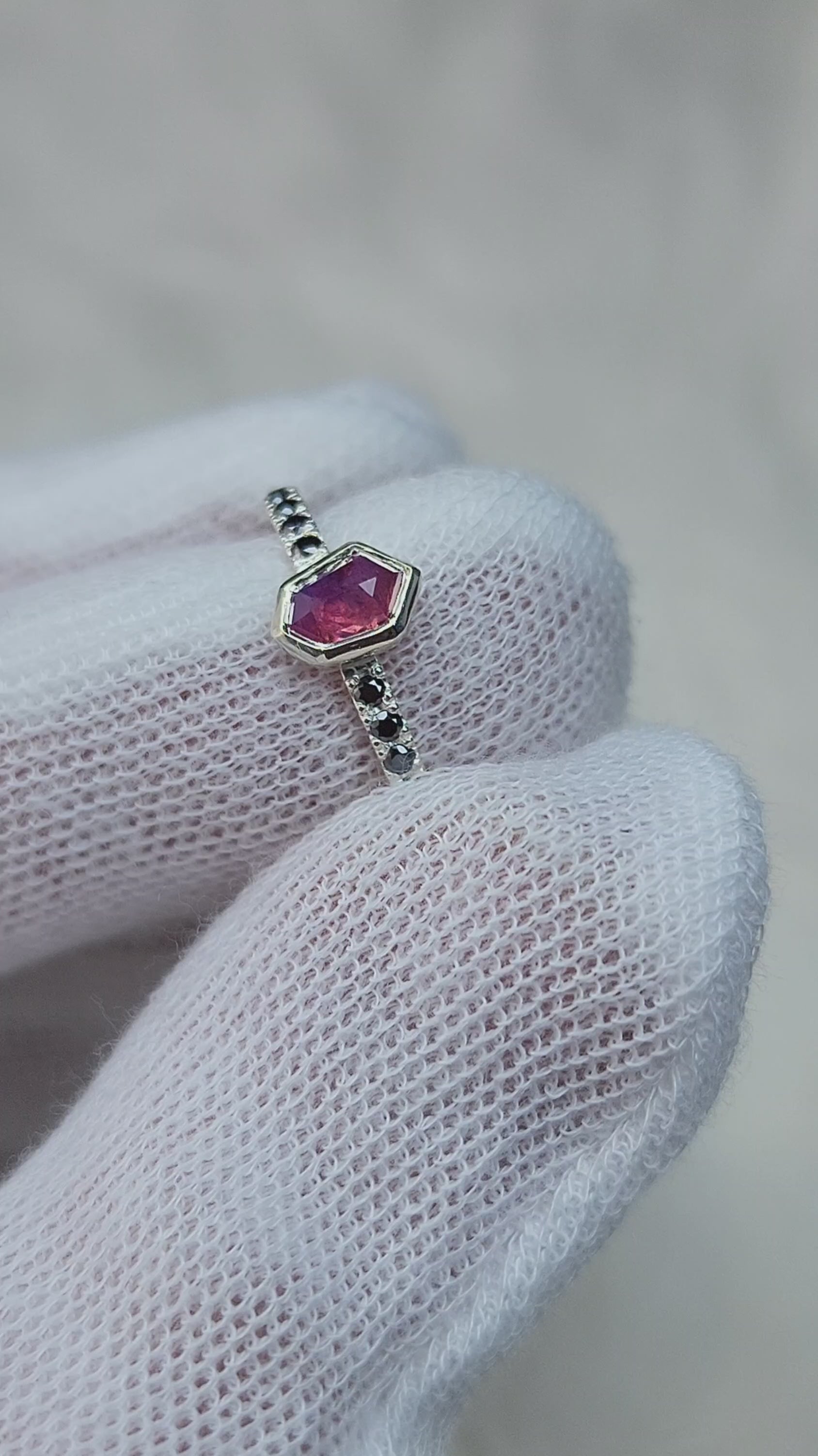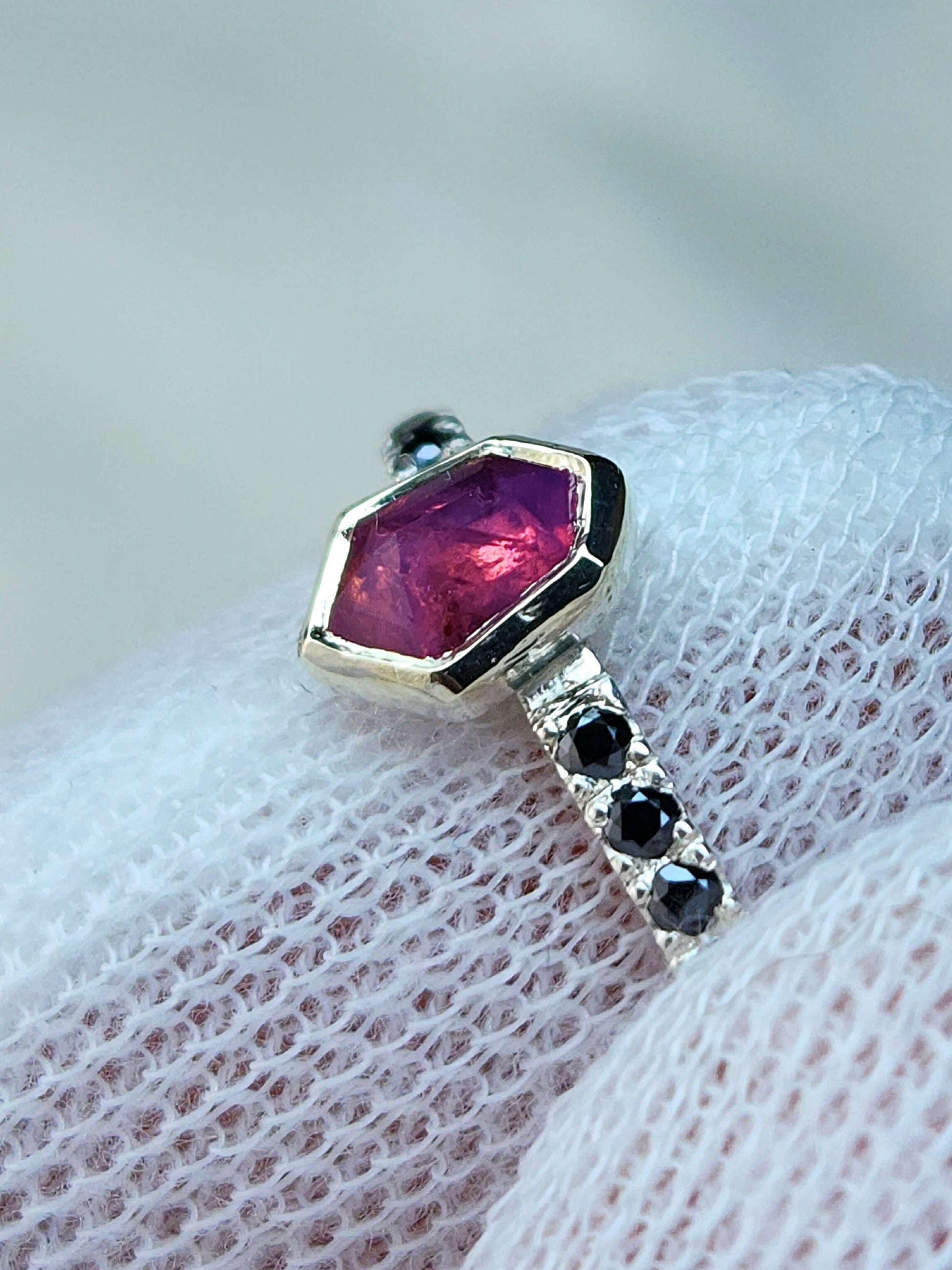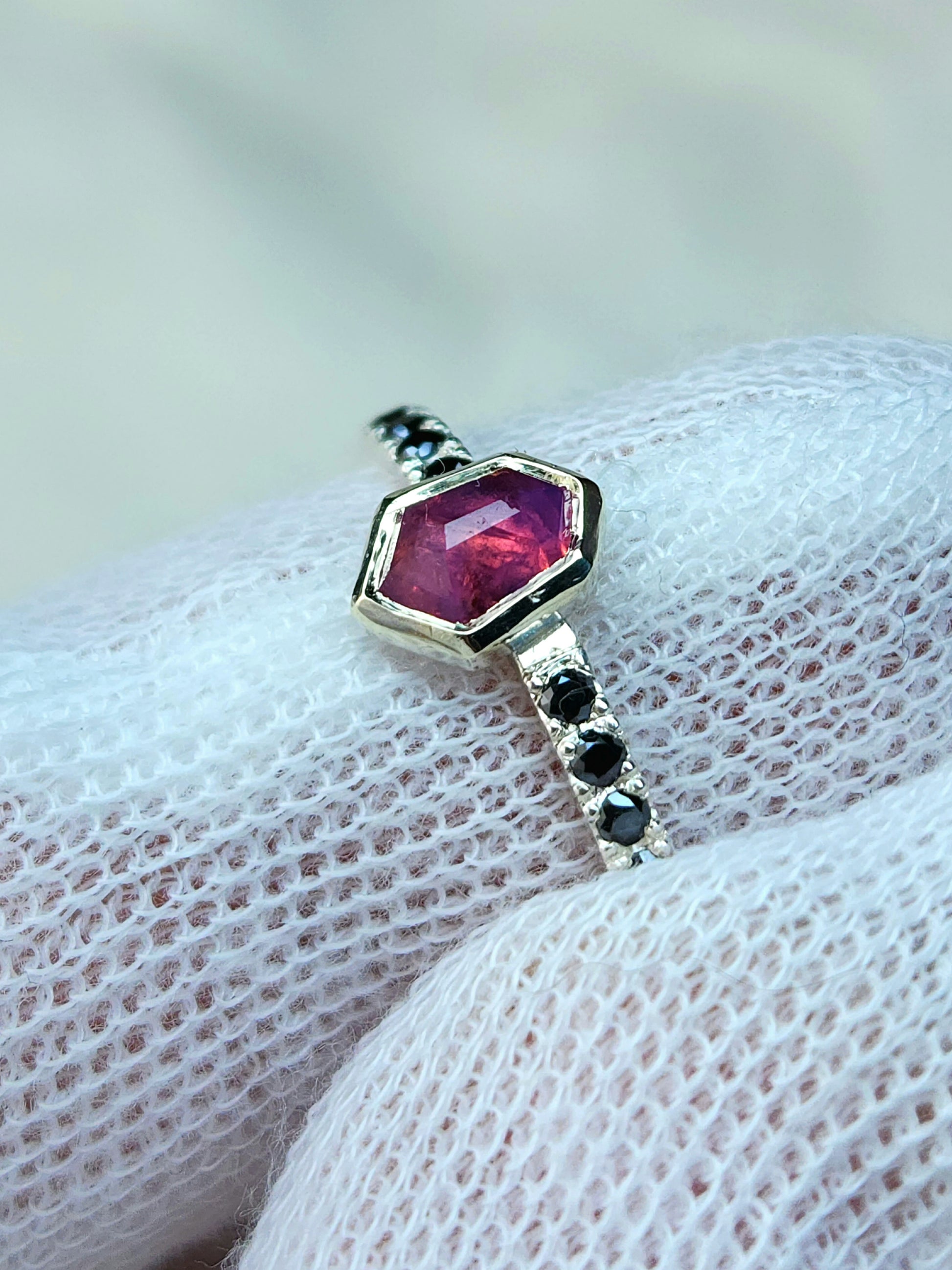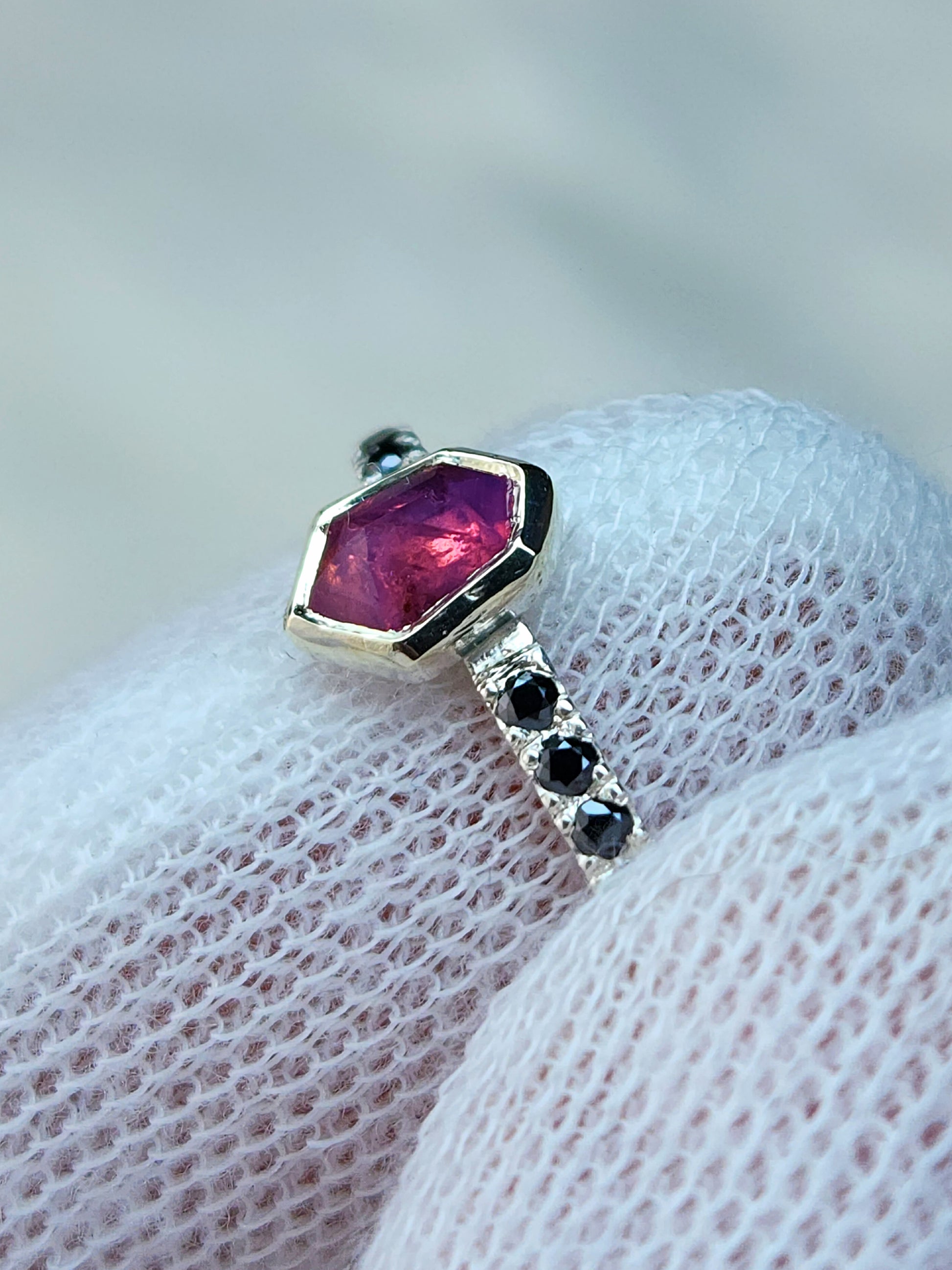 Six 1.5mm black moissanite on each side of the mesmerizing pink sapphire for added contrast and uniqueness. With sapphire being graded a 9 on the mohs scale, and moissanite a 9.5, this ring is ideal for everyday wear. Measurements of this beauty are below: