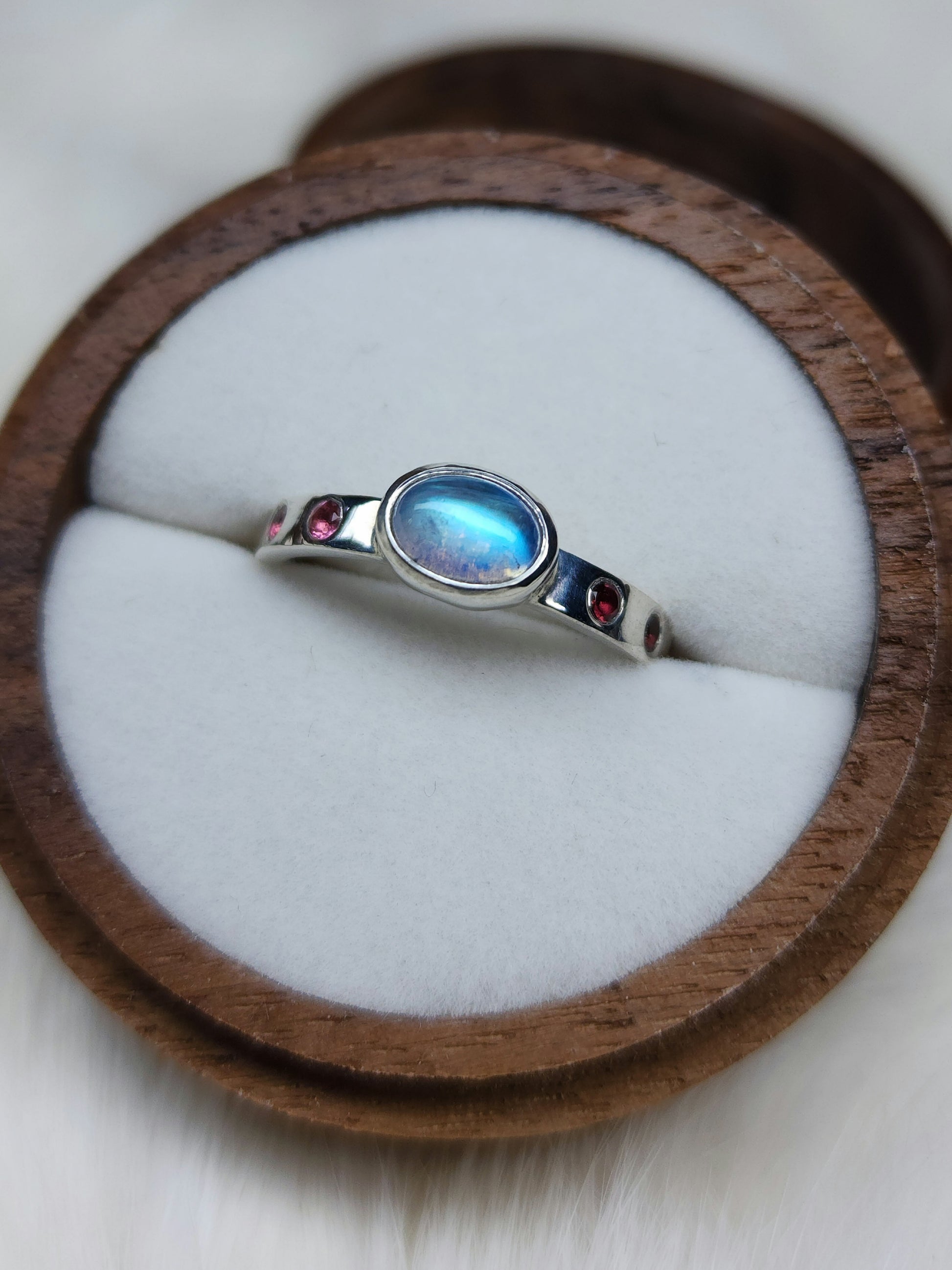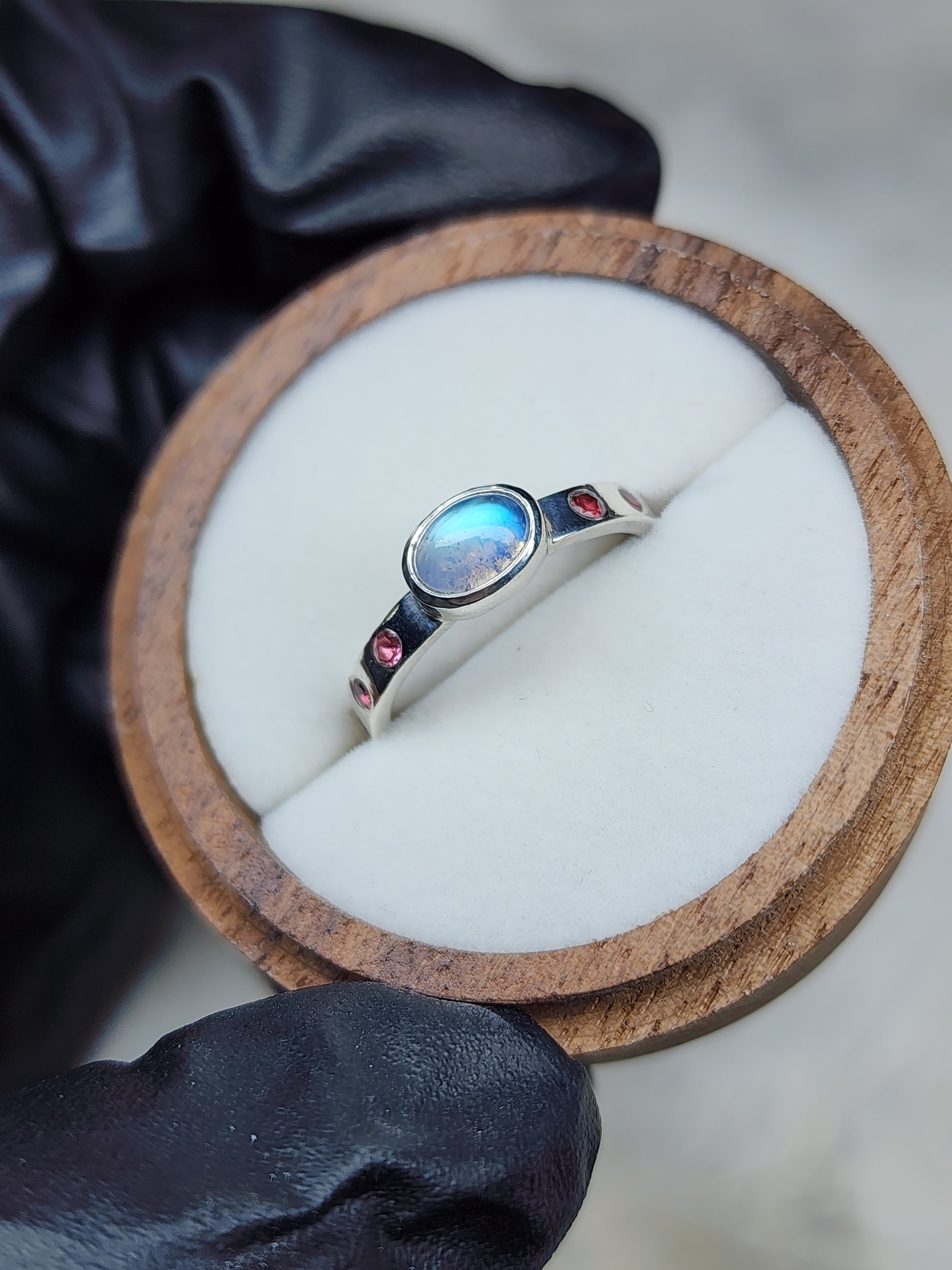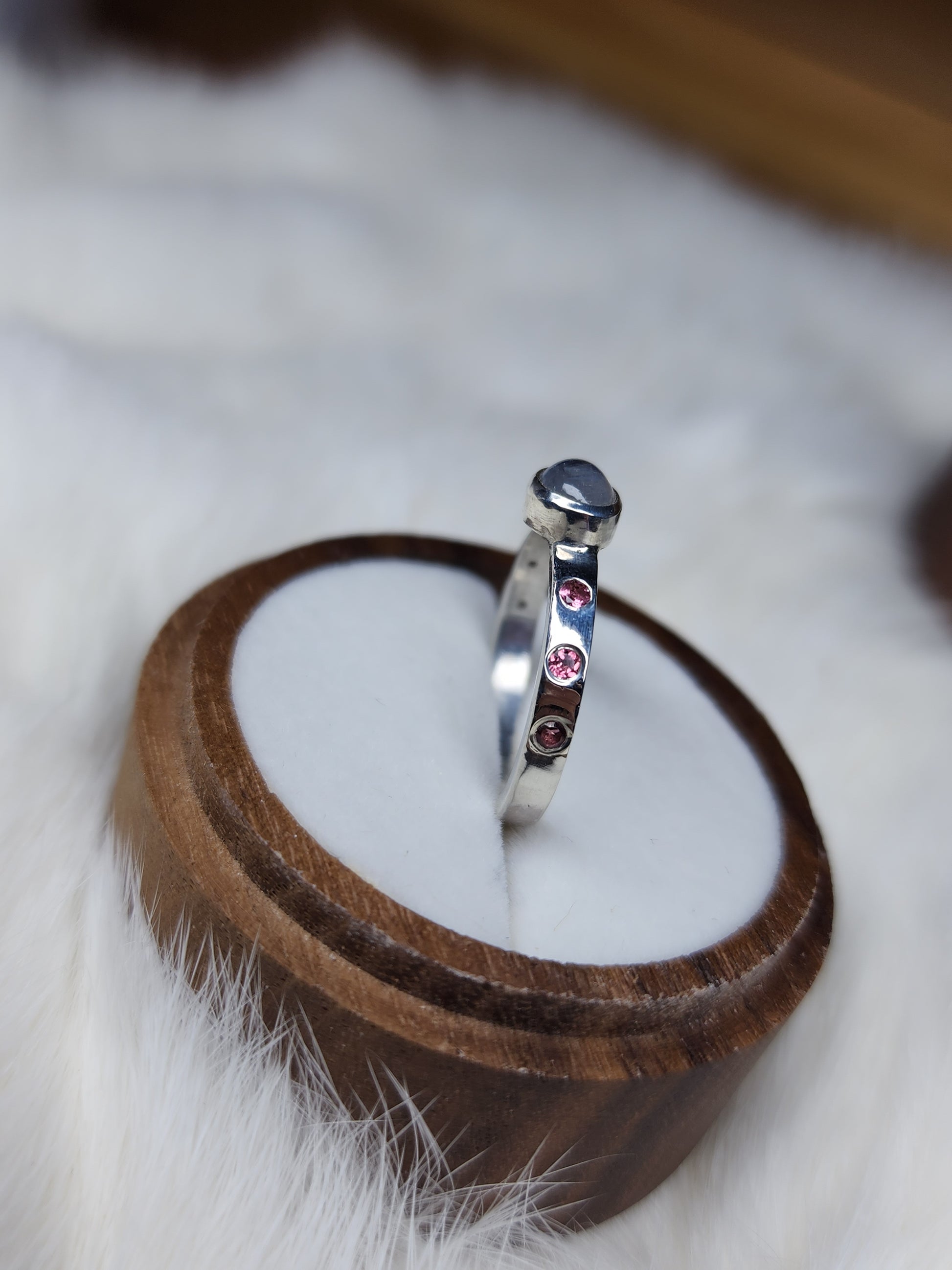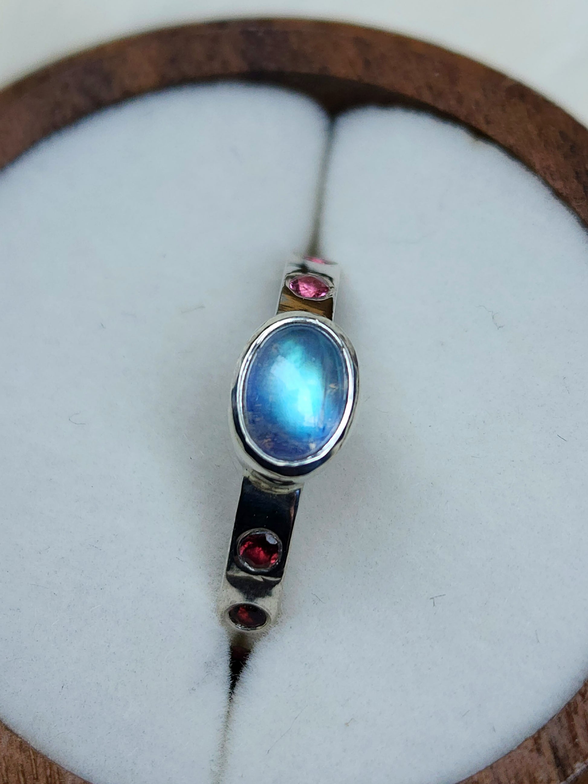 Crafted by hand using solid sterling silver. This ring features 2mm natural pink tourmaline, lined up around a flashy natural moonstone.