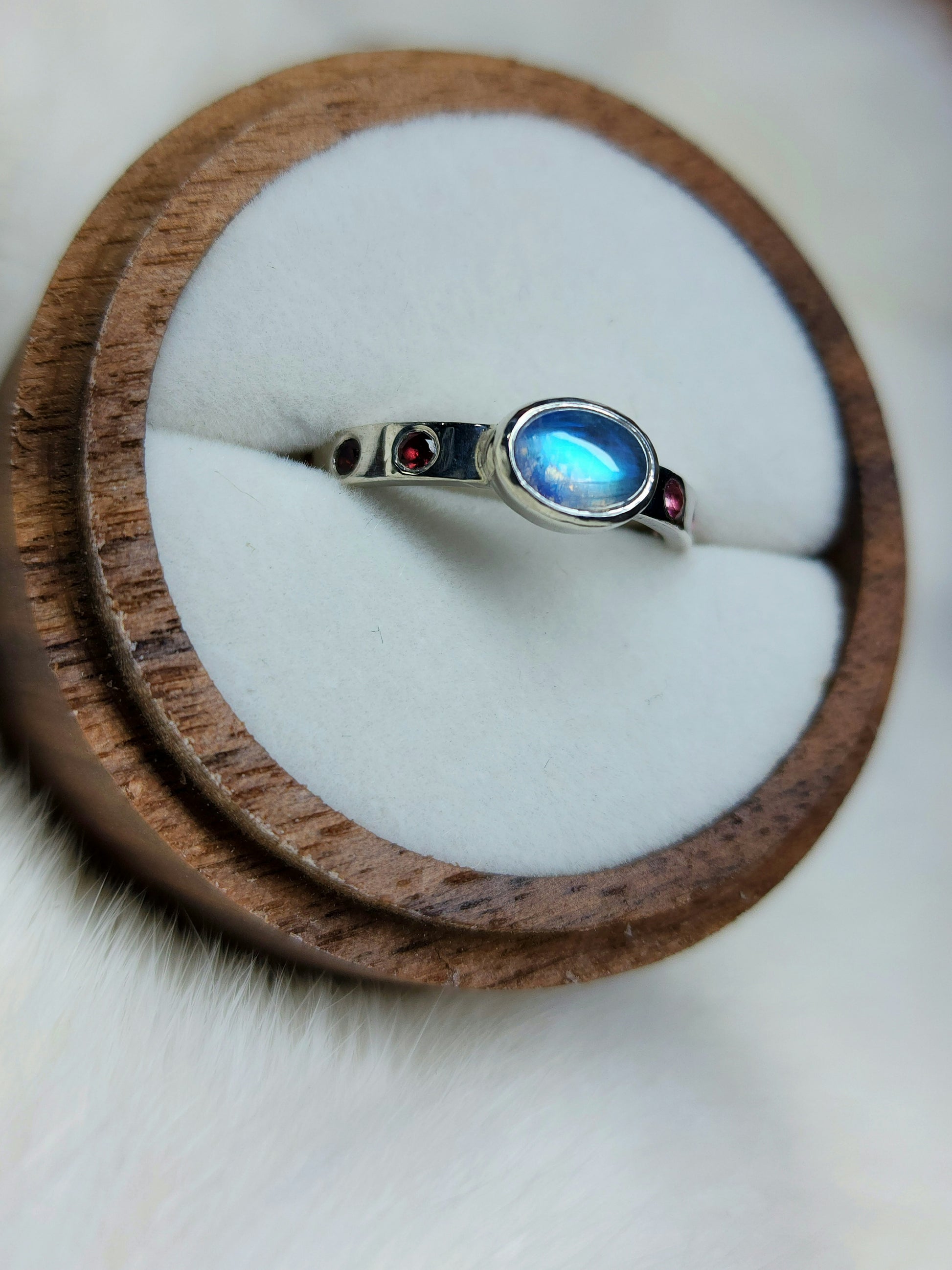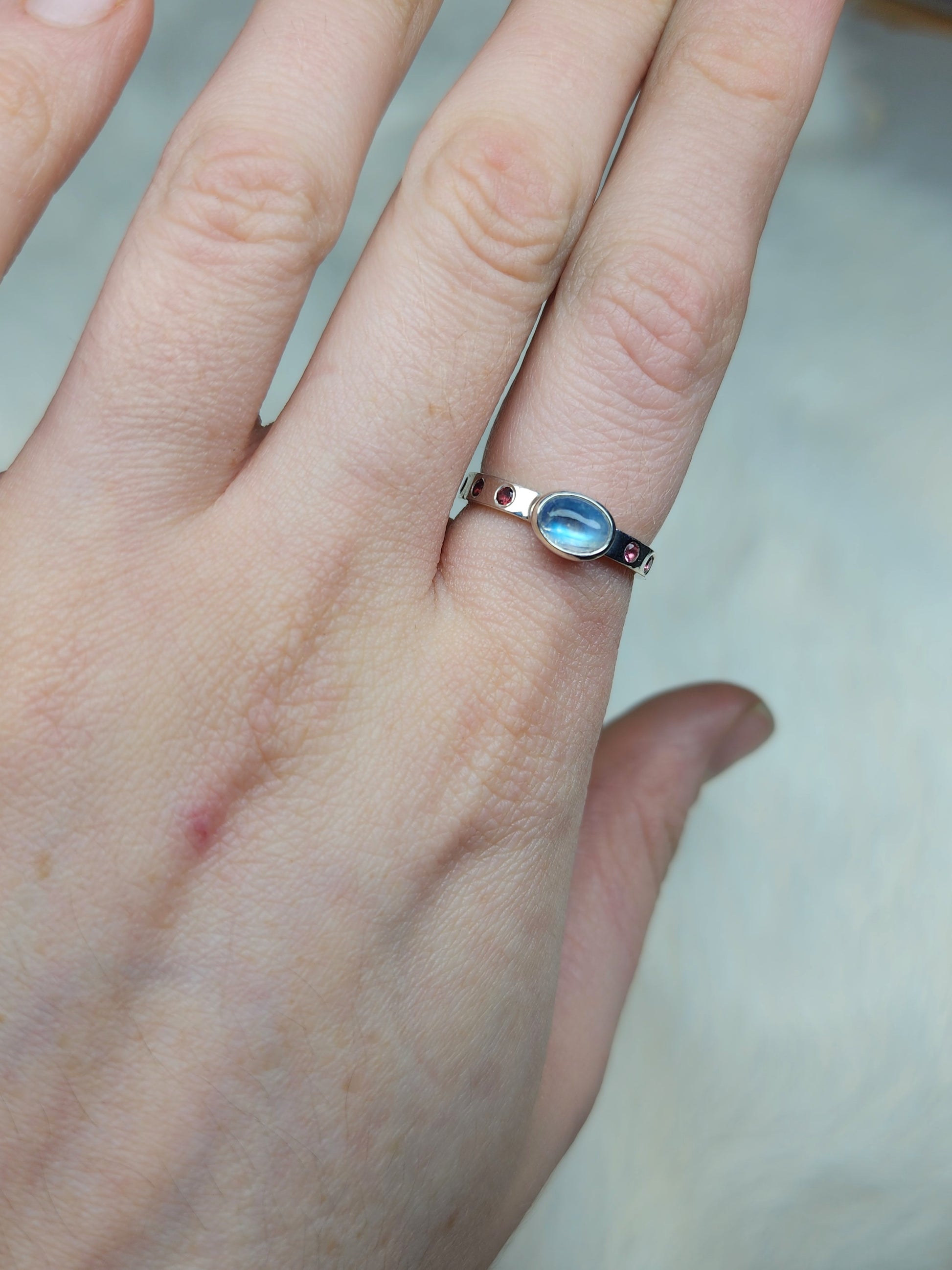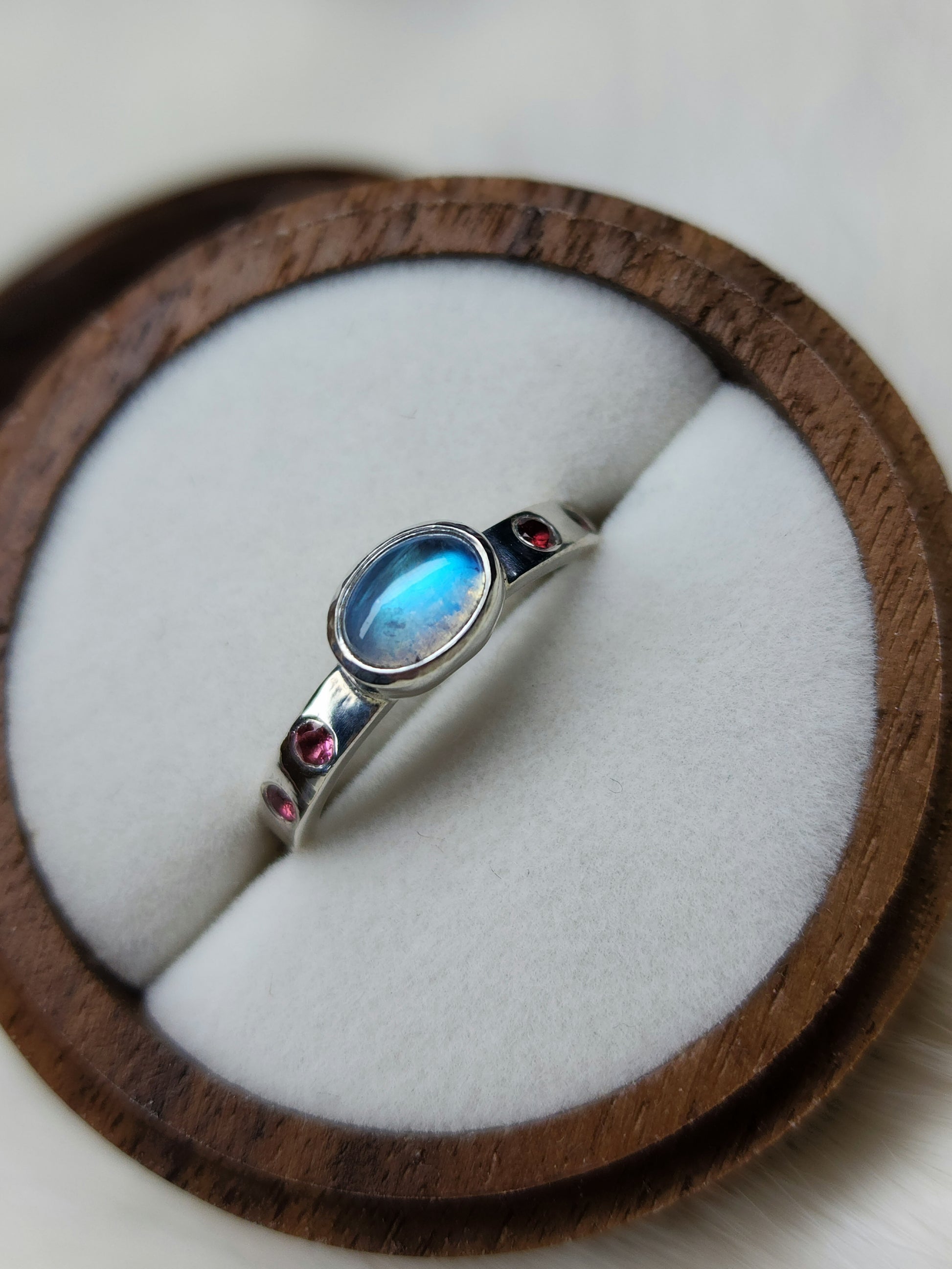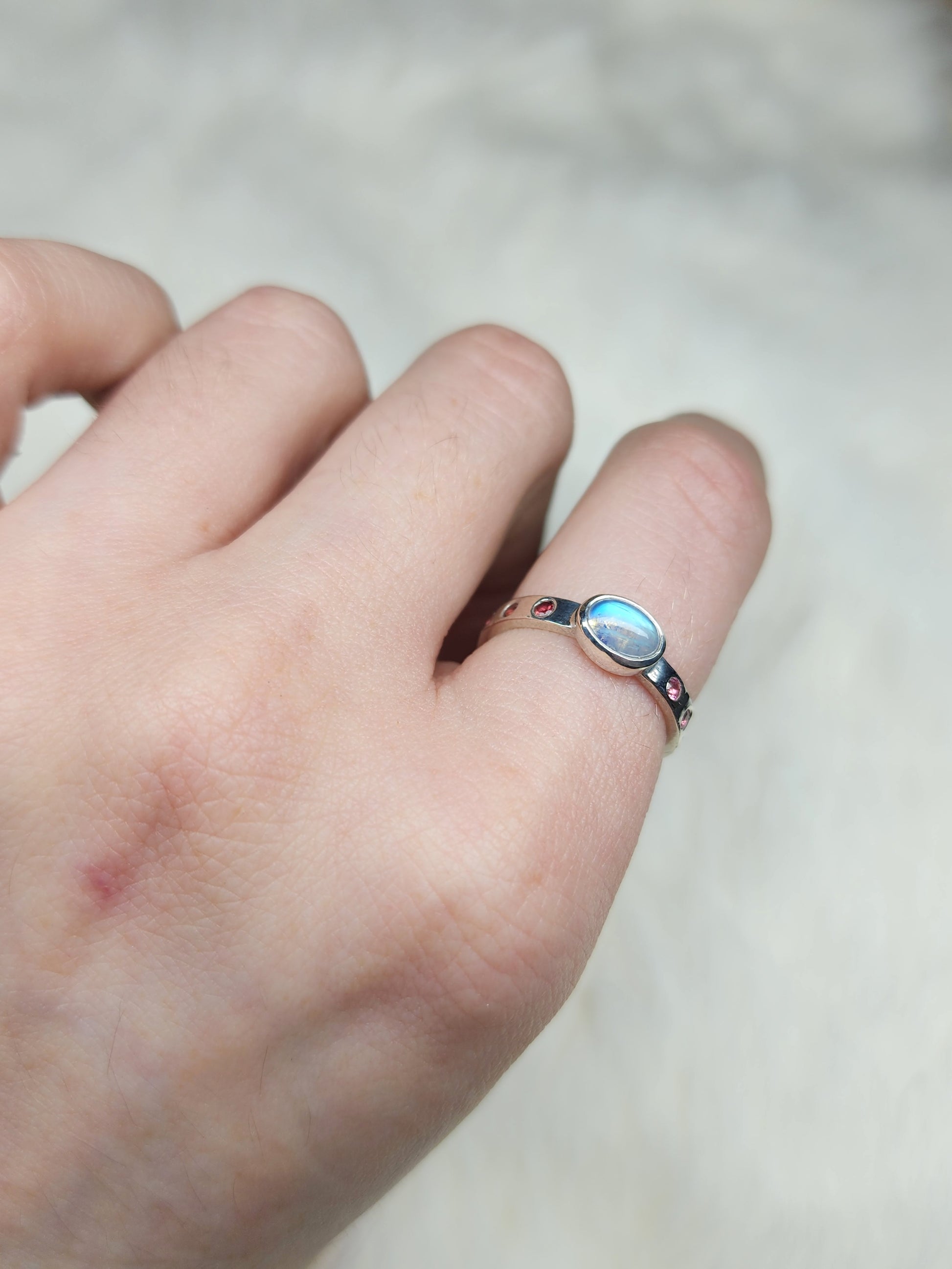 Crafted by hand using solid sterling silver. This ring features 2mm natural pink tourmaline, lined up around a flashy natural moonstone.