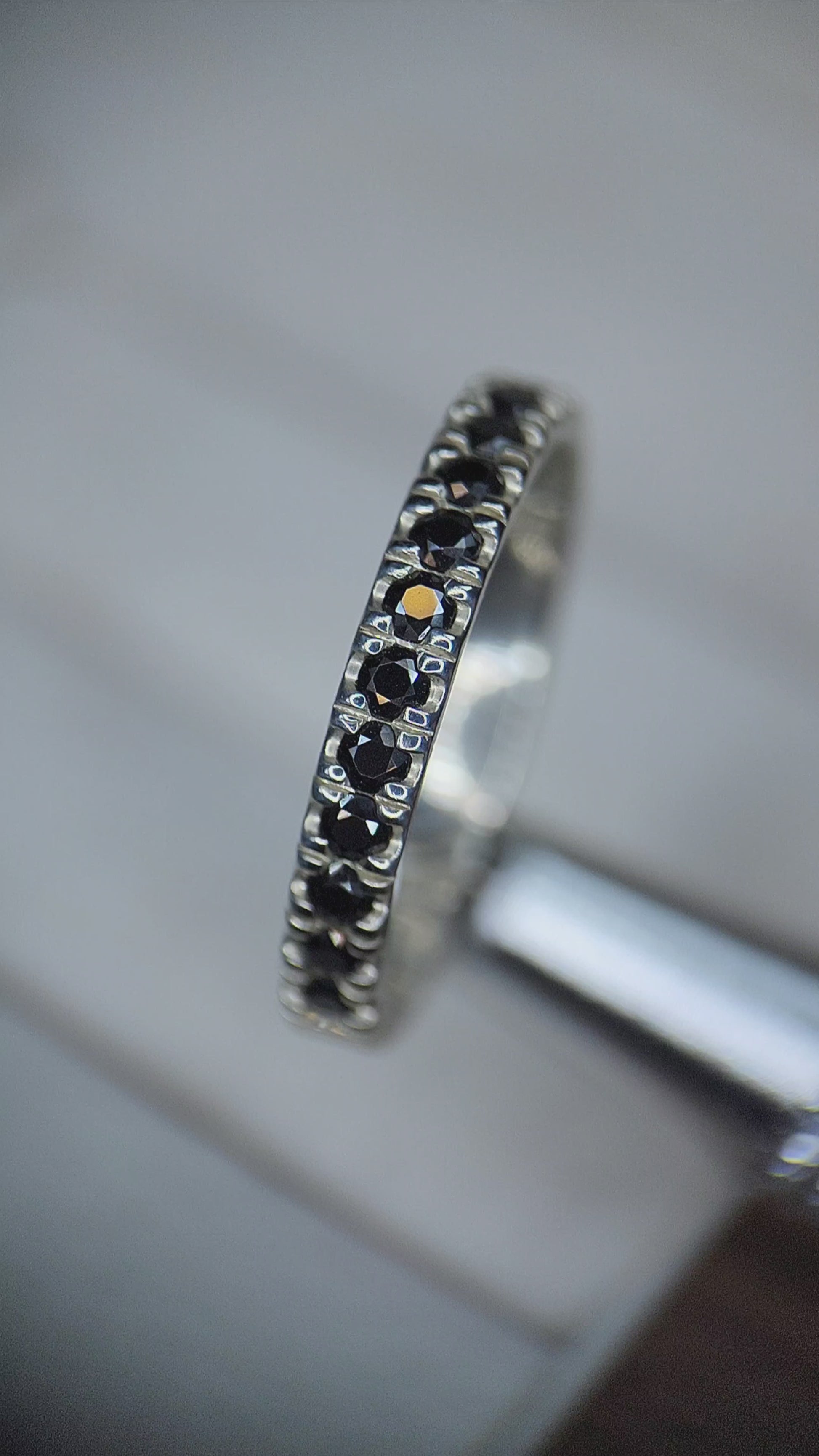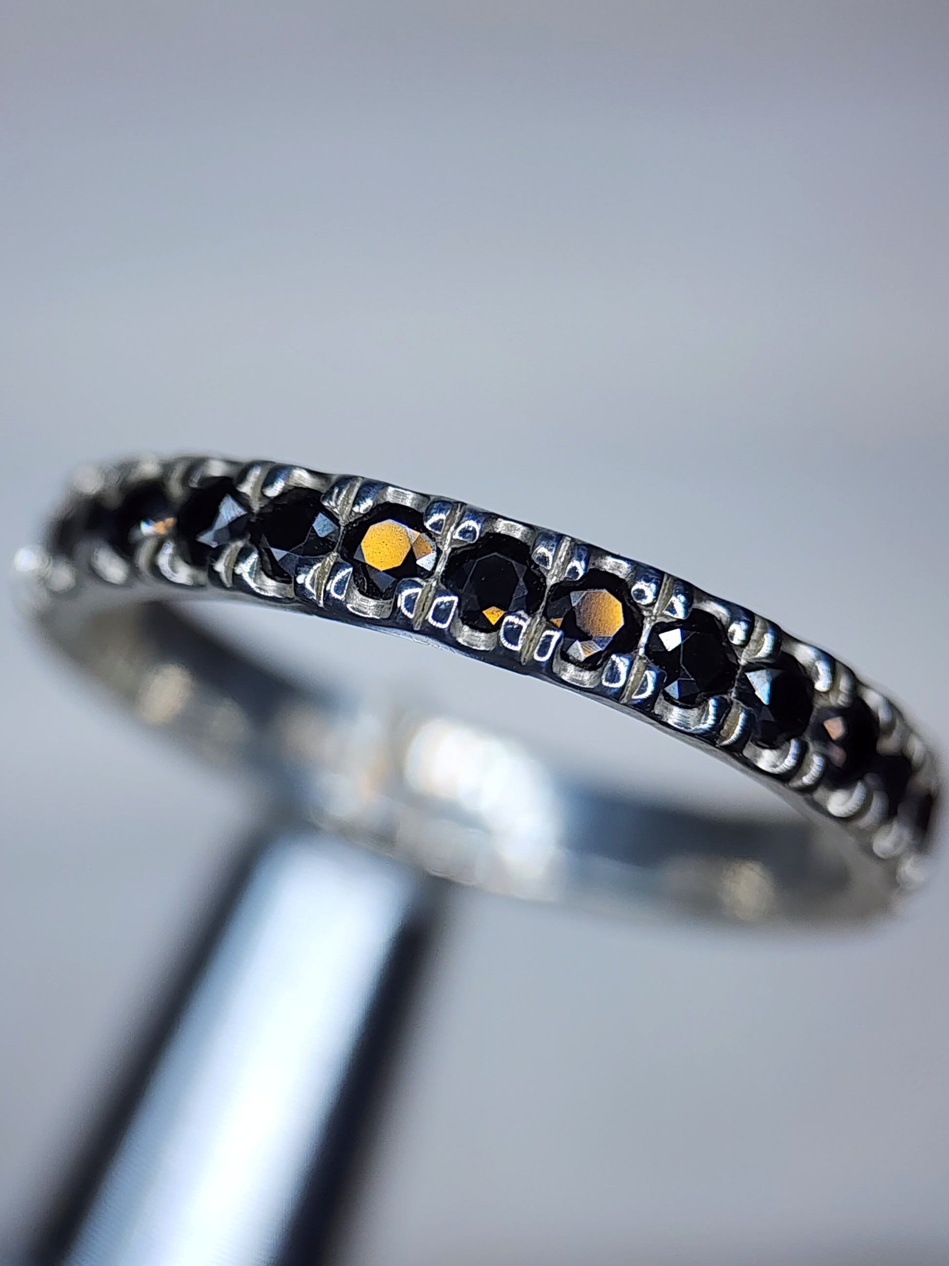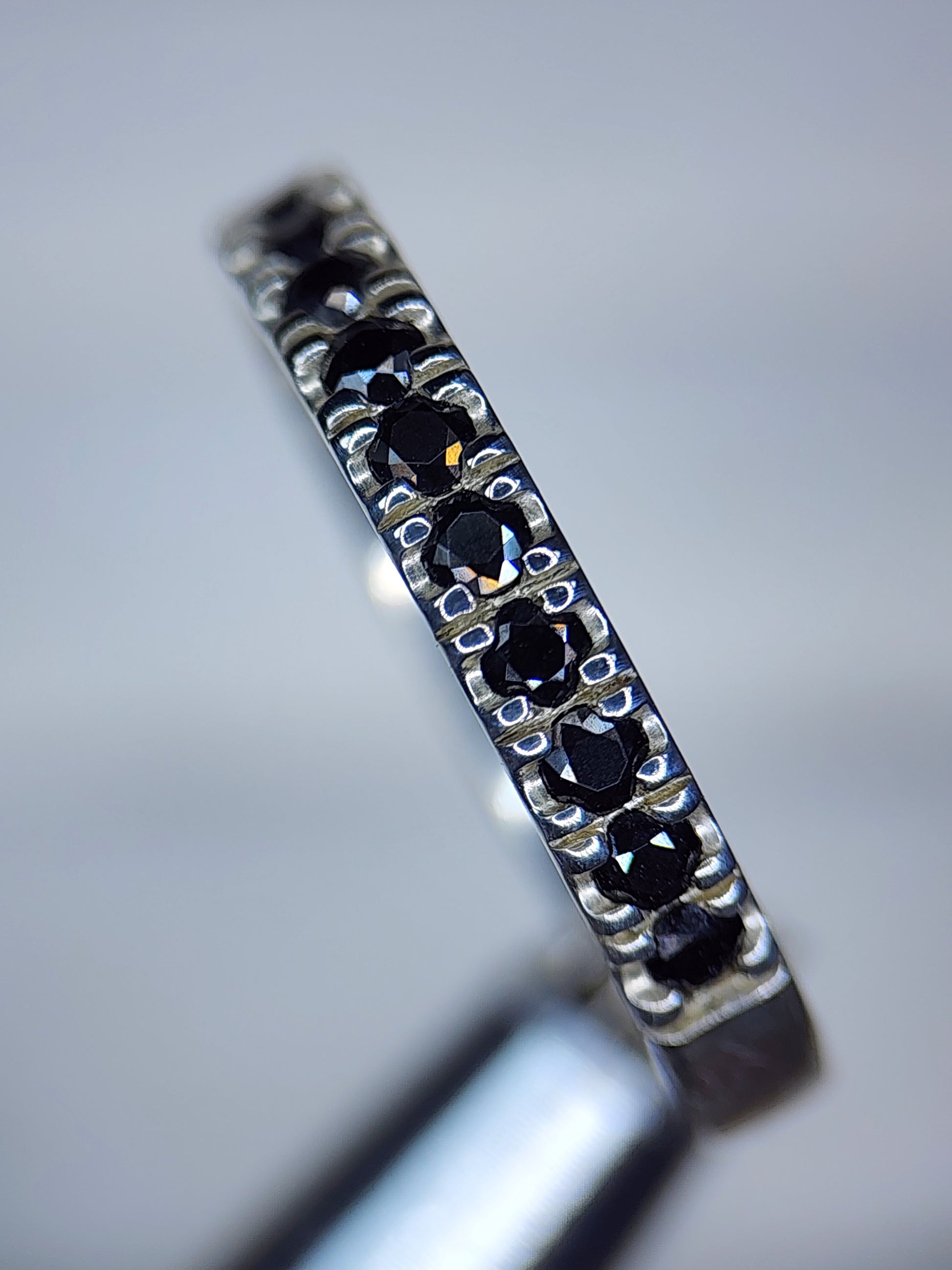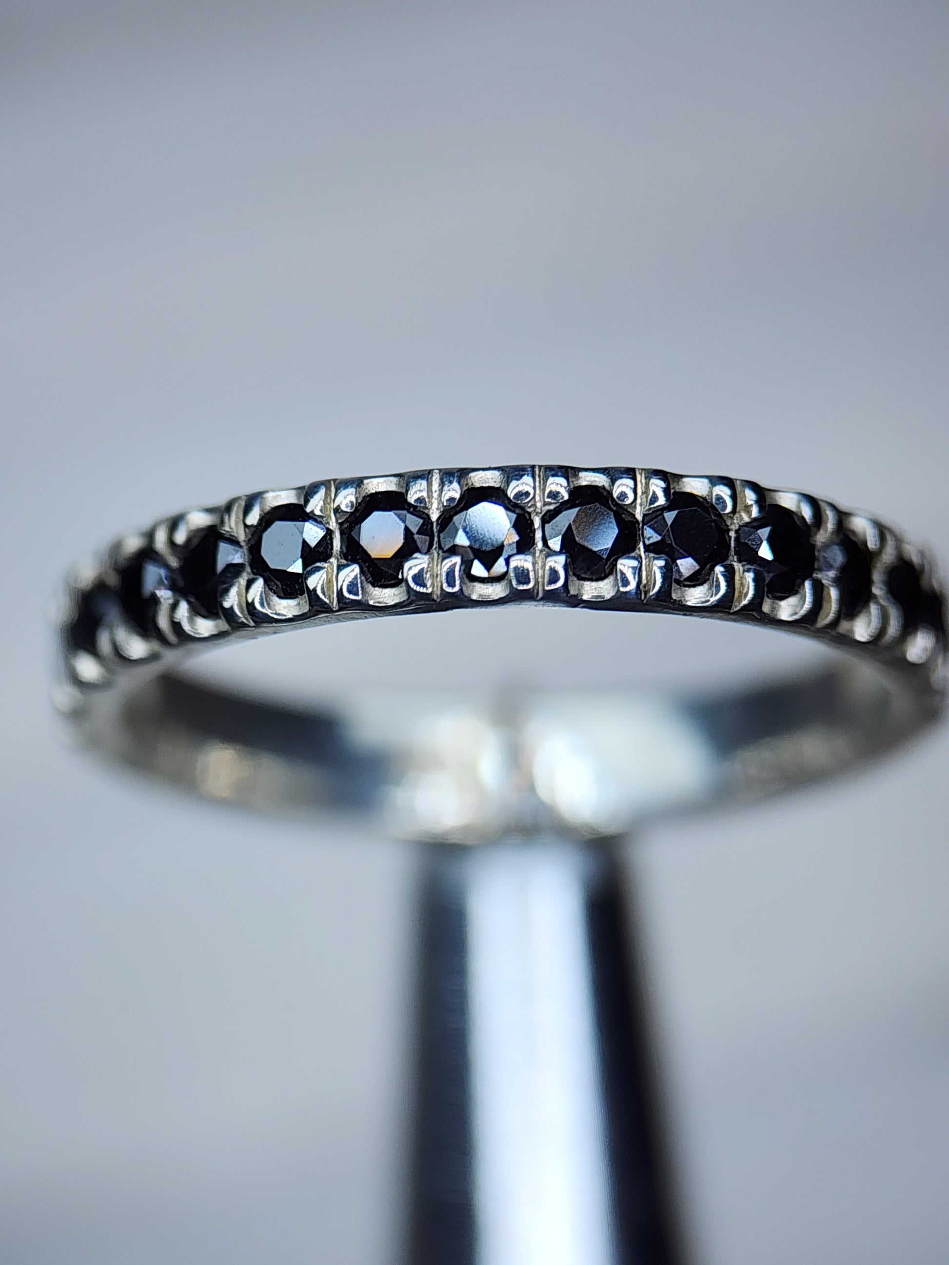 This specific ring is made with 2mm black moissanite. The number of stones will depend on the size of the ring, since it is made to cover a bit over half of the finger, appearing as an eternity band, but without the discomfort.