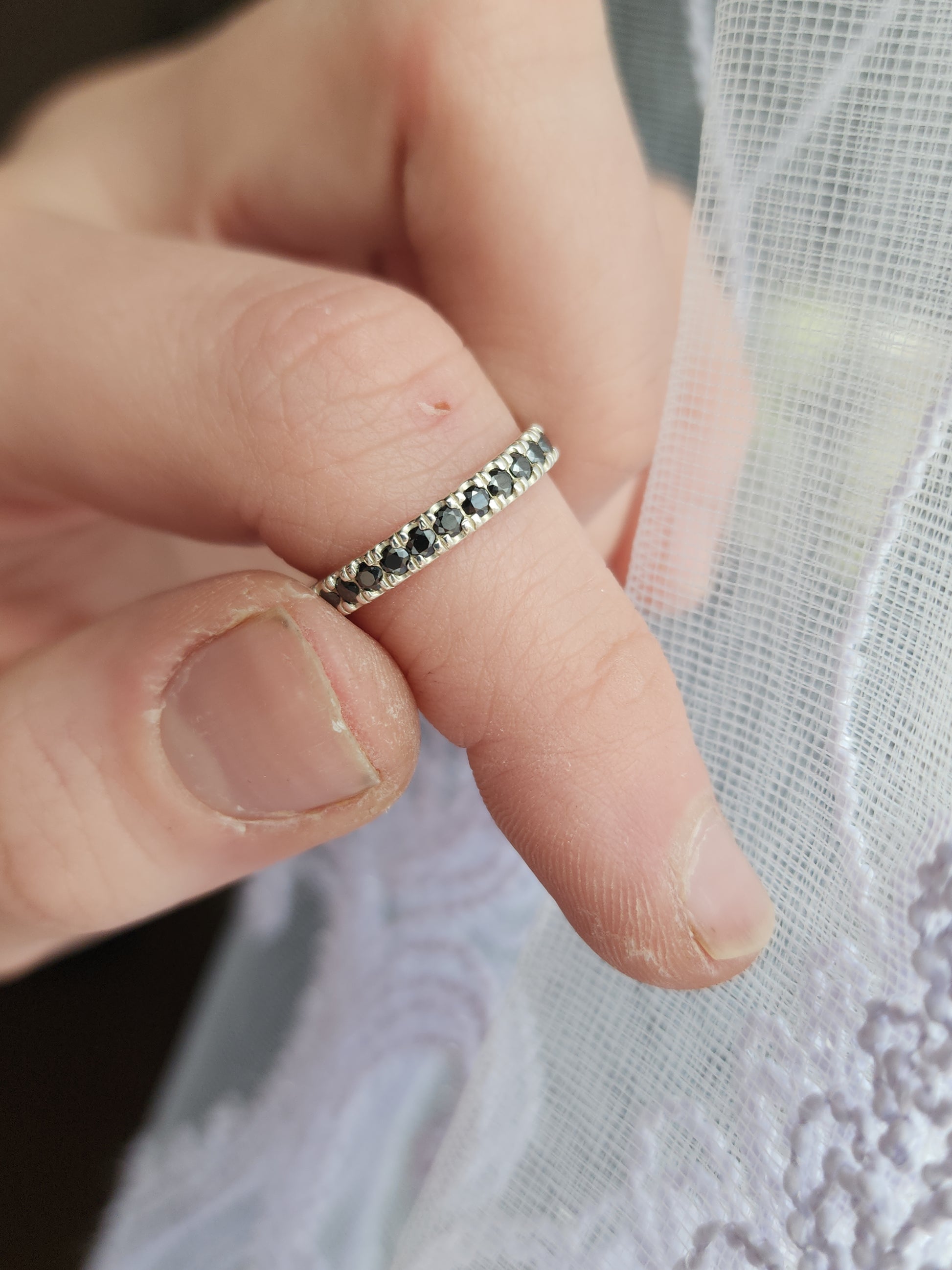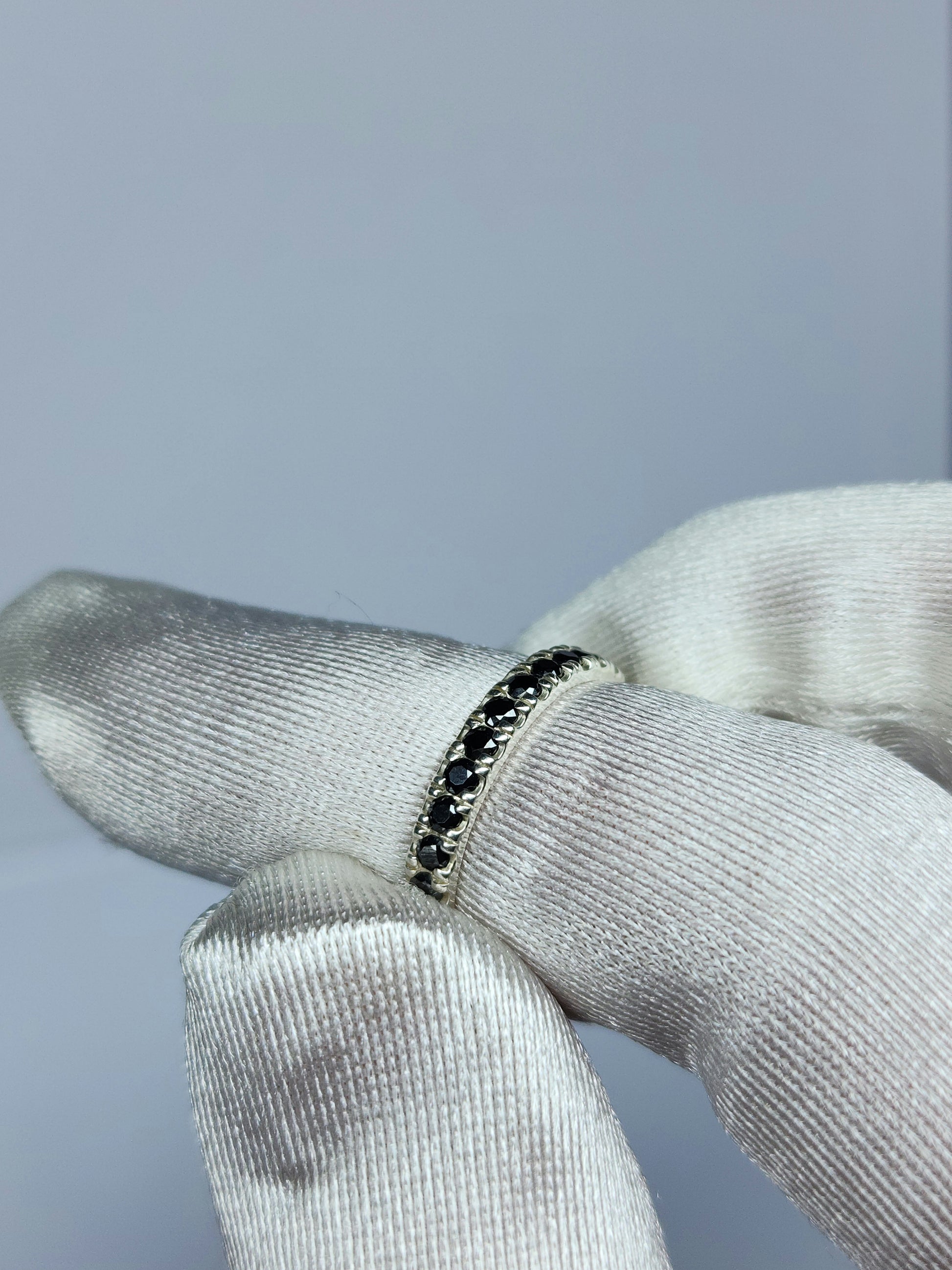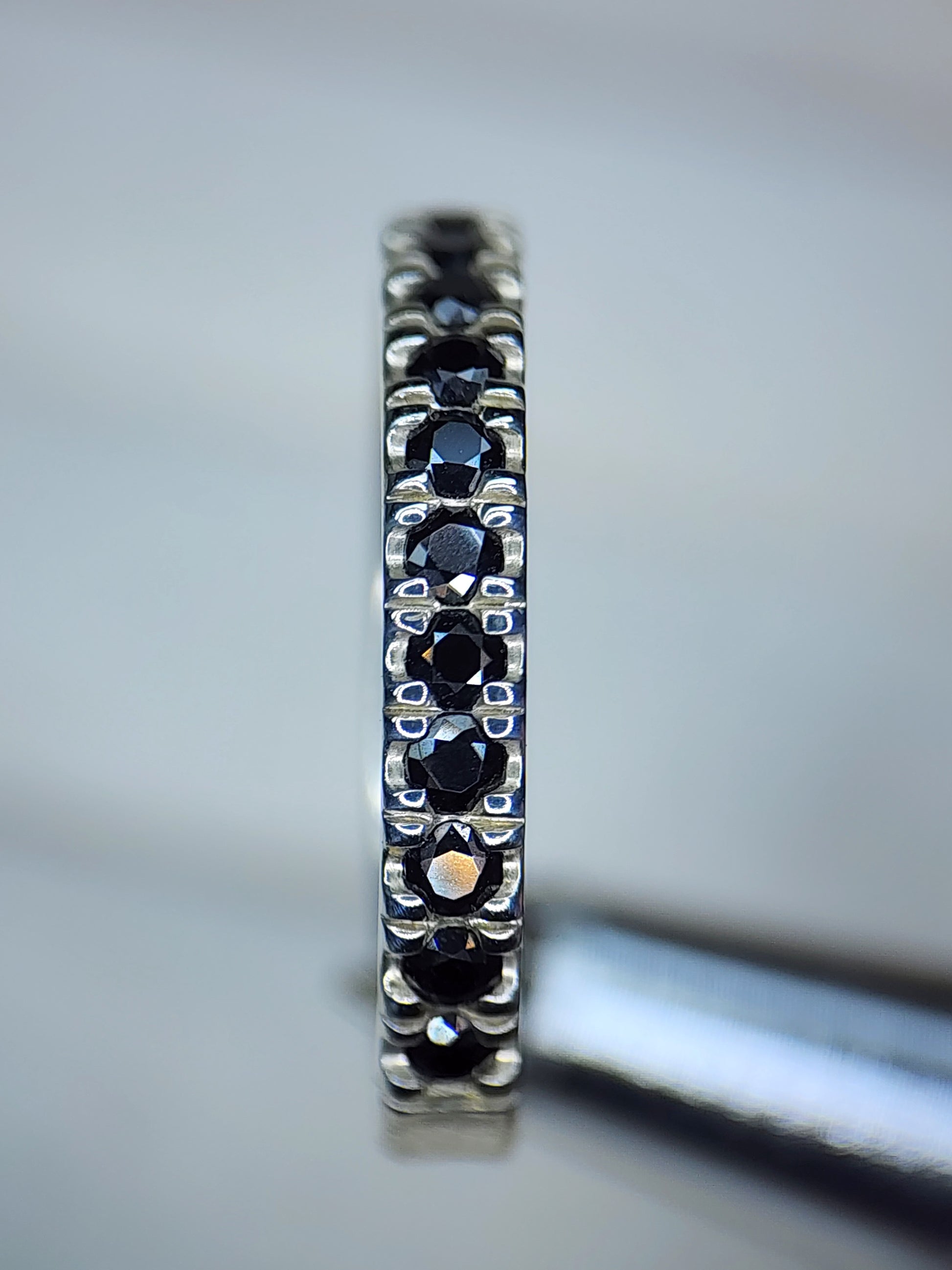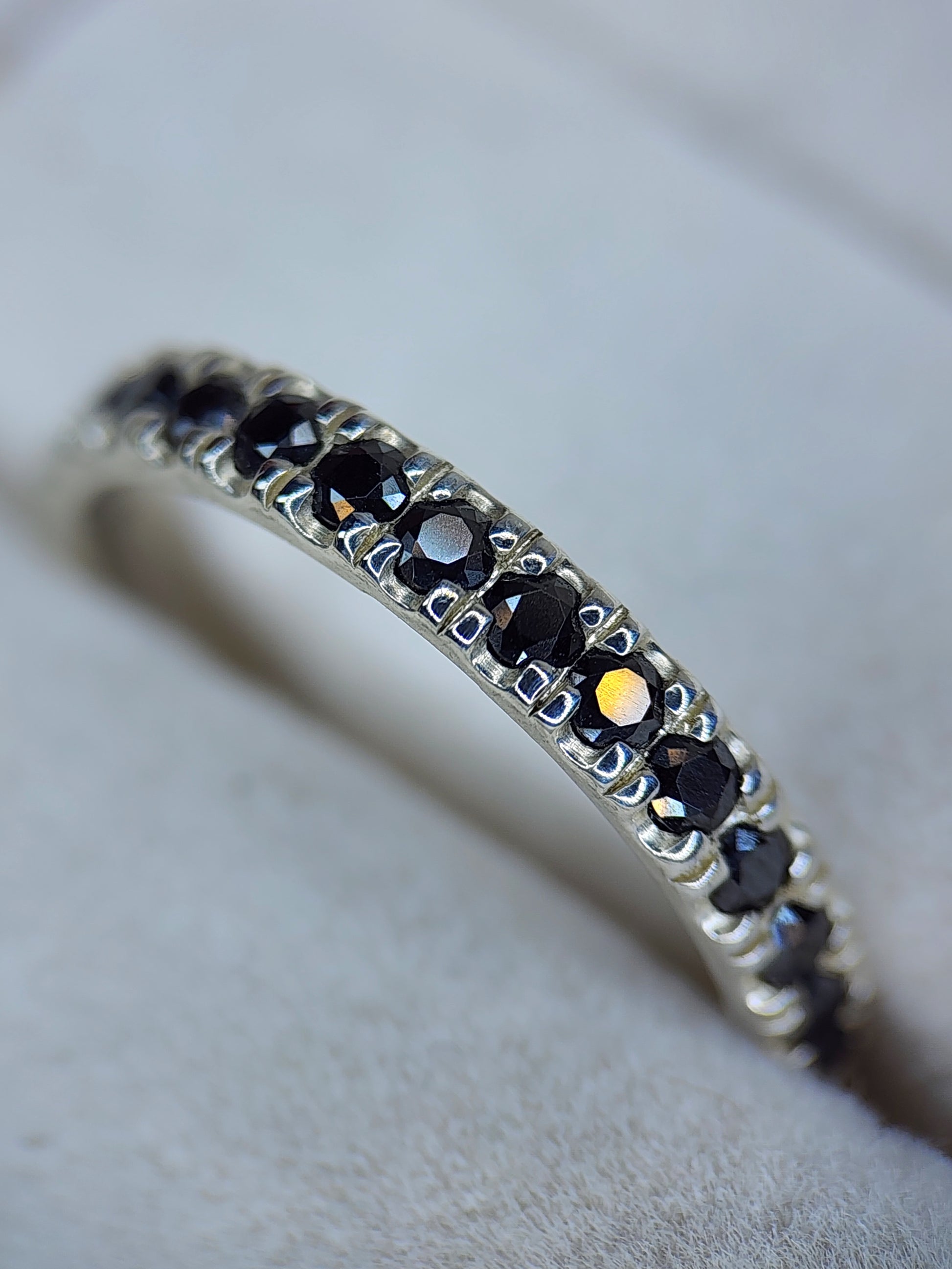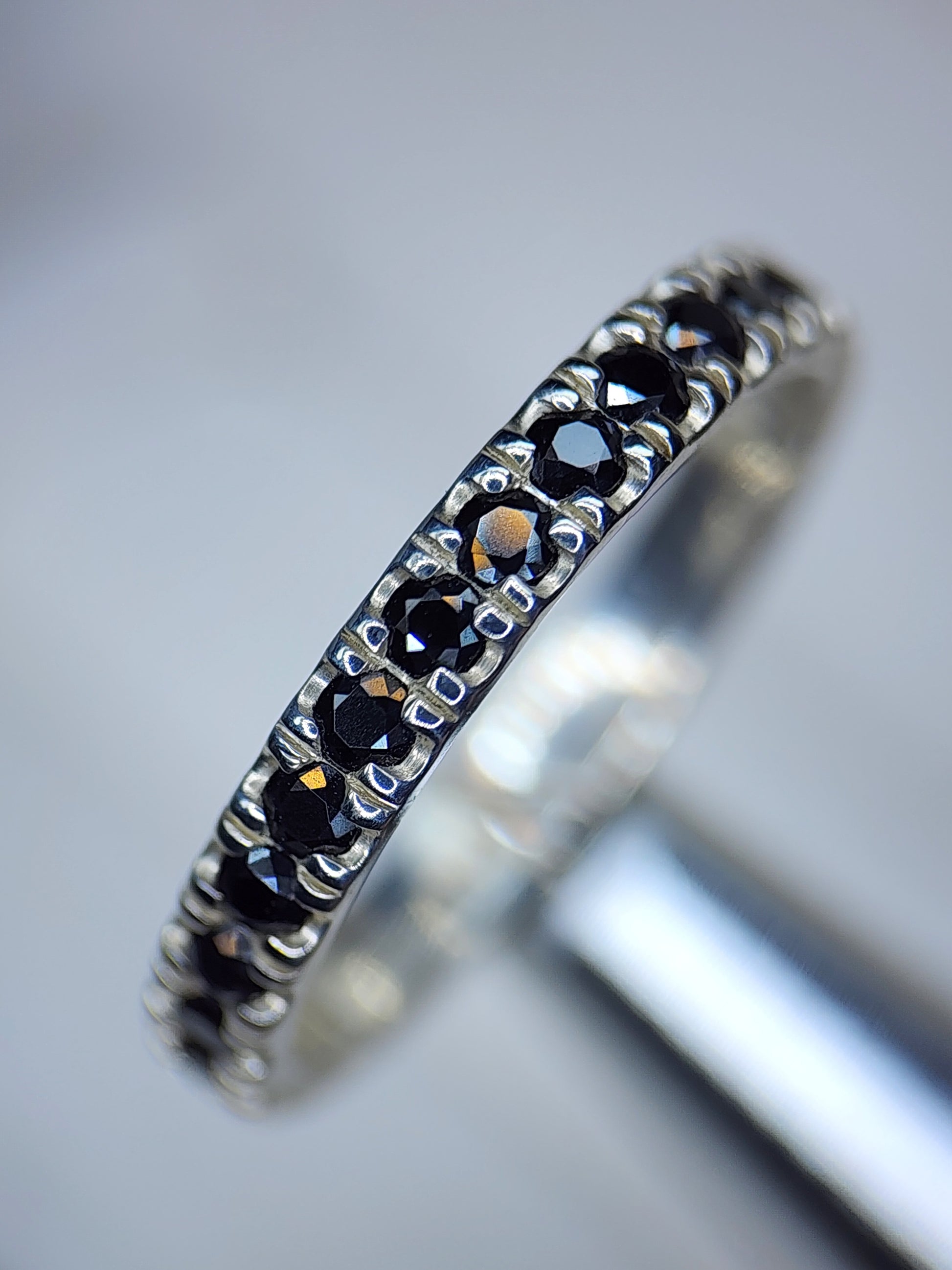 This specific ring is made with 2mm black moissanite. The number of stones will depend on the size of the ring, since it is made to cover a bit over half of the finger, appearing as an eternity band, but without the discomfort.