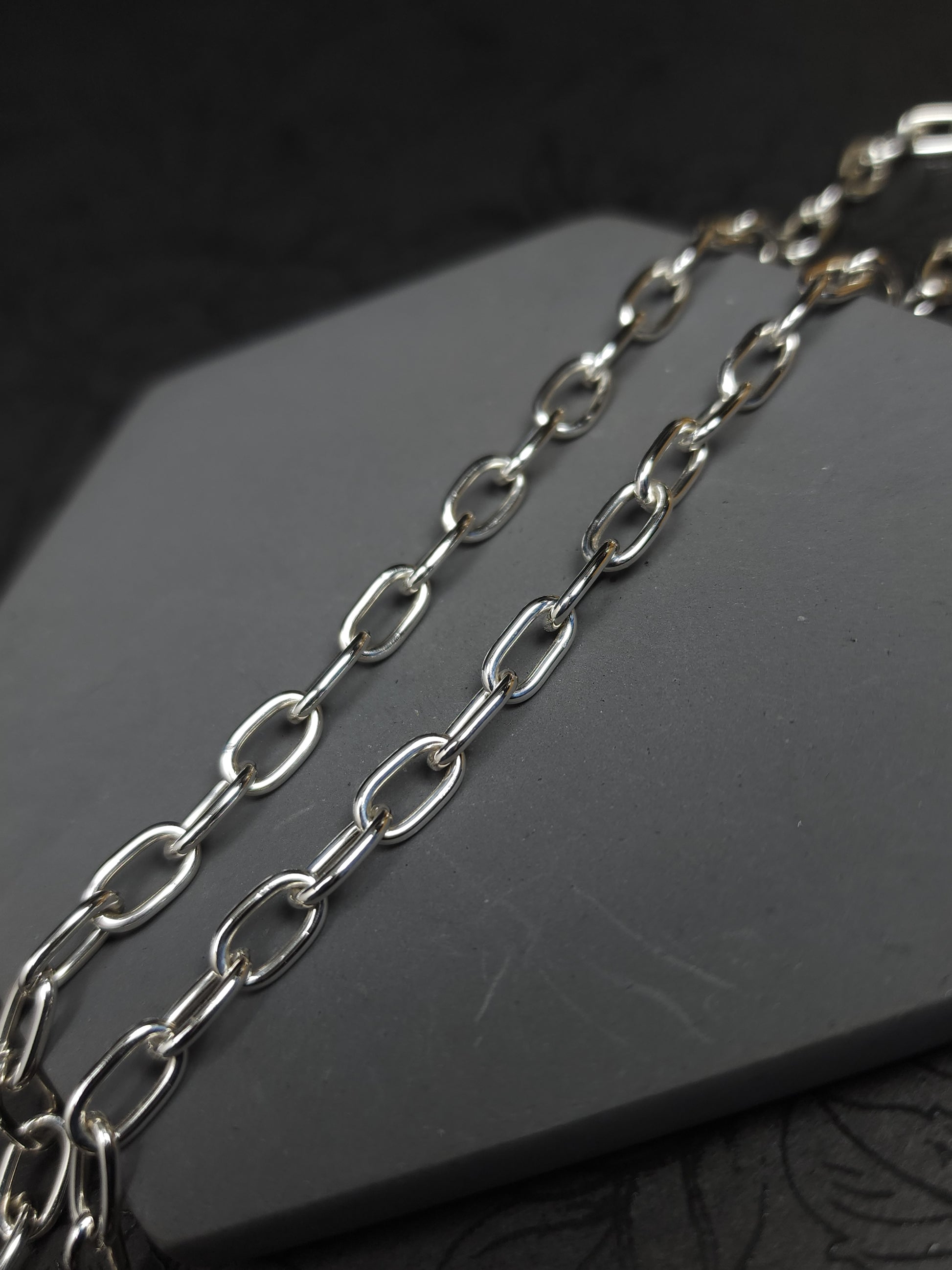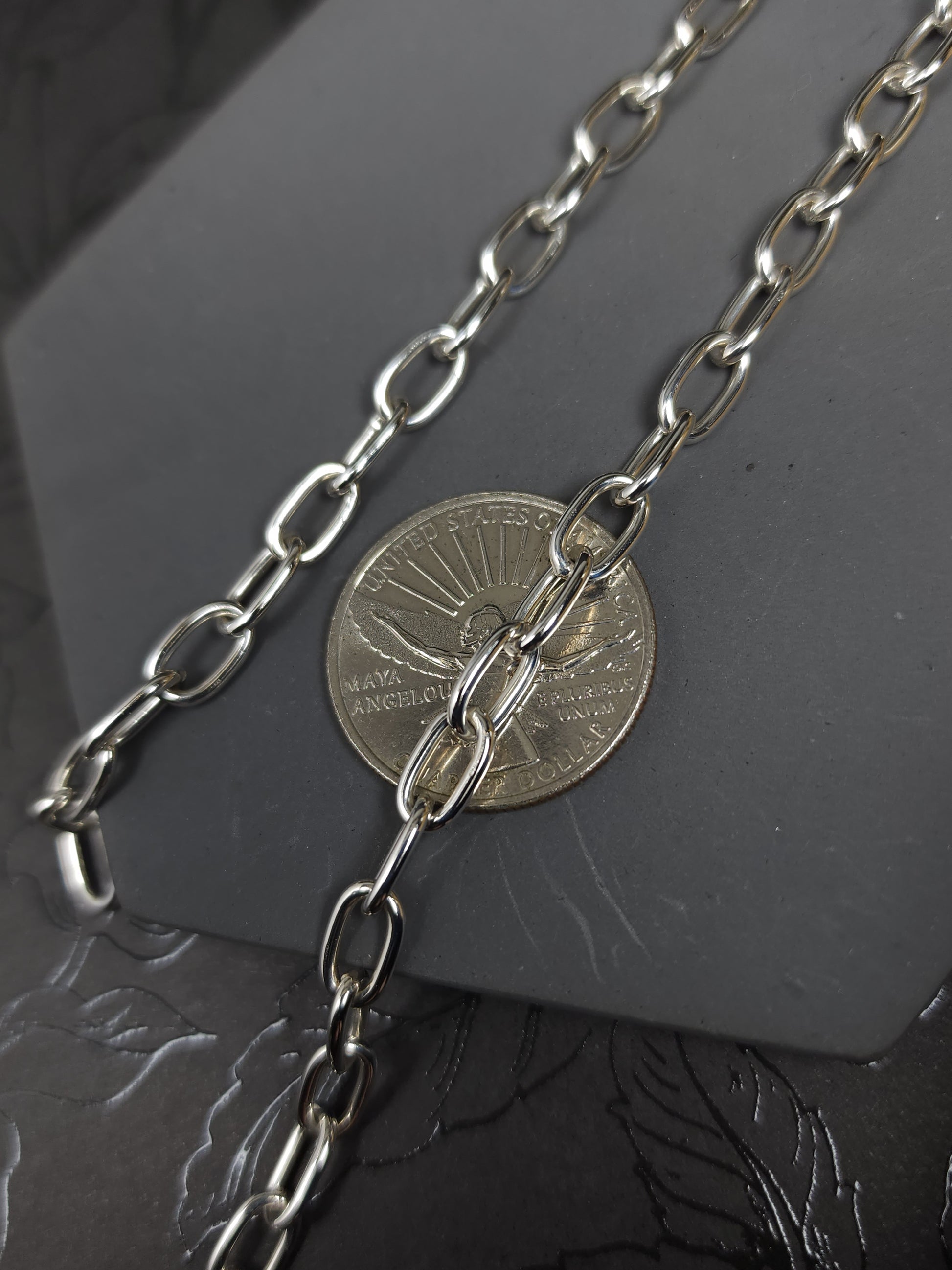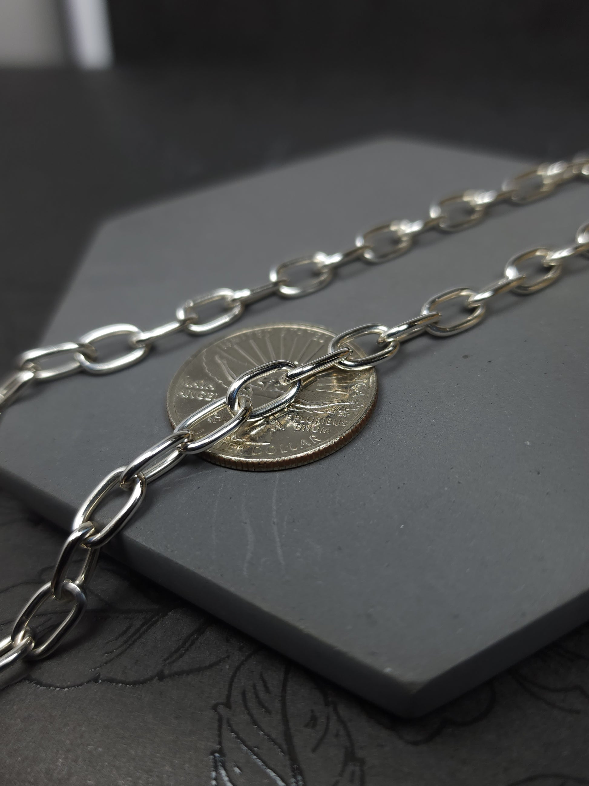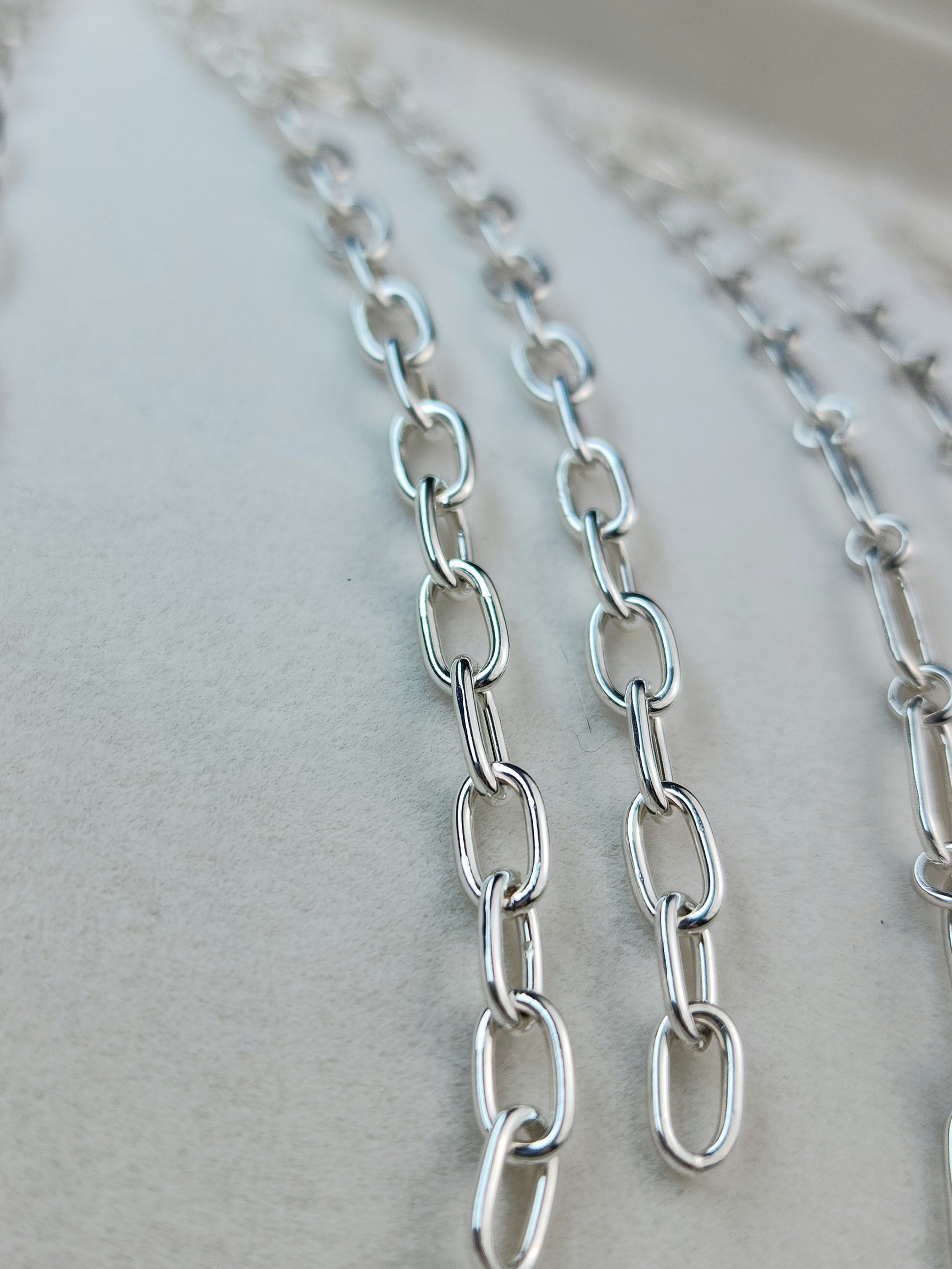 Paperclip handmade sterling silver chain, typical oval links, hand fabricated using traditional silversmithing techniques. It started with round wire that has been formed to desired thickness and wrapped around a mandrel. After removing the coil from the mandrel, I clean it and saw though it to create individual links. Once I have all silver dust removed from all the links & cleaned up, I then assemble them one by one. When the desired length is met, each joint is individually soldered. The chain is then polished, tumbled and ready. (These are not all the steps, just the ones I think I can fit in the description 😅). The ends of this chain are open, meaning there is no clasp attached. I designed it this way because I want to allow you the option to select the clasp you like most. Please remember to select a clasp you would like to go with this chain.