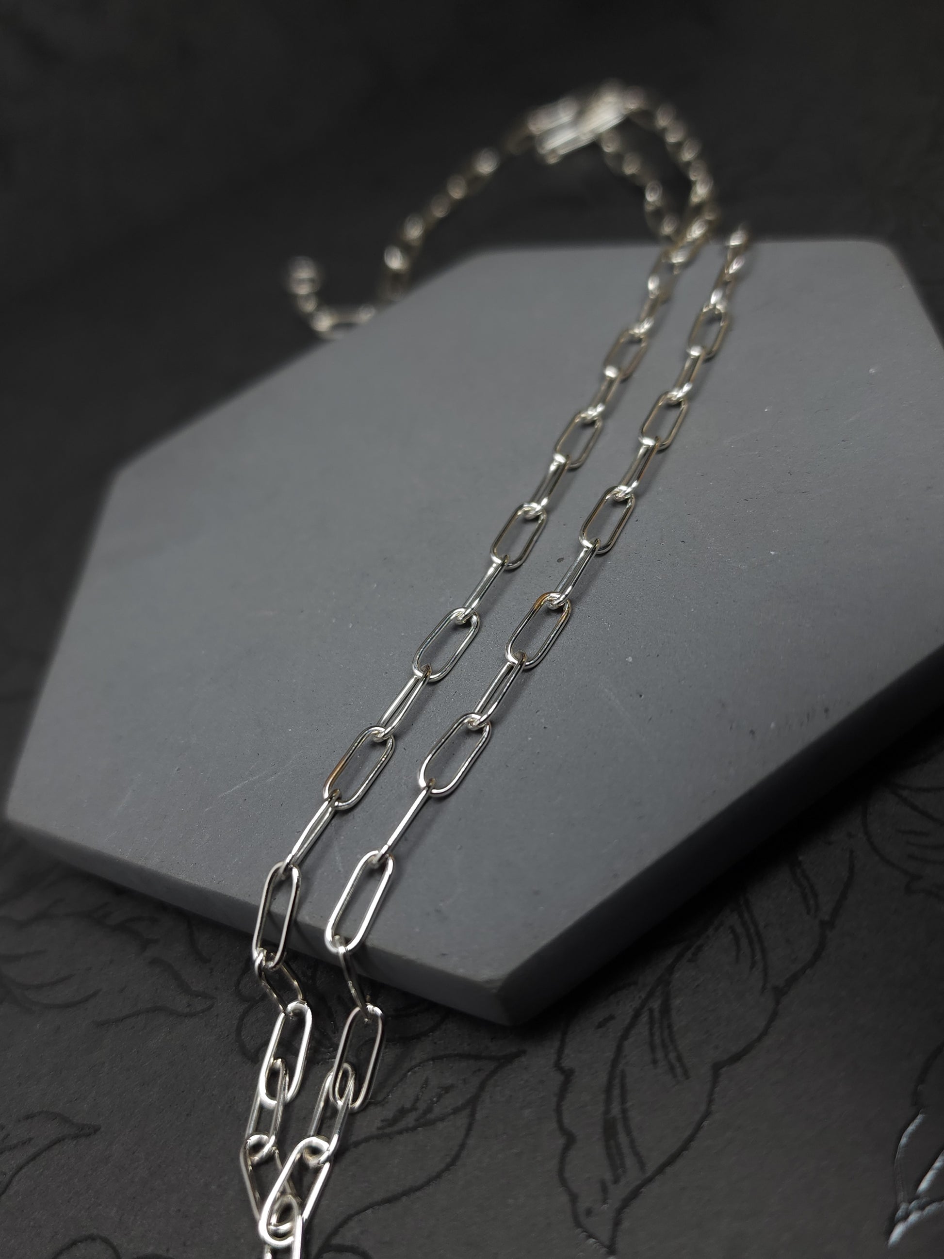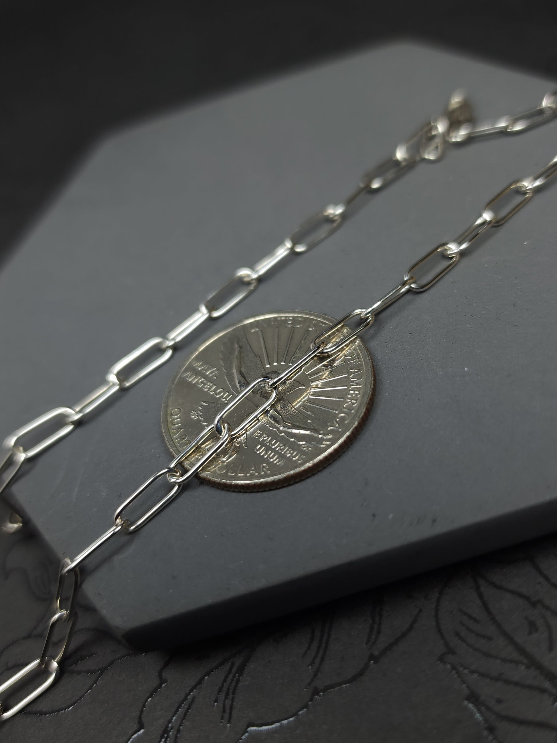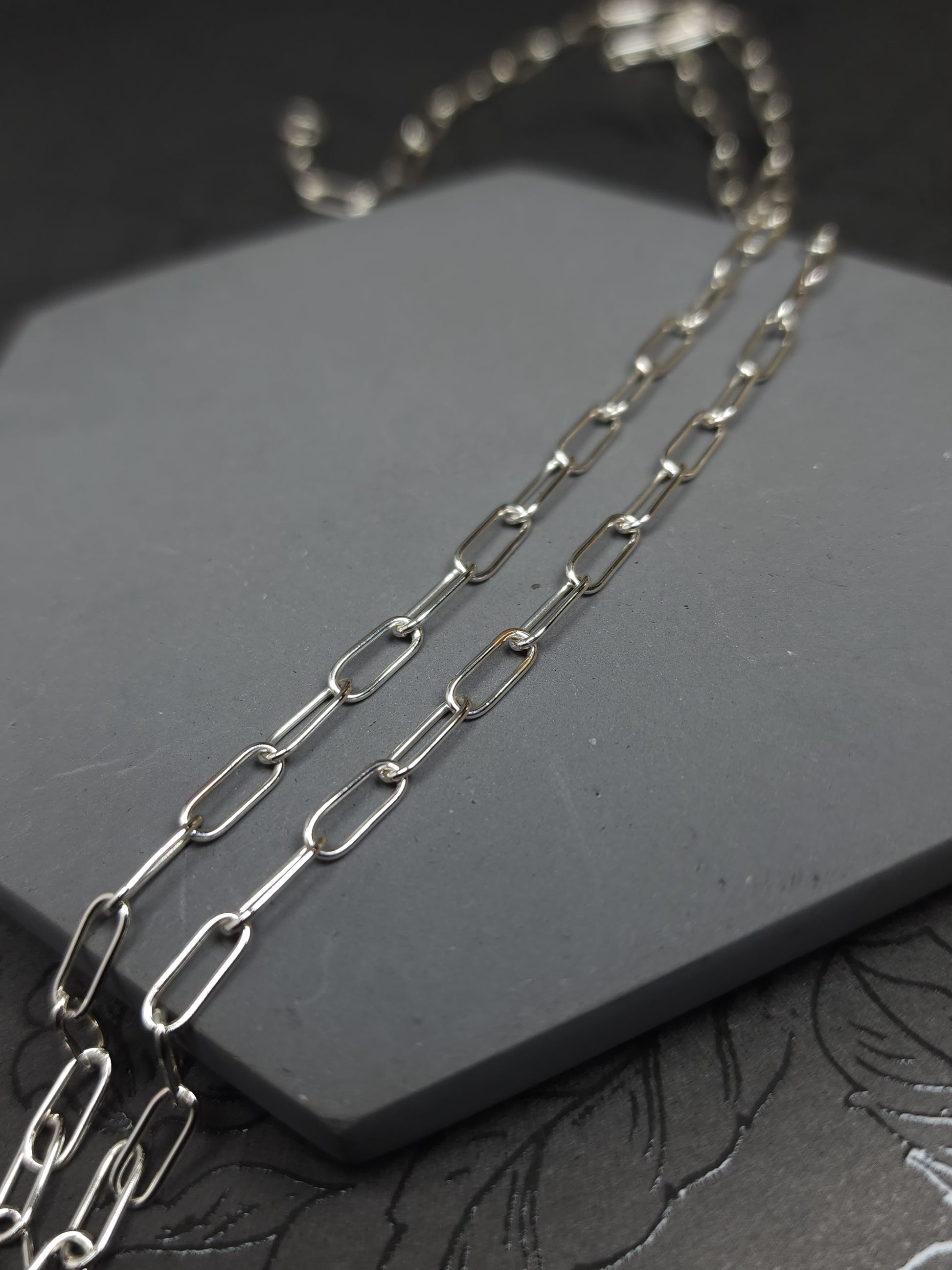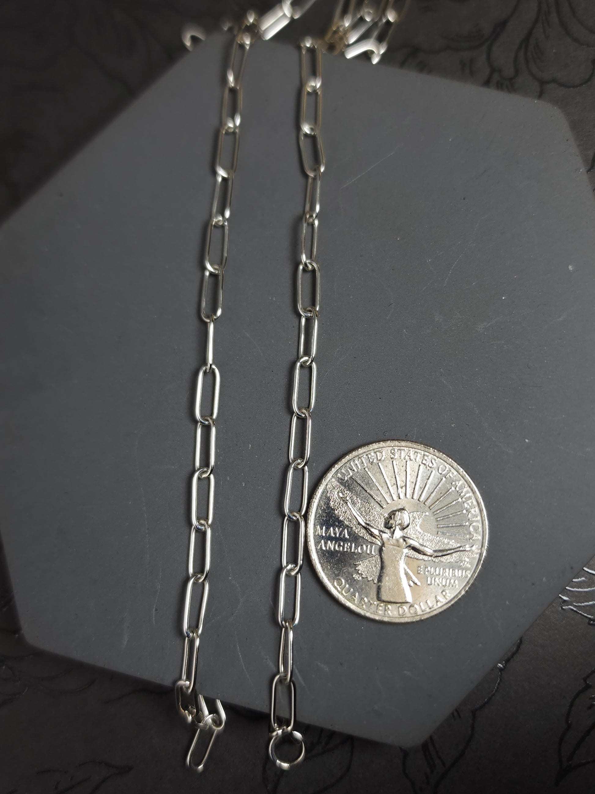 Thin paperclip sterling silver chain, oval links made with round wire and fabricated by hand using traditional silversmithing techniques. It started with 22 gauge round wire that has been formed to desired thickness and wrapped around a mandrel. After removing the coil from the mandrel, I clean it and saw though it to create individual links. Once I have all silver dust removed from all the links & cleaned up, I then assemble them one by one. When the desired length is met, each joint is individually soldered. The chain is then polished, tumbled and ready. (These are not all the steps, just the ones I think I can fit in the description 😅). The ends have round links to allow for a selection of clasps. Please remember to select a clasp you would like to go with this chain.