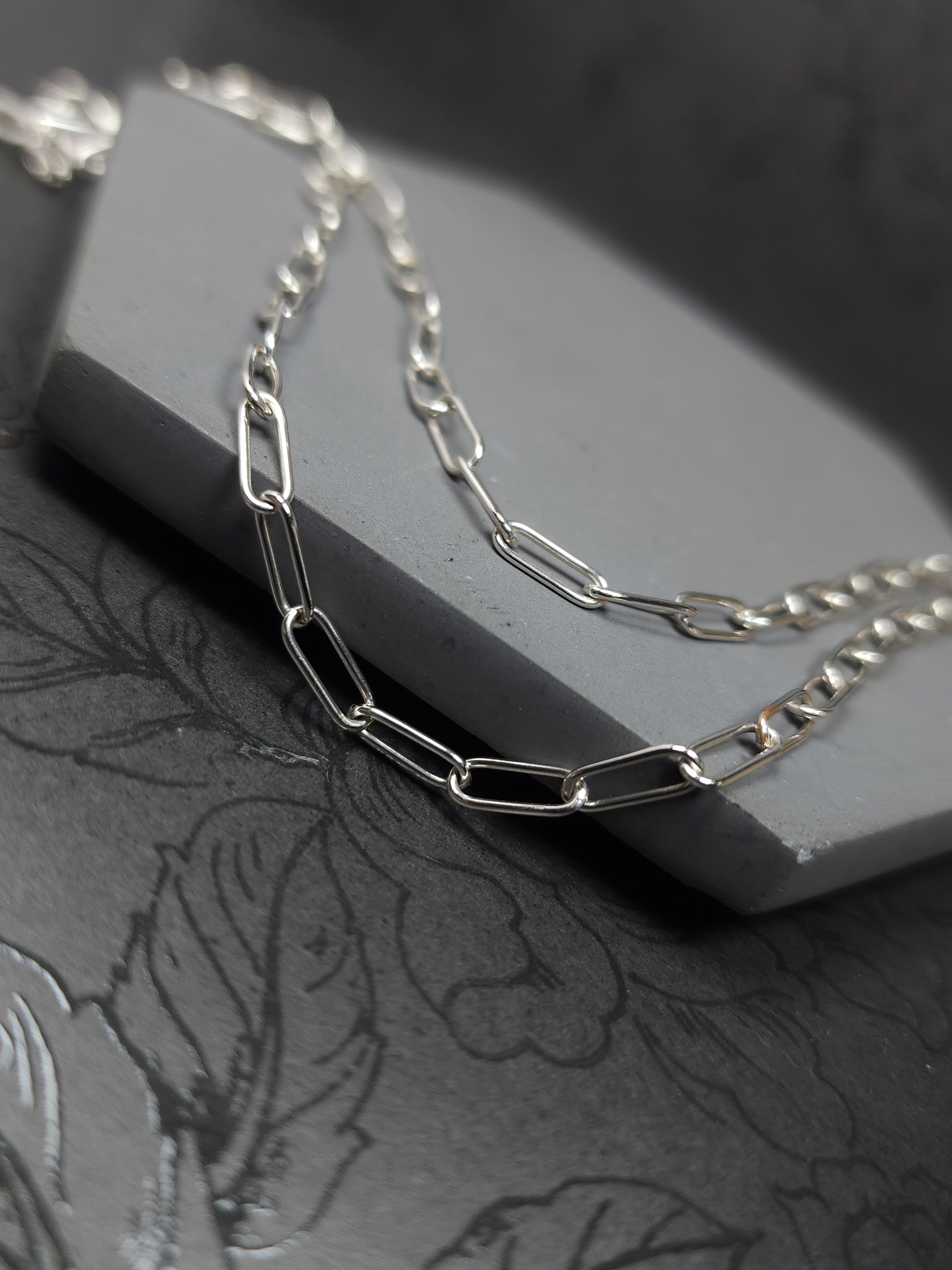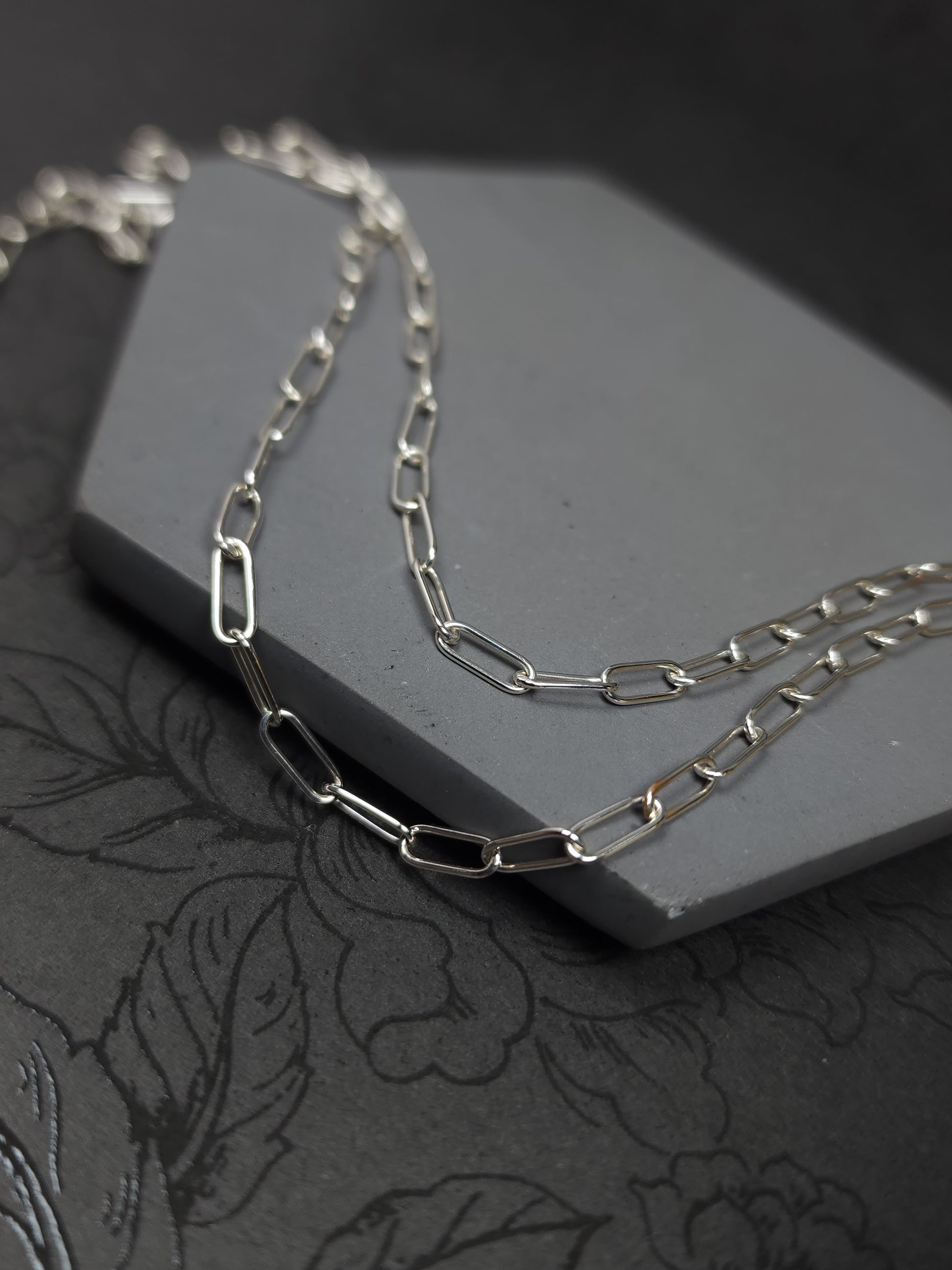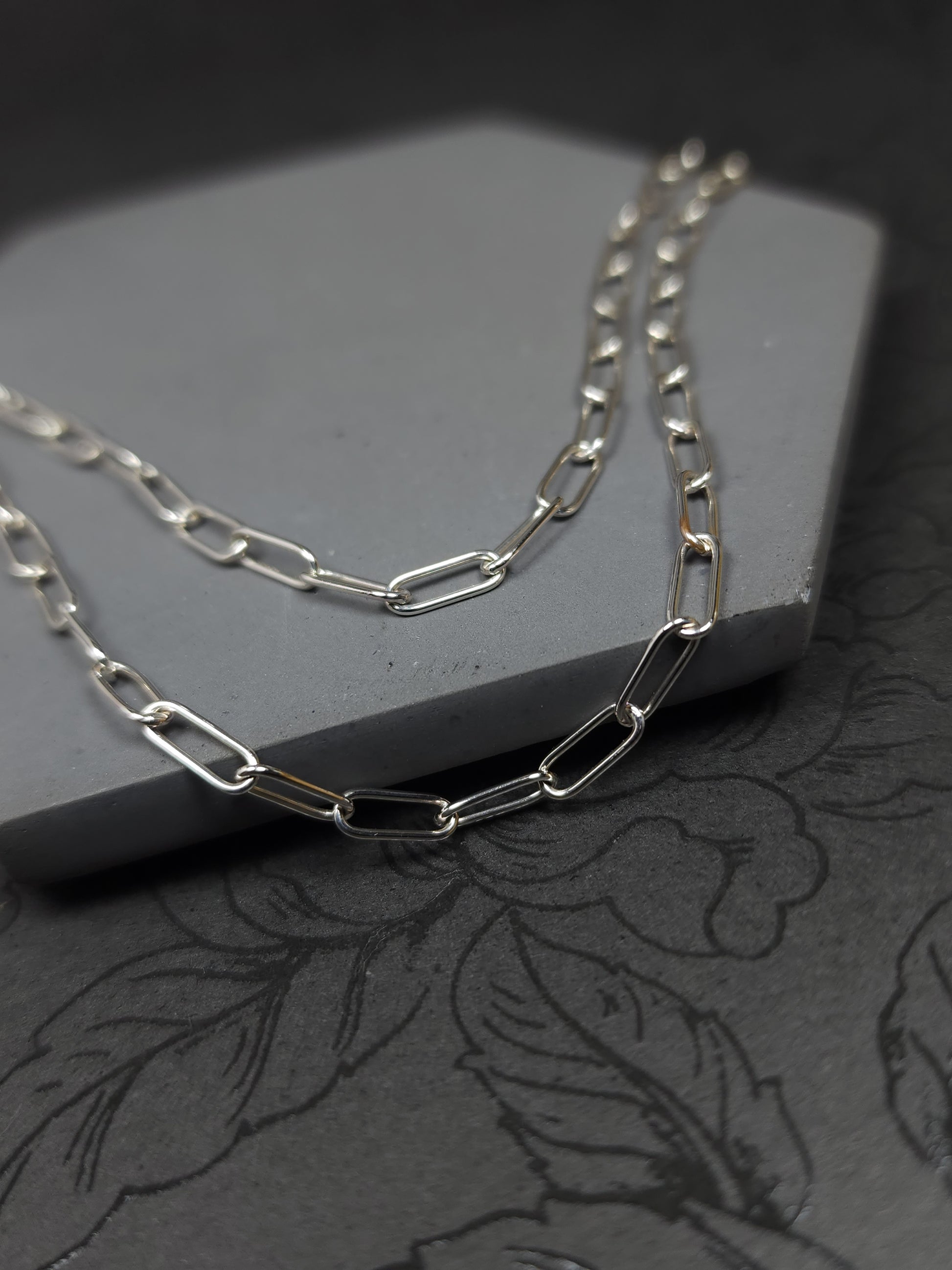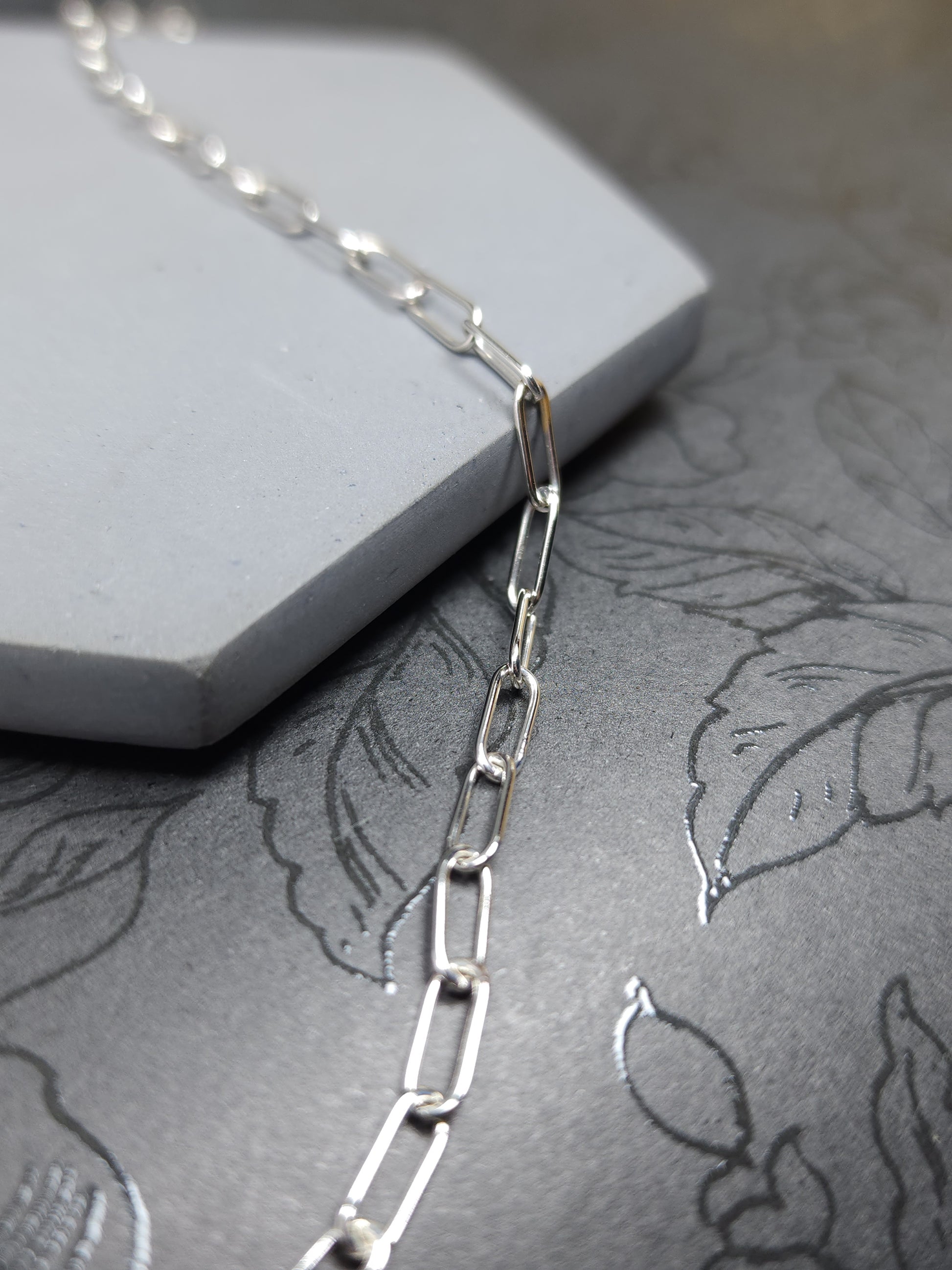Thin paperclip sterling silver chain, oval links made with round wire and fabricated by hand using traditional silversmithing techniques. It started with 22 gauge round wire that has been formed to desired thickness and wrapped around a mandrel. After removing the coil from the mandrel, I clean it and saw though it to create individual links. Once I have all silver dust removed from all the links & cleaned up, I then assemble them one by one. When the desired length is met, each joint is individually soldered. The chain is then polished, tumbled and ready. (These are not all the steps, just the ones I think I can fit in the description 😅). The ends have round links to allow for a selection of clasps. Please remember to select a clasp you would like to go with this chain.