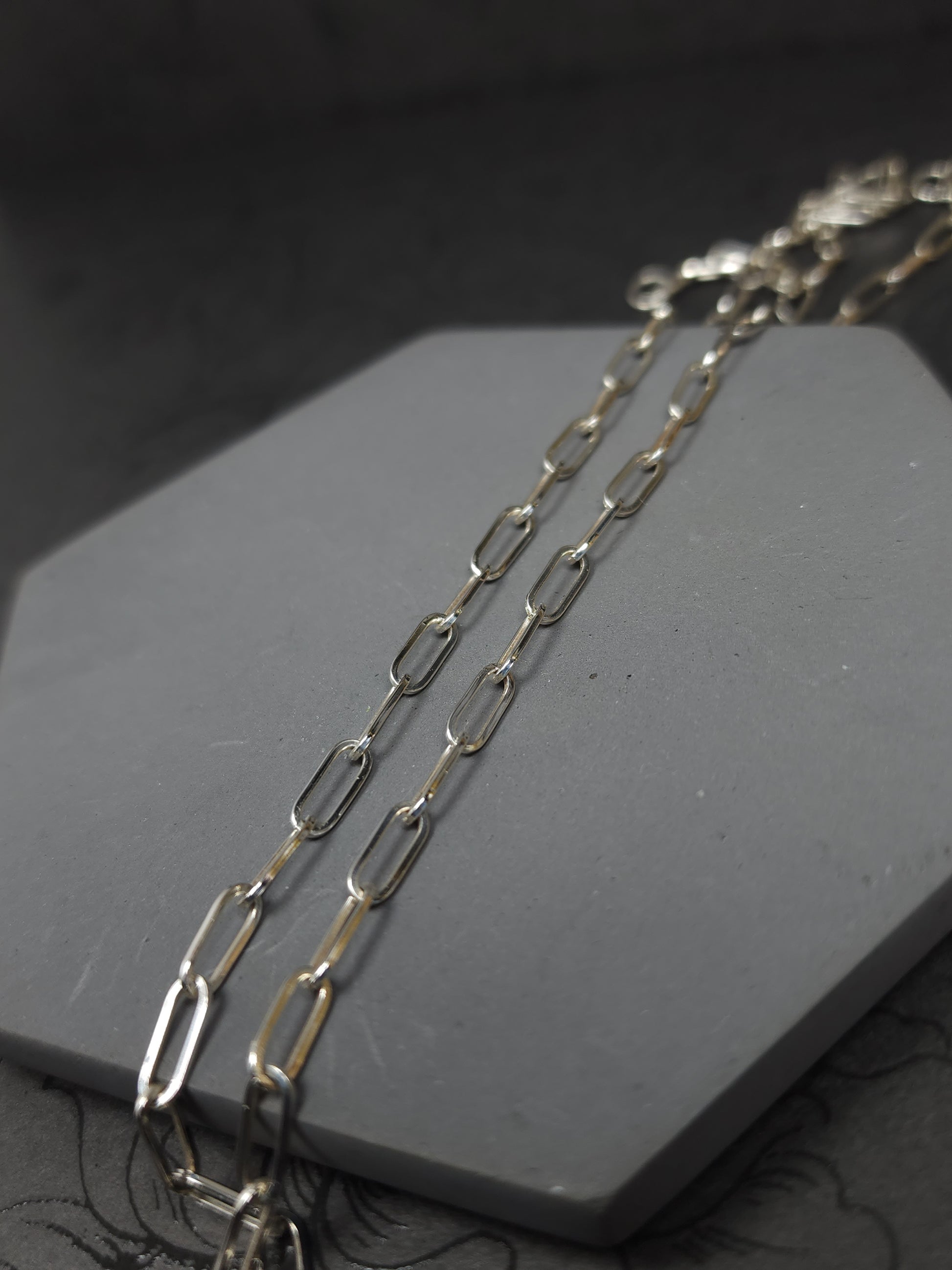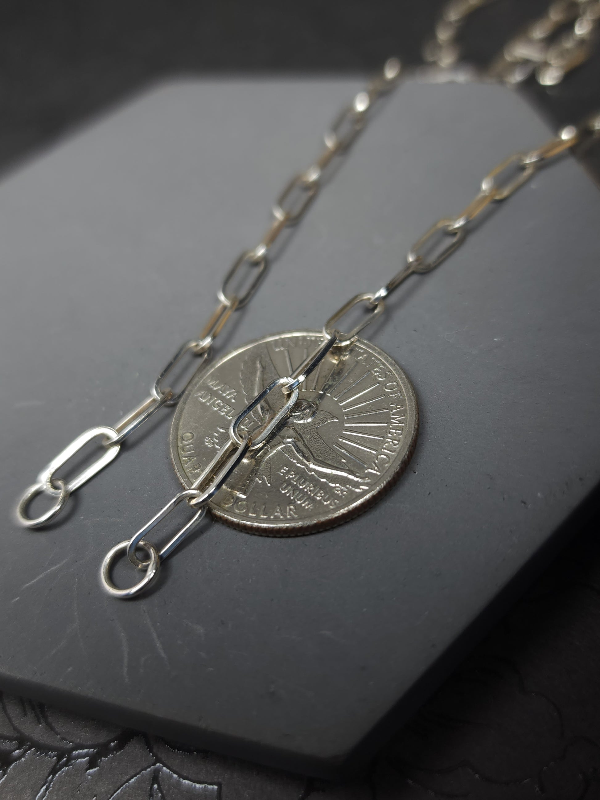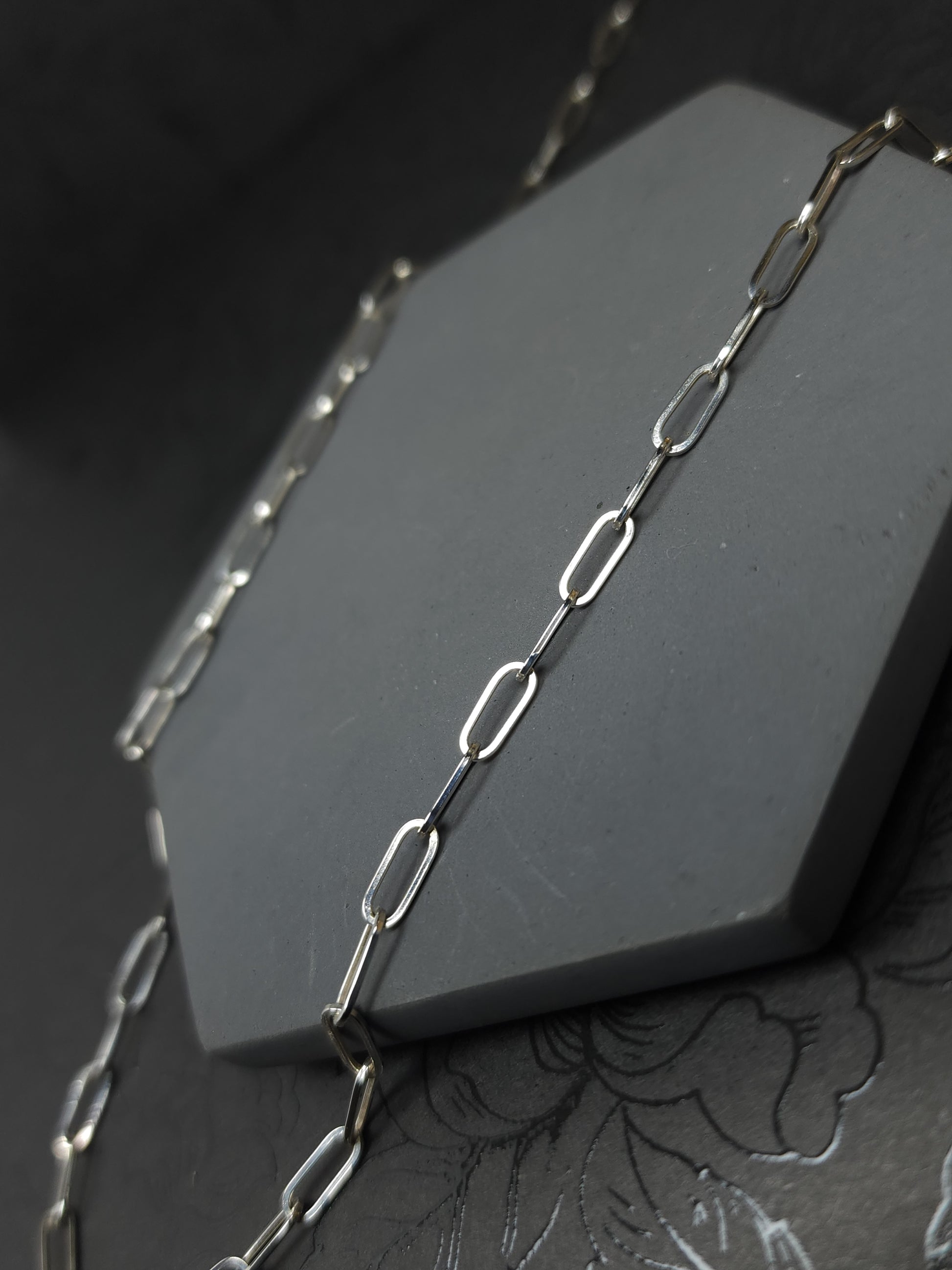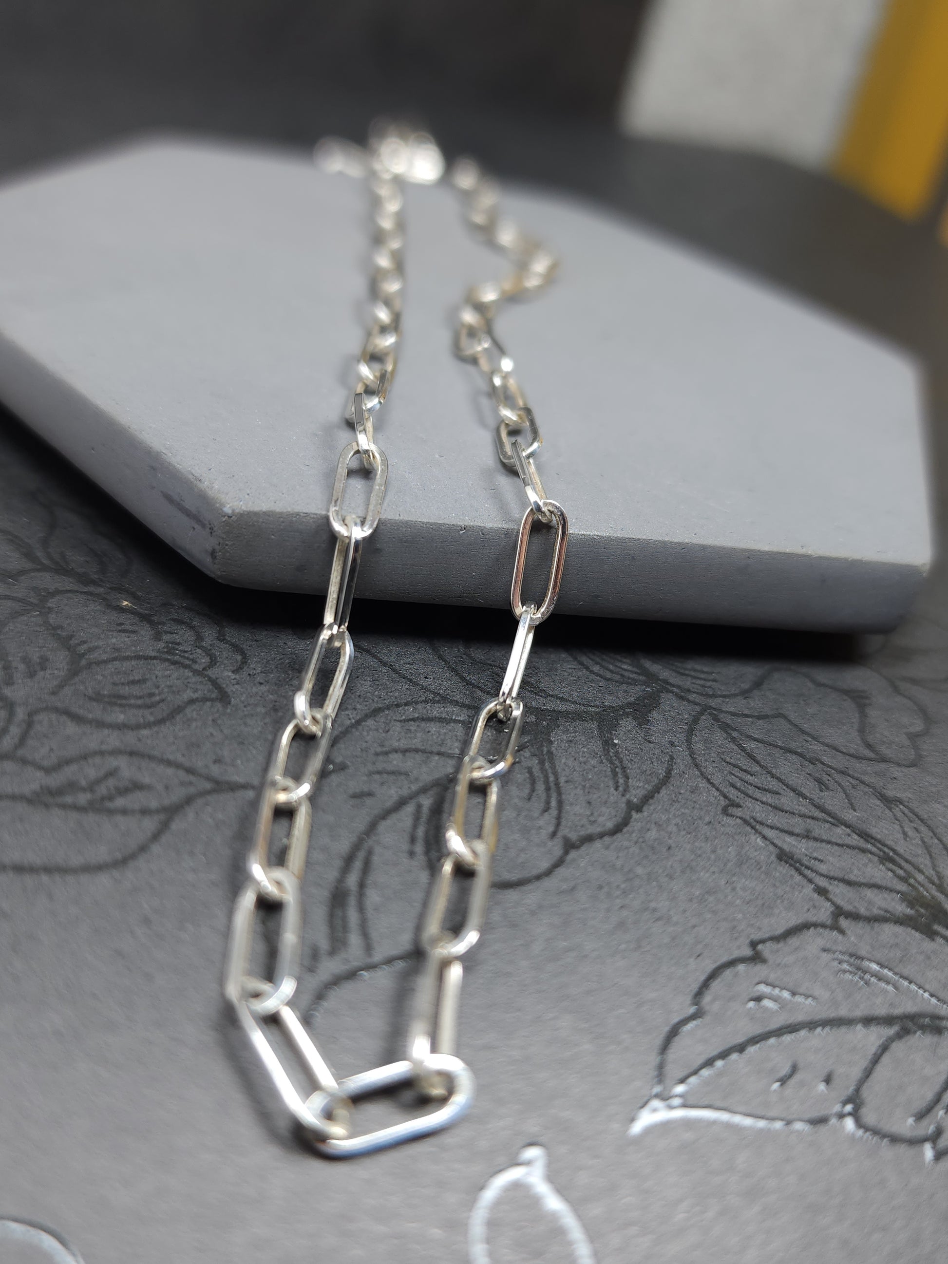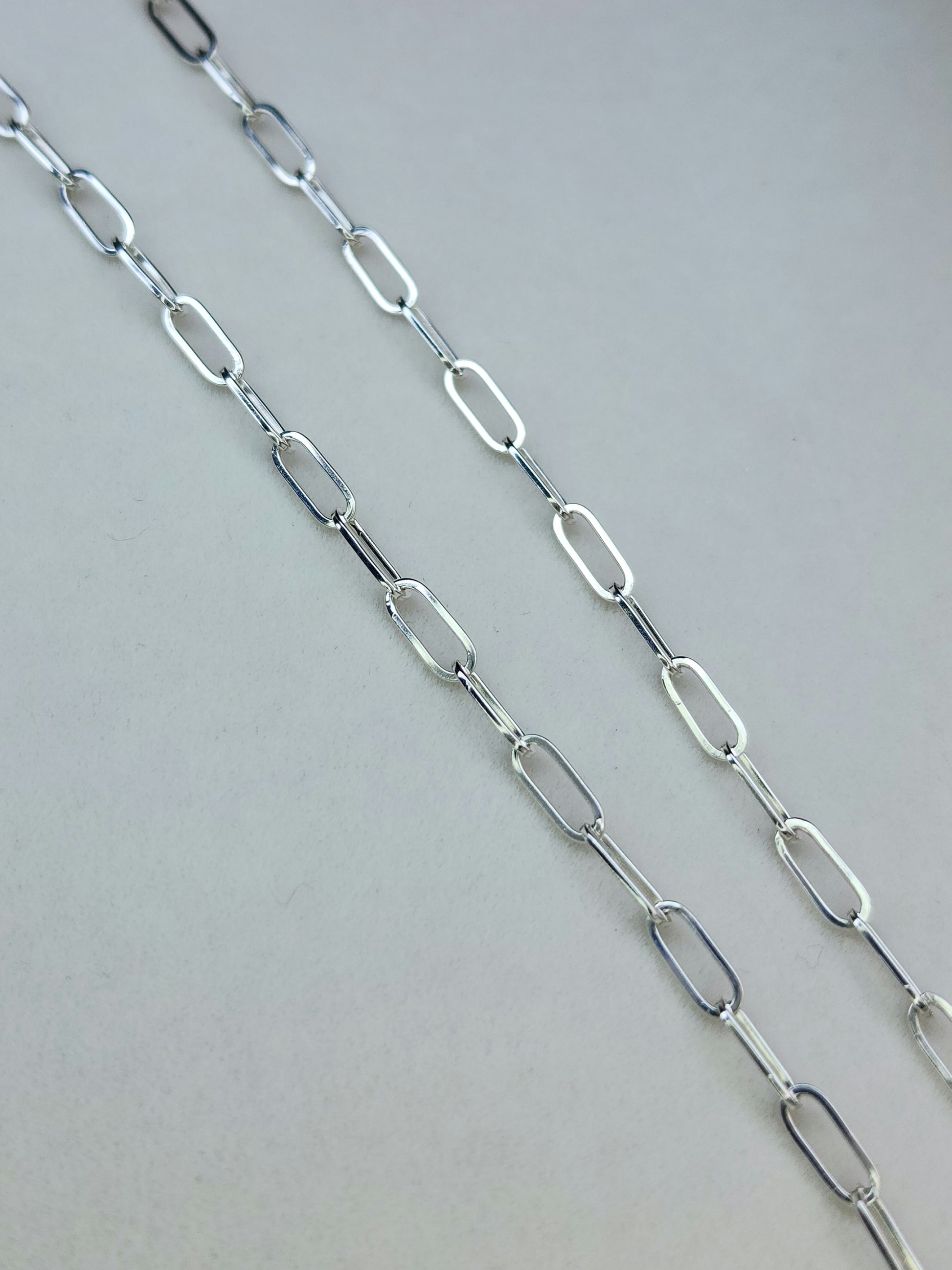 Sterling silver handmade thin paperclip chain, oval links made with square wire. I fabricated this chain by hand, using traditional silversmithing techniques. It started with 22 gauge square wire that has been formed to desired thickness and wrapped around a mandrel. After removing the coil from the mandrel, I clean it and saw though it to create individual links. Once I have all silver dust removed from all the links & cleaned up, I then assemble them one by one. When the desired length is met, each joint is individually soldered. The chain is then polished, tumbled and ready. (These are not all the steps, just the ones I think I can fit in the description 😅). The ends have round links to allow for a selection of clasps. Please remember to select a clasp you would like to go with this chain.
